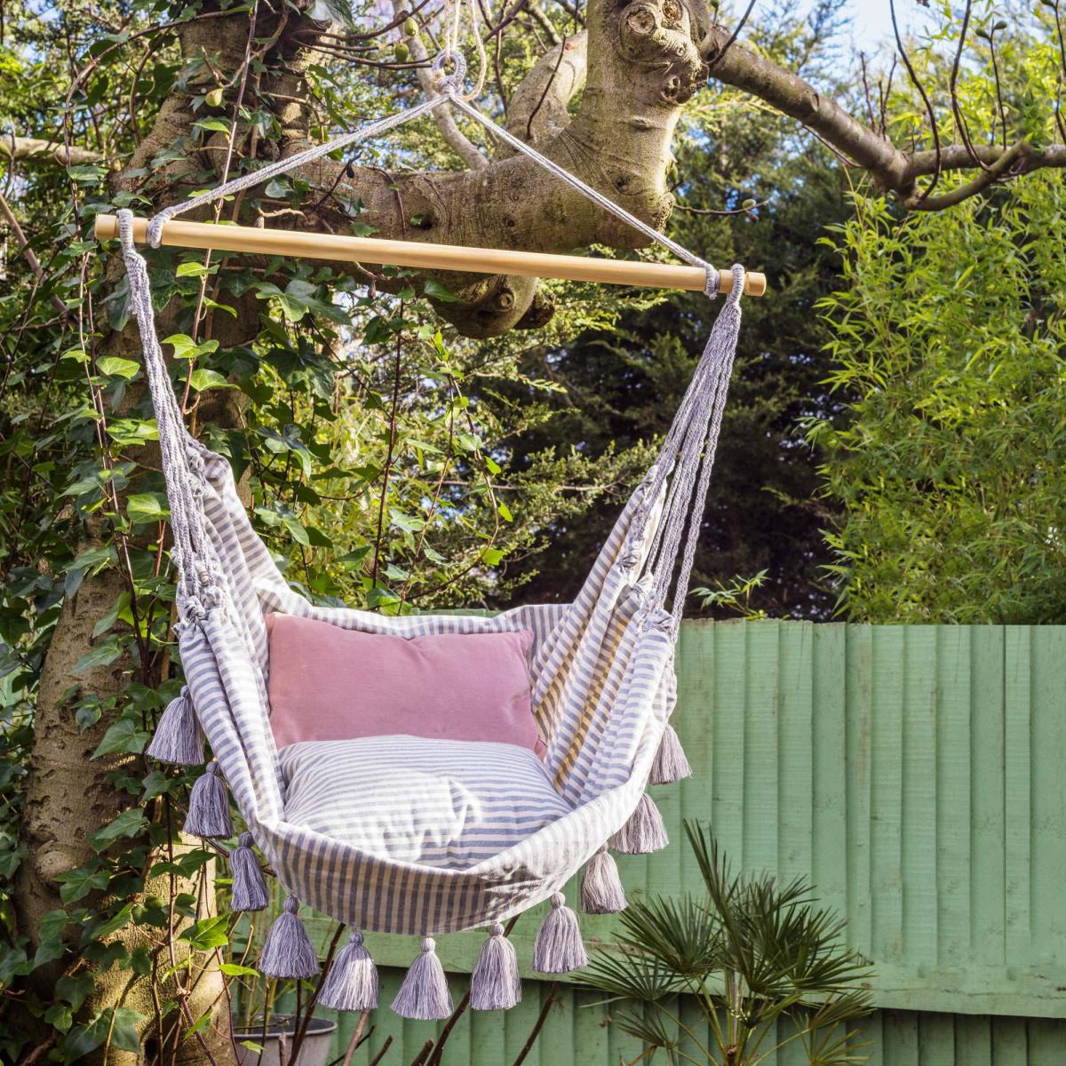 A relaxed hammock swing chair providing a cosy and peaceful space to sit and enjoy afternoons in the sun. Handcrafted in El Salvador from upcycled cotton and pine wood, this swing chair is printed with a pale denim blue stripe and comes with a comfy matching cushion. Simply hang from your sitting room ceiling or from a tree in your garden.