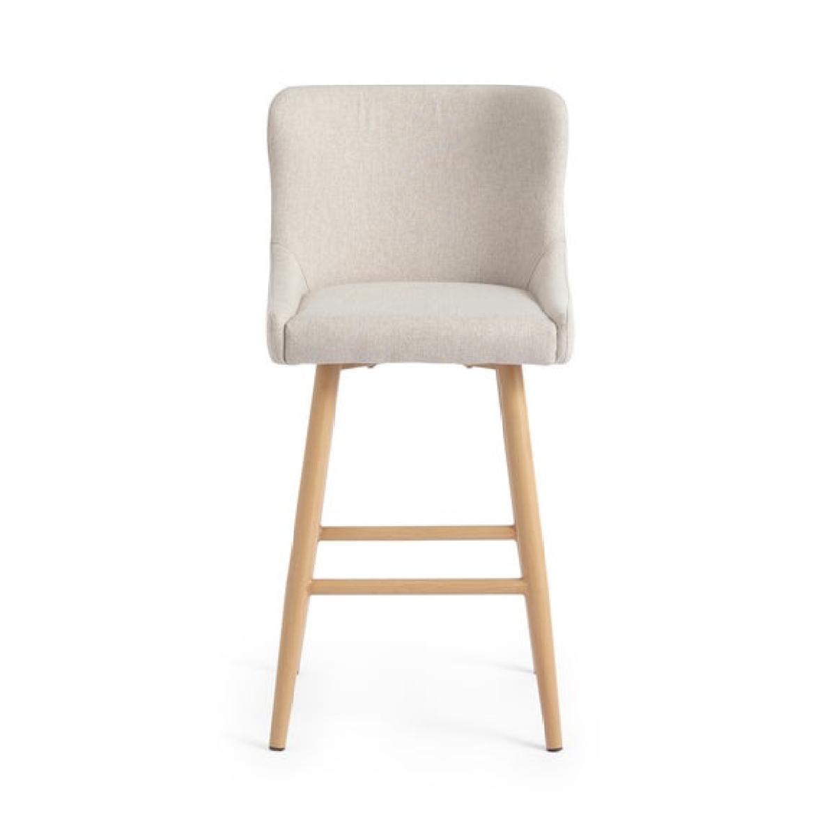 * Counter height stool * Soft fabric upholstery * Modern metal legs * Timeless design * Part assembly required Embrace classic elegance with this Montreal bar stool, The natural tones of the super soft fabric upholstery, combined with wood effect legs, create a warm and inviting ambiance in your home. Designed at counter height, this bar stool ensures optimal comfort for your bar or kitchen island seating. The curved backrest adds a touch of sophistication while providing ample lumbar support during long gatherings. This bar stool not only boasts an attractive appearance but also delivers durability and stability through its wooden legs.