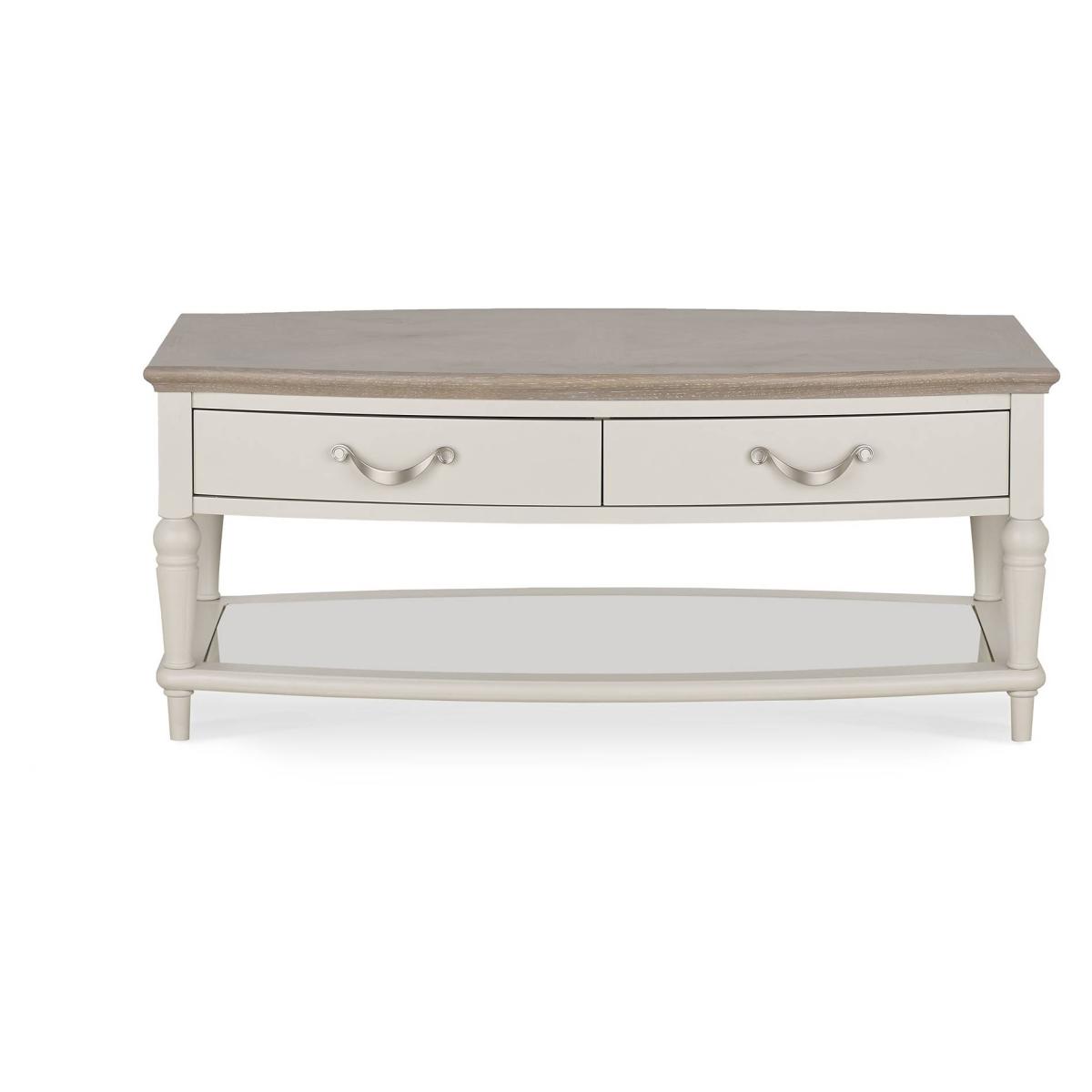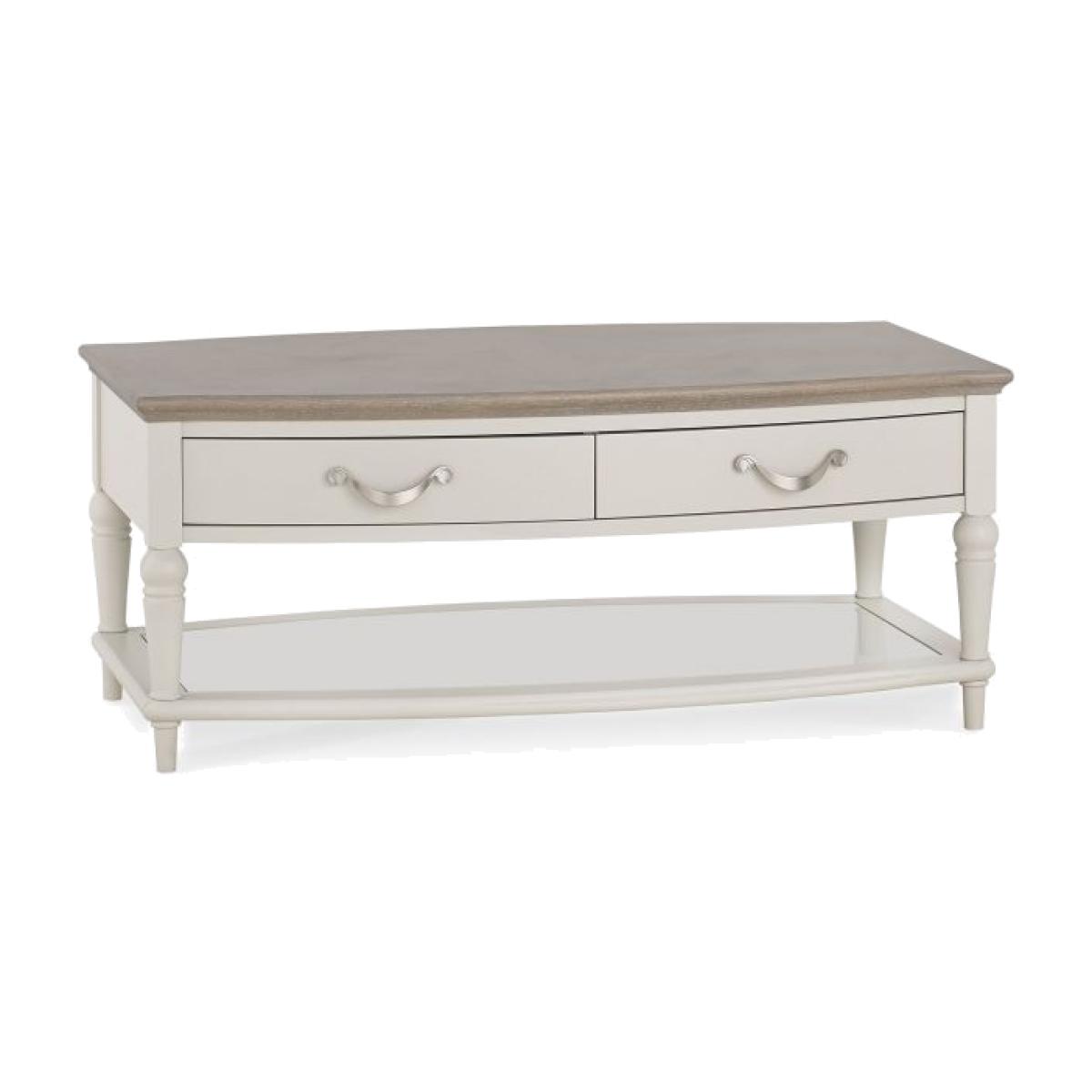 Supplied as an attractive two tone colour combination with a muted grey surround and light wood top, this handy 2 drawer coffee table also features a shelf underneath thats great for holding books and magazines. Partial assembly required Dimensions: 108cm W x 64cm D x 46cm H