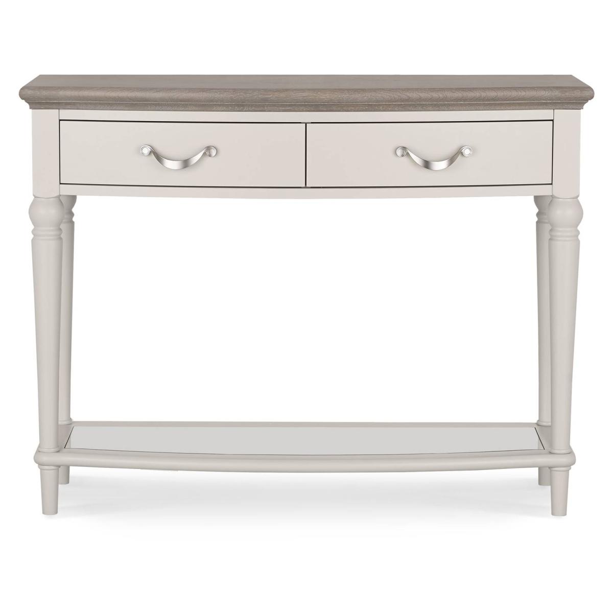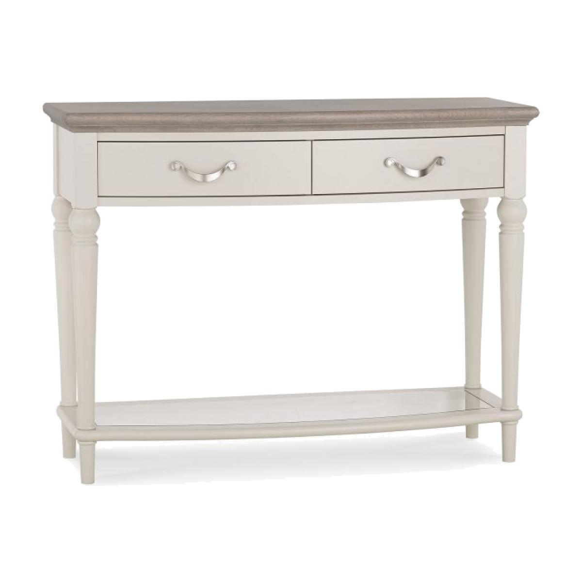 Finished with a beautiful muted grey paintwork with a wonderfully contrasting light wood top, this handy 2 drawer console table will look great in the hallway, lounge, dining room or conservatory. There is also a handy shelf beneath thats great for displaying items or perhaps placing shoes out of harms way in a busy hall. Dimensions: 110cm  W x 45cm D x 84cm H Partial assembly required All screens vary in colour reproduction and whilst every effort has been made to display the colour as accurately as possible it is for guidance only.