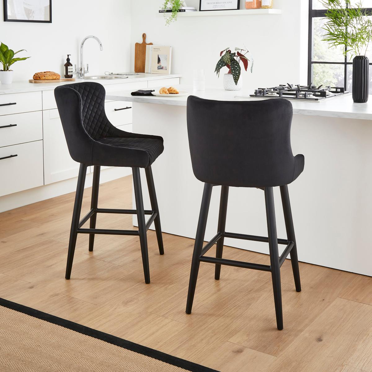 I’m a fan of this black velvet bar stool for its clean lines and quilted backrest, which bring just the right amount of texture without overwhelming a space. The slim, dark legs keep the look light and work brilliantly in modern or Scandi-inspired kitchens as well as more industrial loft settings. For styling, pair it with a marble-effect worktop and warm brass accents to lift the deep upholstery, or introduce soft linen cushions in muted tones for a cosy contrast. Its counter-height frame makes it ideal for breakfast bars and island units, while the slight scoop of the seat offers practical everyday comfort.