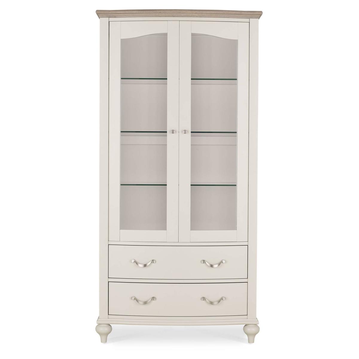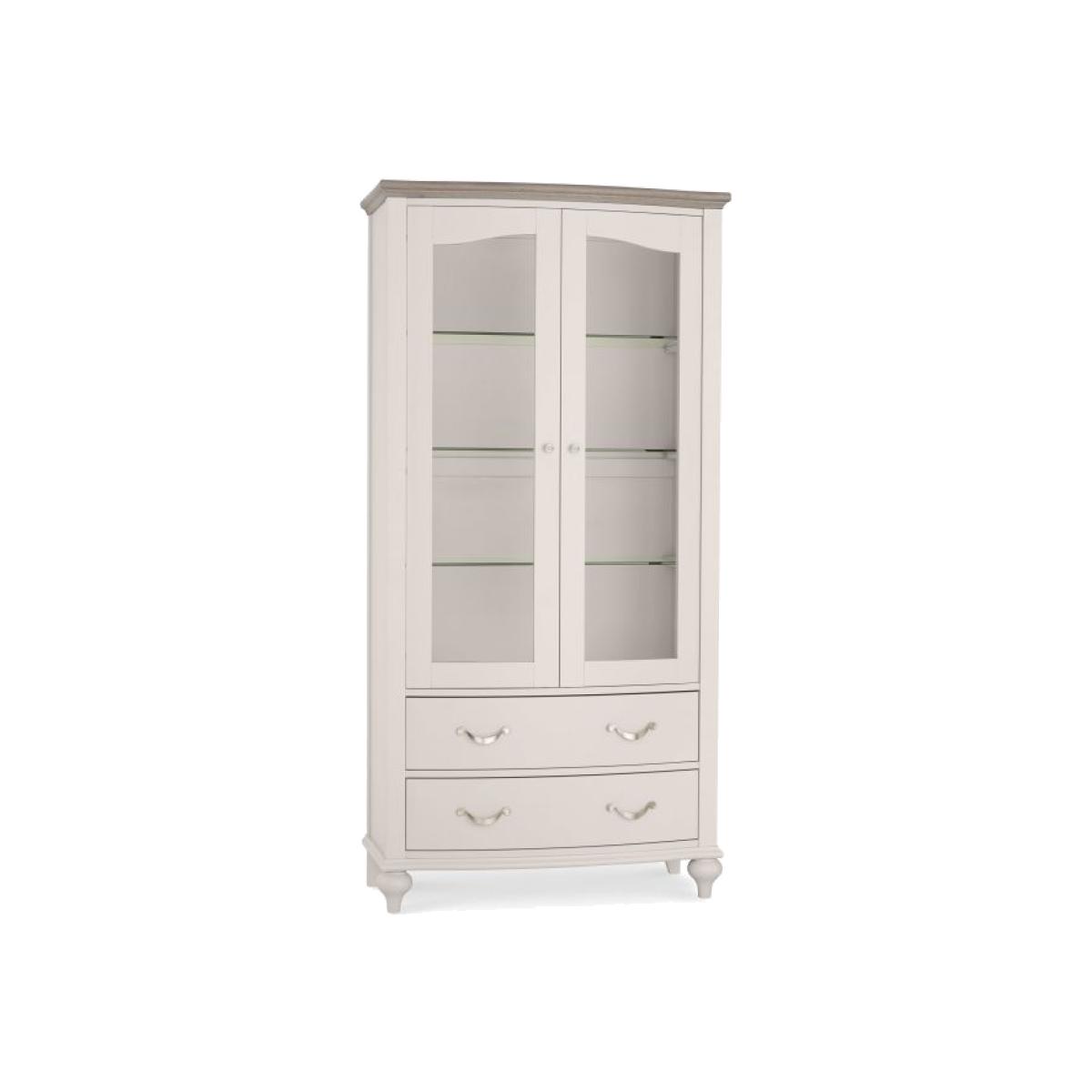 This beautiful glazed display cabinet with a muted grey surround and wonderfully contrasting light wood top will look great in both traditional or contemporary dining rooms or dining kitchens. With 4 shelves to display your treasured china or glassware, there is also 2 handy drawers beneath. Dimensions: 100cm W x 47cm D x 201cm H Partial assembly required All screens vary in colour reproduction and whilst every effort has been made to display the colour as accurately as possible it is for guidance only.