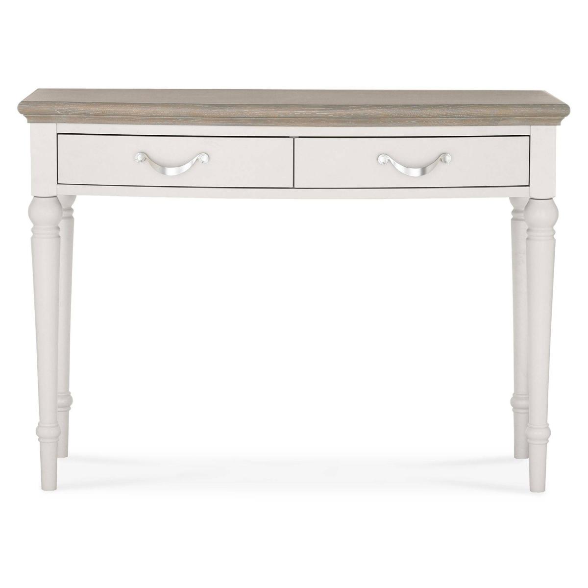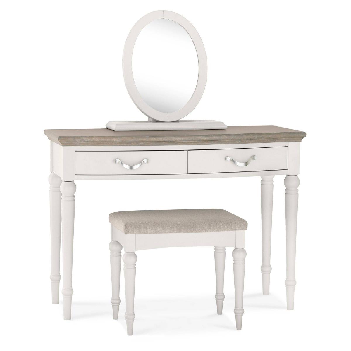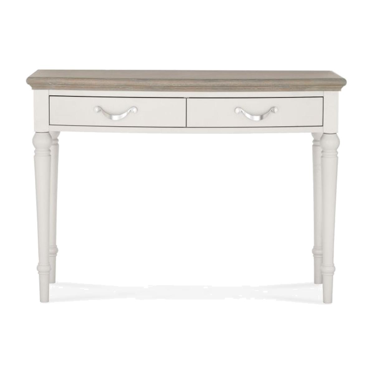 With a contemporary twist to a traditional design, Montreal is a beautifully crafted range with bold, contrasting bespoke silver handles. Design features such as gently bowed fronts, classical corniced tops and turned legs demonstrate attention to detail, whereas practical Blum soft-closing drawer runners, high quality hardware and a durable protective finish all attest to the quality of this elegant range. Centre piece of this collection is the king size upholstered bedstead with stunning diamond stitch patter and refined curved frames, granting Montreal bedroom as updated classic suited to both modern and traditional settings. Please note, this is the Dressing Table only, the Vanity Mirror pictured can be purchased here and the Stool pictured can be purchased here. Finish - Grey Washed Oak & Soft Grey Made from - Ash Solid/Oak Veneer in Grey Wash & Solid Beech/MDF in Soft Grey Satin Finish Handles Soft Close Drawers x 2 Assembly required 2 Year Guarantee D: 49cm x W: 110cm x H: 80cm