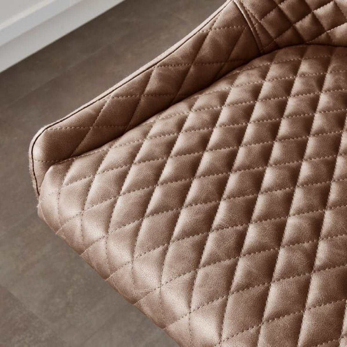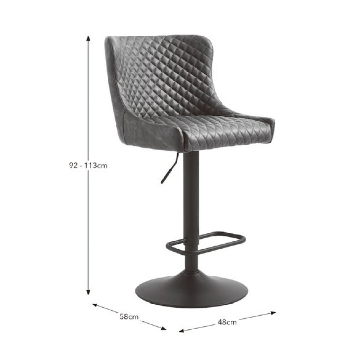 * Height adjustable bar stool * Metal swivel base * Quilted upholstery The Montreal barstool is a stylish blend of classic comfort and modern industrial design. Upholstered in easy-care PU leather, it features a diamond quilted seat with gently sloped arms for added support. The powder-coated metal frame includes a crossbar footrest and a smooth swivel base, offering both stability and flexibility. With a gas-lift mechanism for adjustable height and a seat height of 67cm, it’s ideal for kitchen islands or breakfast bars.