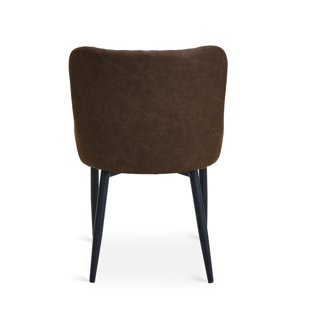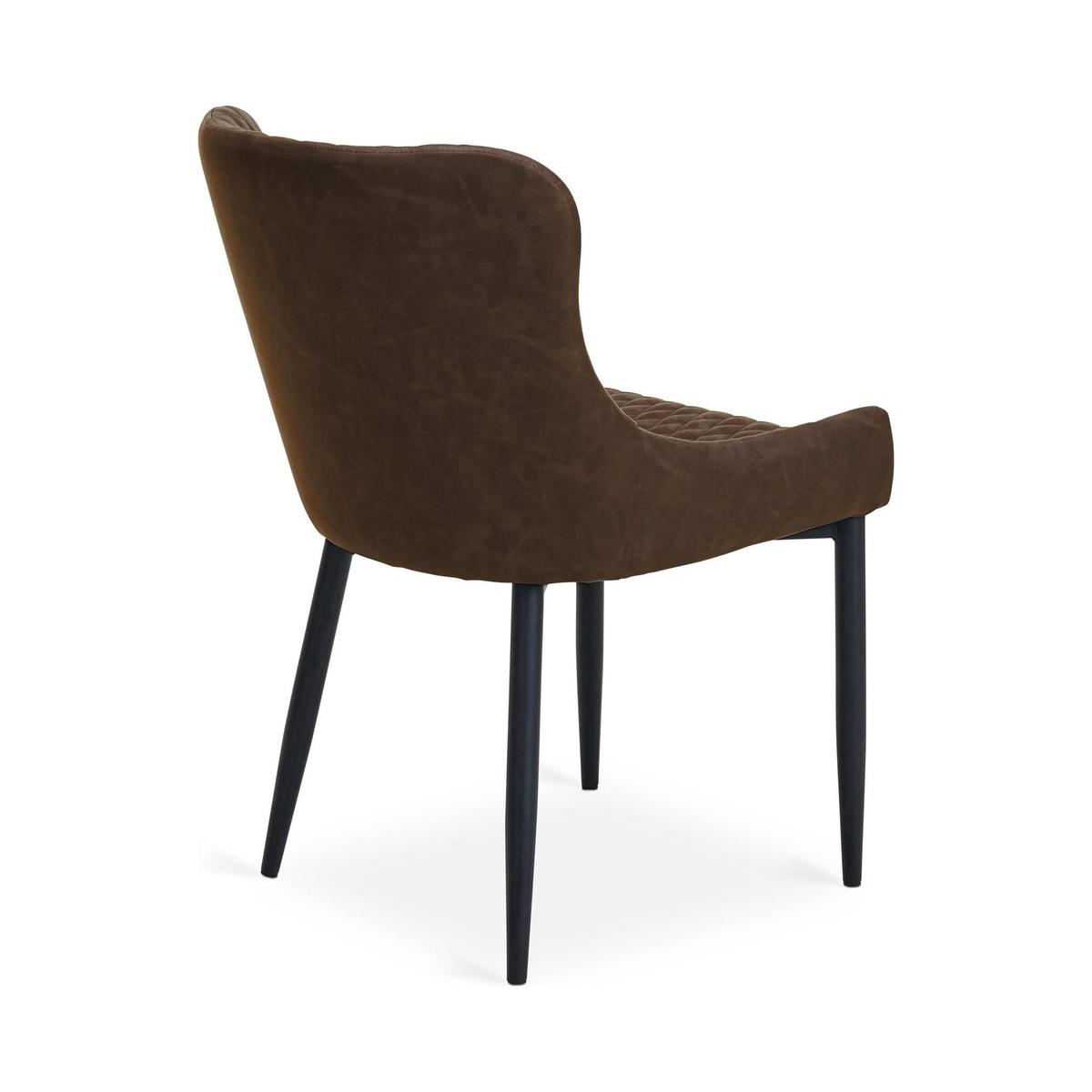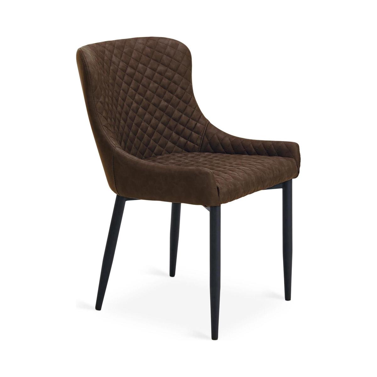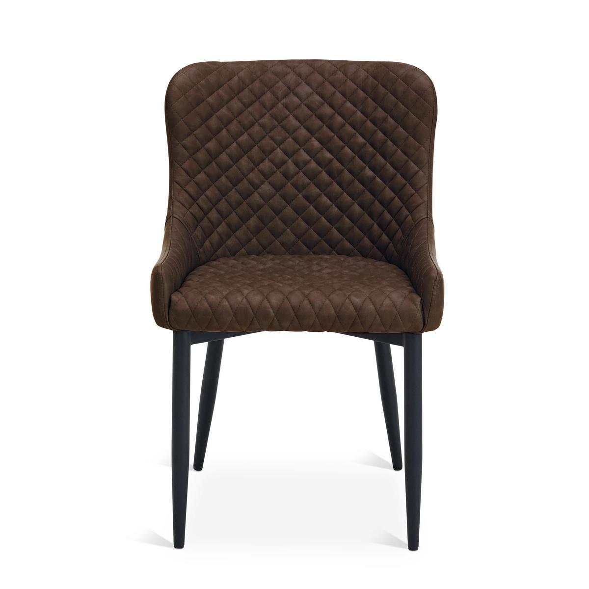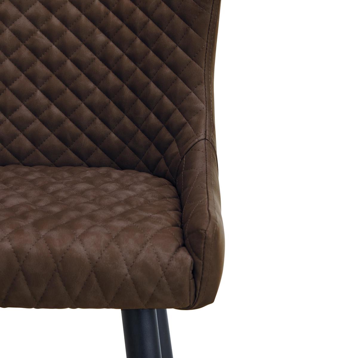 Featuring a classic styling with a modern industrial twist, the Montreal dining chairs are constructed from an easy to care for PU leather and a sturdy powder coated metal frame. This gorgeous chair also features a stunning diamond quilted design, complemented by the gentle sloped arms and finished in a stylish brown colourway.\n\nSeat Height: 48cm\nSeat Depth: 46cm
