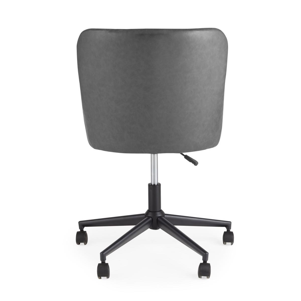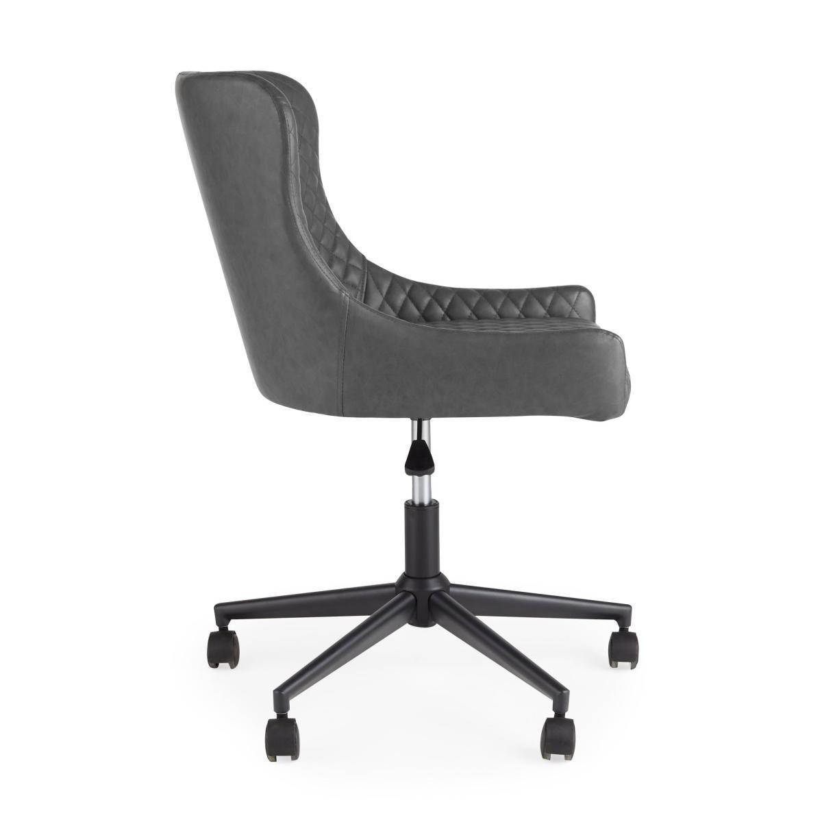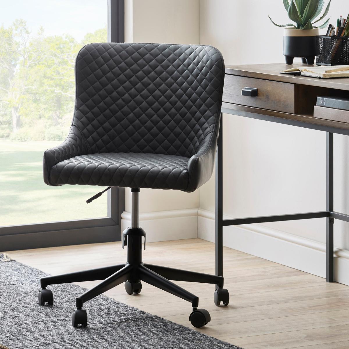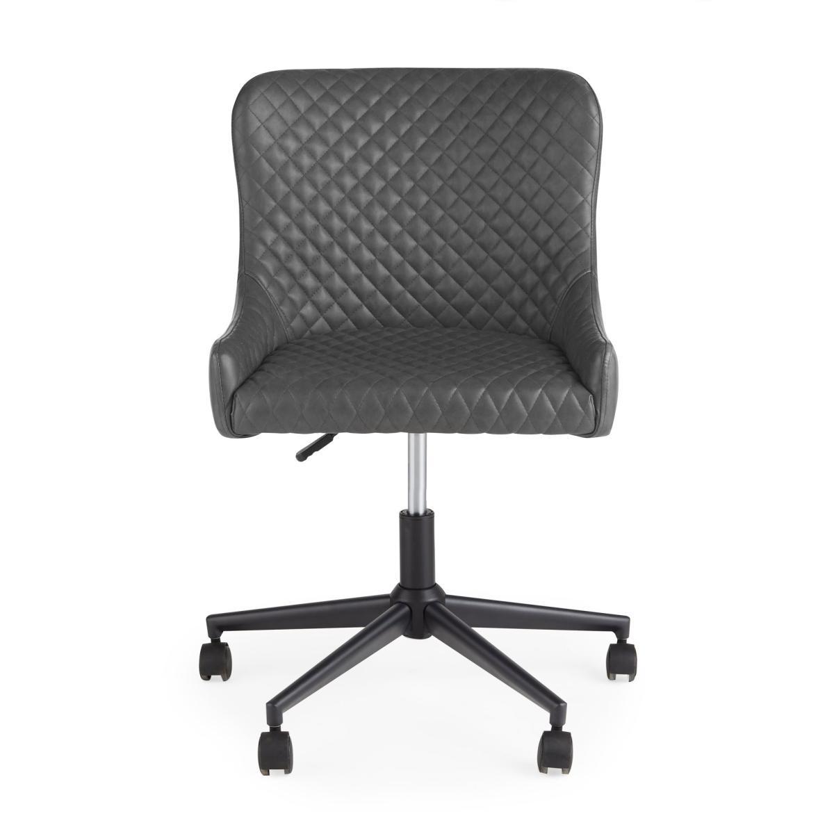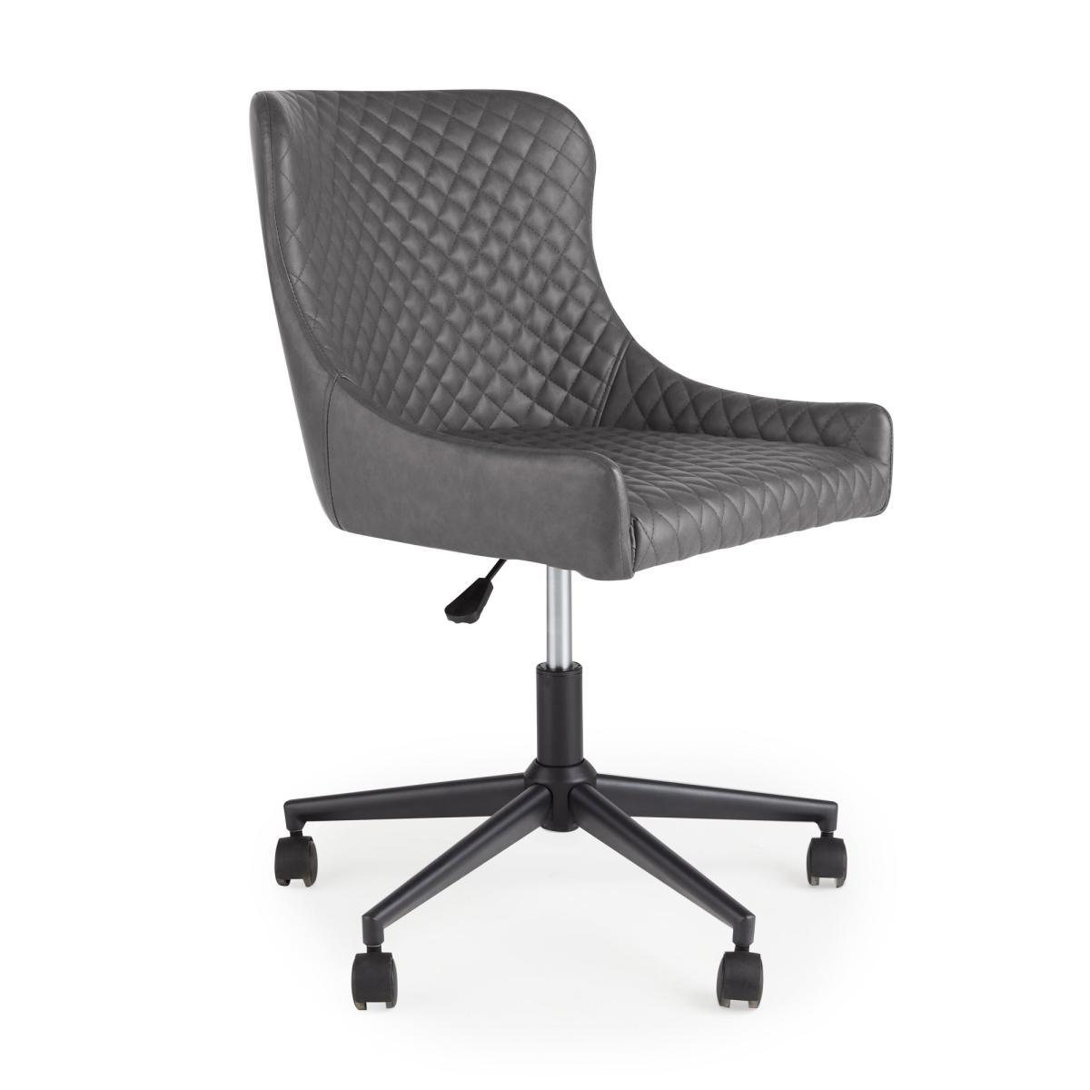 Featuring classic styling with a modern industrial twist, the Montreal office chair is constructed from an easy to care for PU leather and a sturdy powder-coated metal frame. This gorgeous office chair features a stunning diamond quilted design, complemented by the gentle sloped arms and finished in a stylish Grey colourway. This chair comes equipped with a height adjustable gas lift mechanism on a wheeled swivel base. Care instructions: Keep fabric out of direct sunlight.