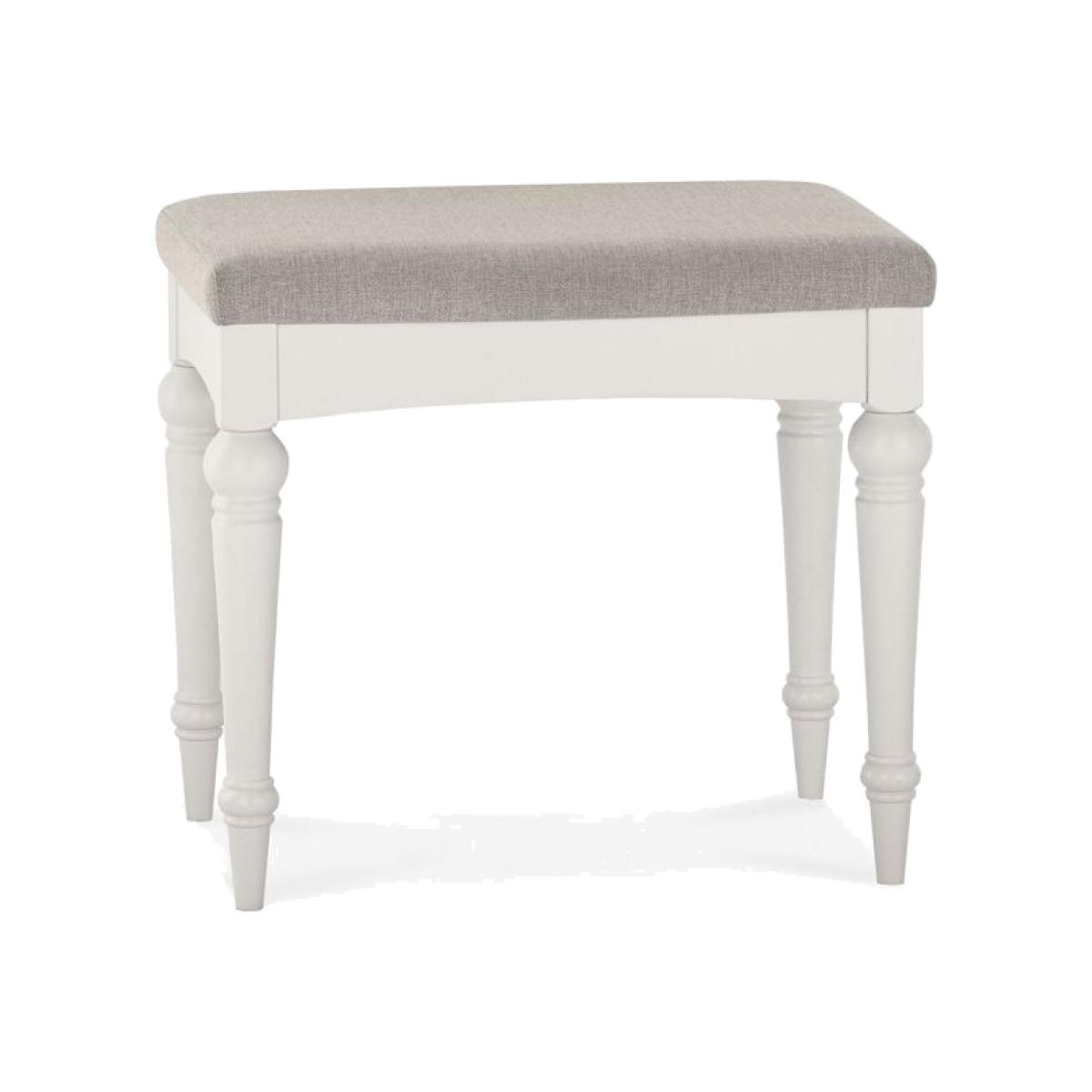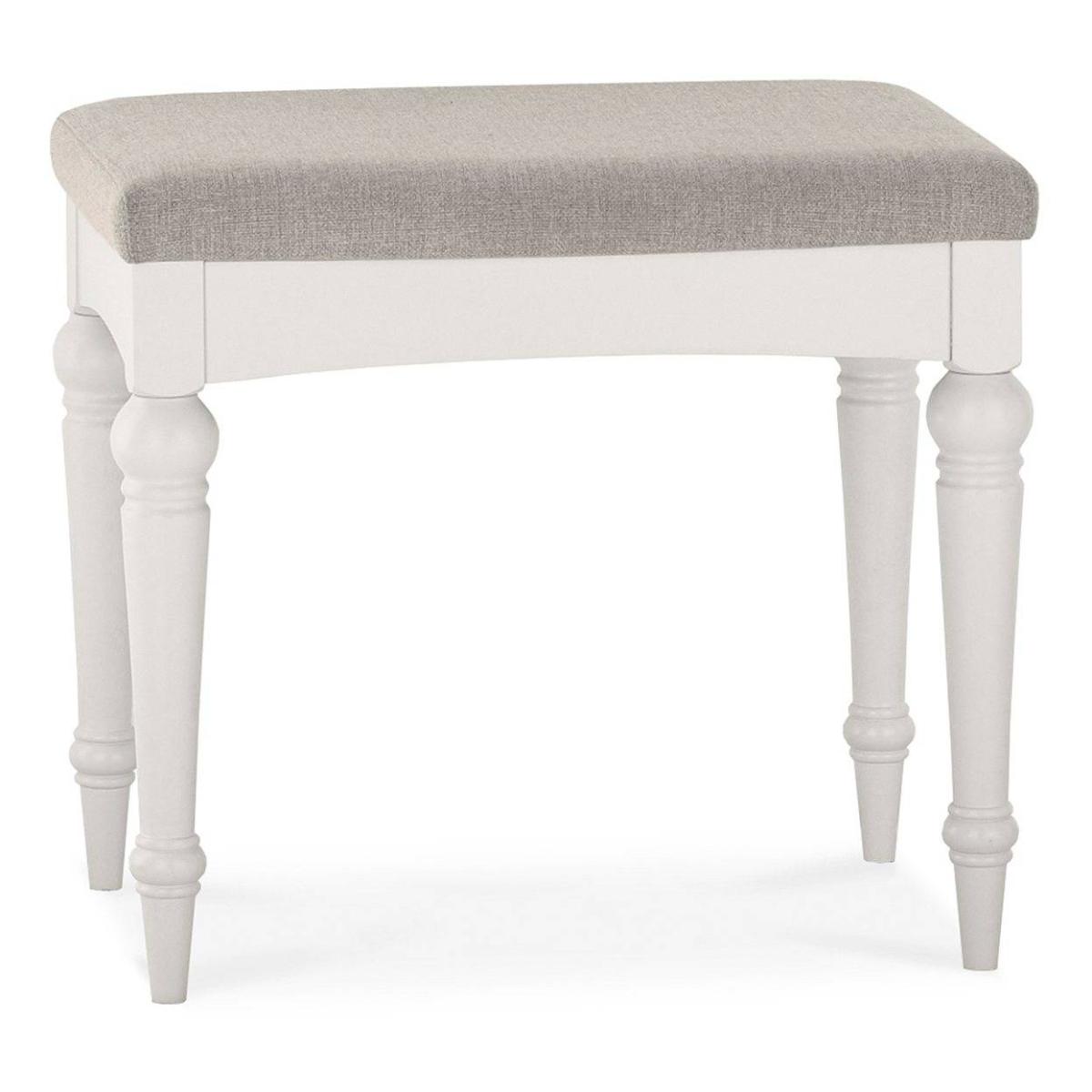 With a contemporary twist to a traditional design, Montreal is a beautifully crafted range with bold, contrasting bespoke silver handles. Design features such as gently bowed fronts, classical corniced tops and turned legs demonstrate attention to detail, whereas practical Blum soft-closing drawer runners, high quality hardware and a durable protective finish all attest to the quality of this elegant range. Centre piece of this collection is the king size upholstered bedstead with stunning diamond stitch patter and refined curved frames, granting Montreal bedroom as updated classic suited to both modern and traditional settings. Please note, this is the Stool only, the Vanity Mirror pictured can be purchased here and the Dressing Table pictured can be purchased here. Finish - Soft Grey Made from - Ash Solid & MDF painted Pebble Grey Fabric - 100% Polyester Assembly required 2 Year Guarantee D: 40cm x W: 53cm x H: 47cm All screens vary in colour reproduction and whilst every effort has been made to display the colour as accurately as possible it is for guidance only.