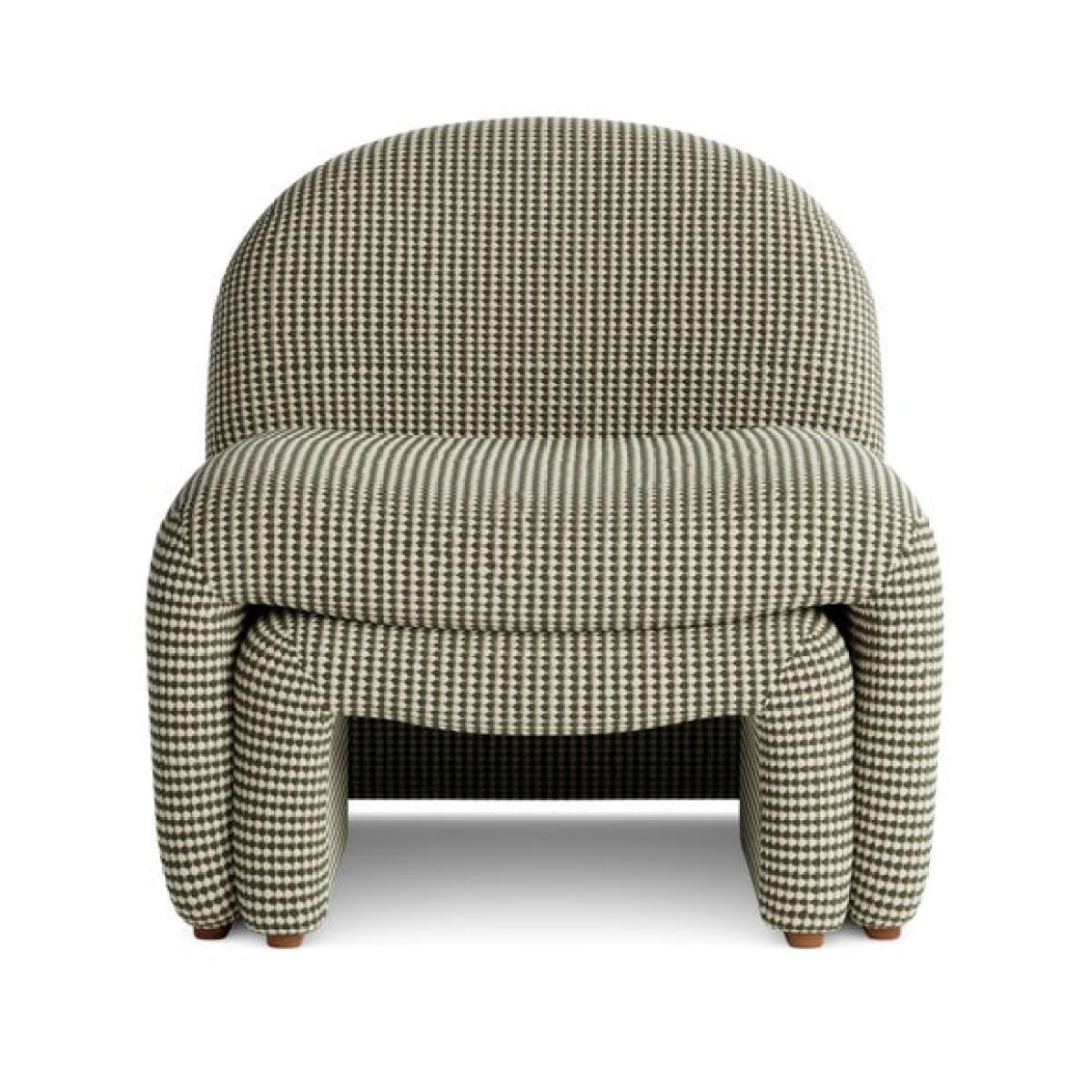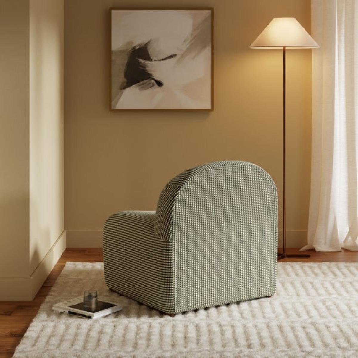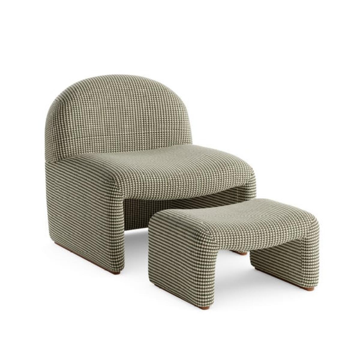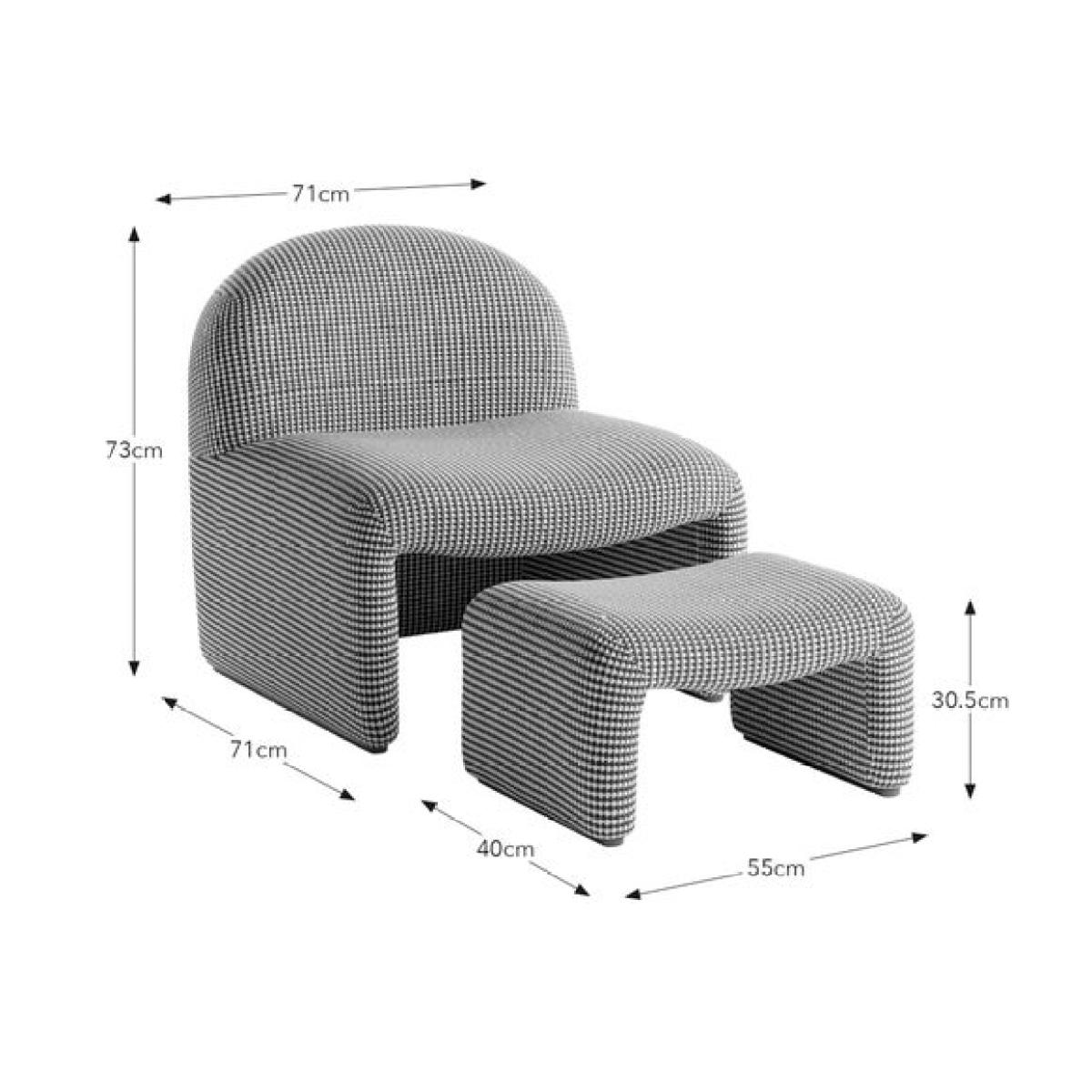 * Matching chair and footstool set * Soft boucle upholstery * Rubberwood frame Upholstered in a tactile dogtooth bobble chenille, the chair adds texture and a subtle retro feel to your space, while its compact size makes it ideal for smaller rooms or reading nooks. The matching footstool neatly tucks away underneath when not in use, offering a practical solution for relaxed lounging without taking up extra room.