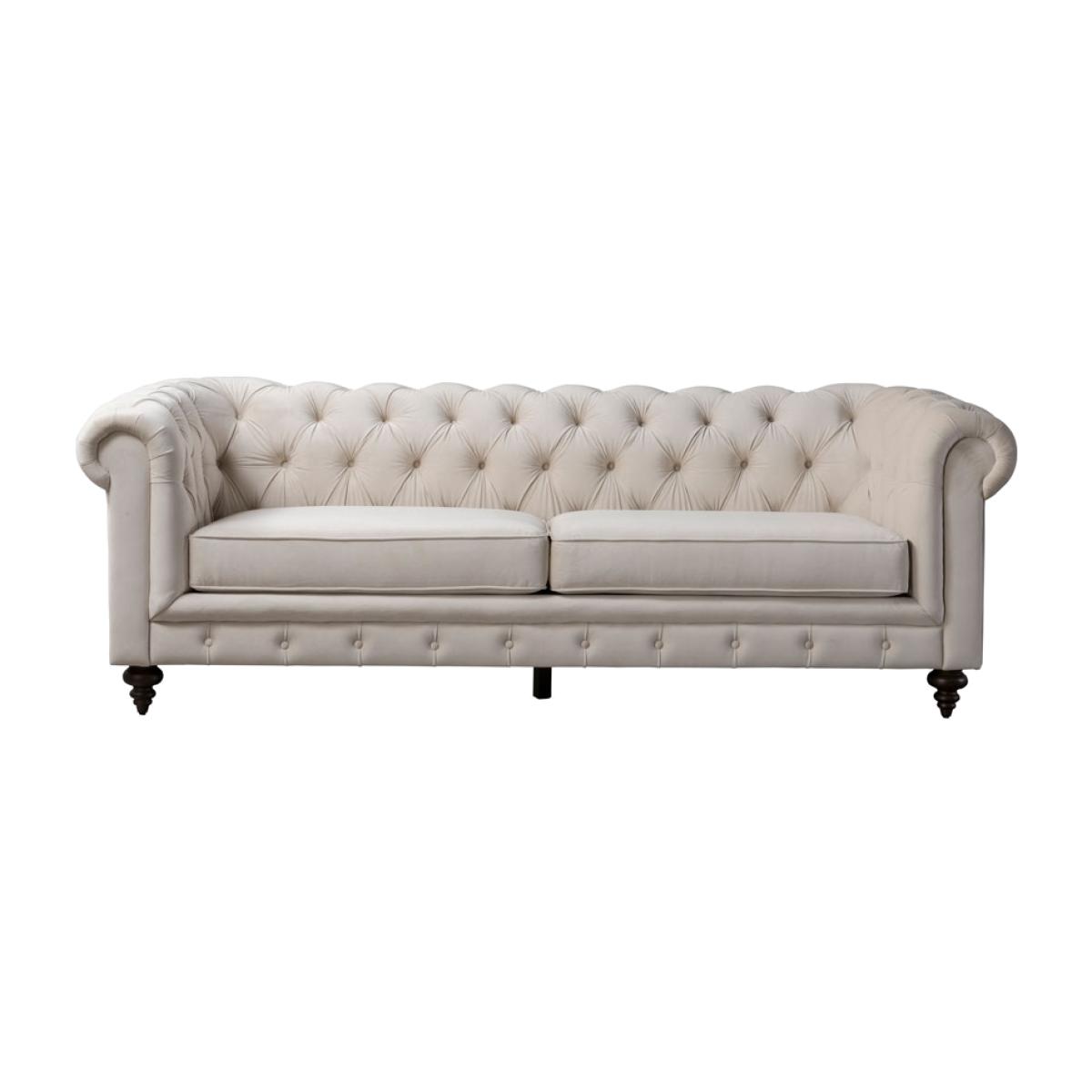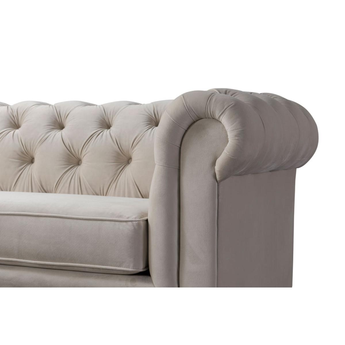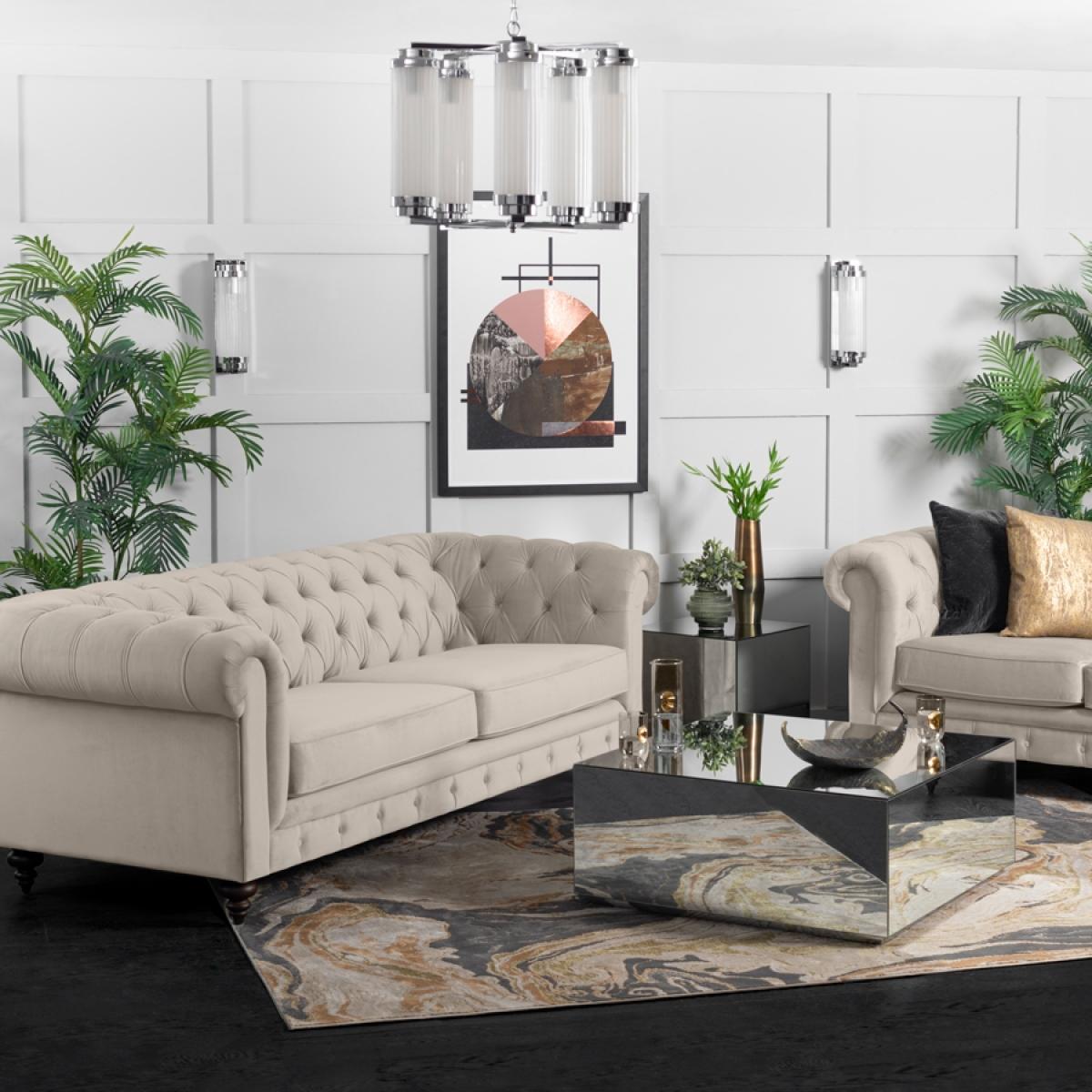 Classic deep buttoned chesterfield sofa, designed with elegance and comfort in mind. Generous, deep foam and fibre filling. Sprung seat and backrest for maximum comfort. Solid ash legs with dark brown stain. Velvet upholstery fabric. Free returns on sofas if you change your mind within 7 days. Simply notify us, put the sofa back in the box, and we will collect it and send you a full refund. (This offer excludes Scottish highlands and islands & any Ireland addresses).