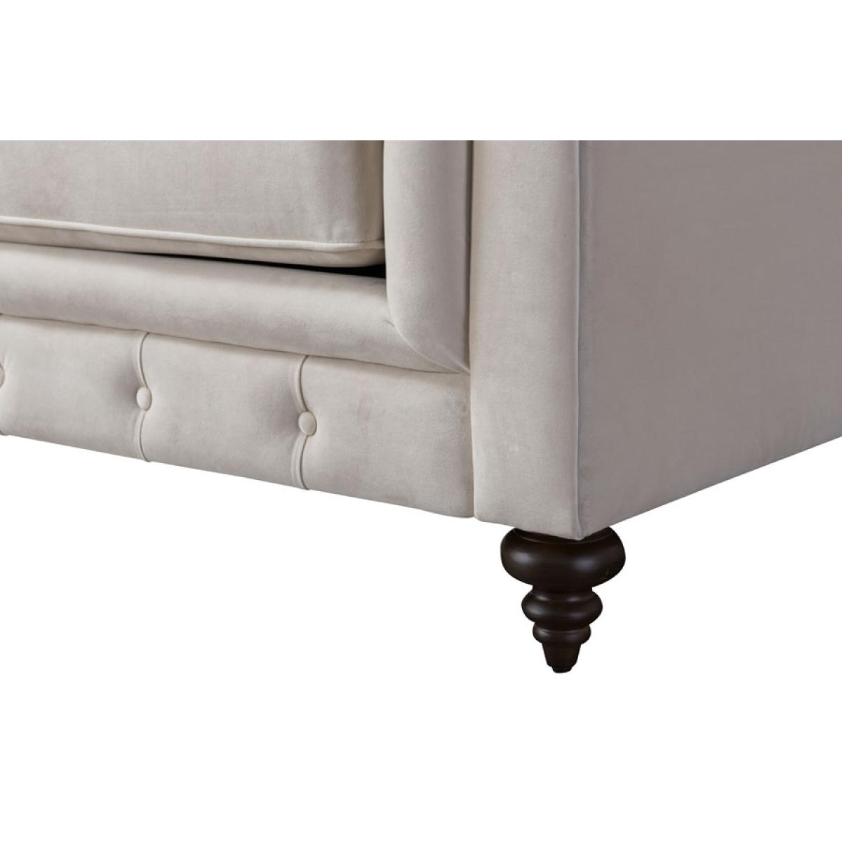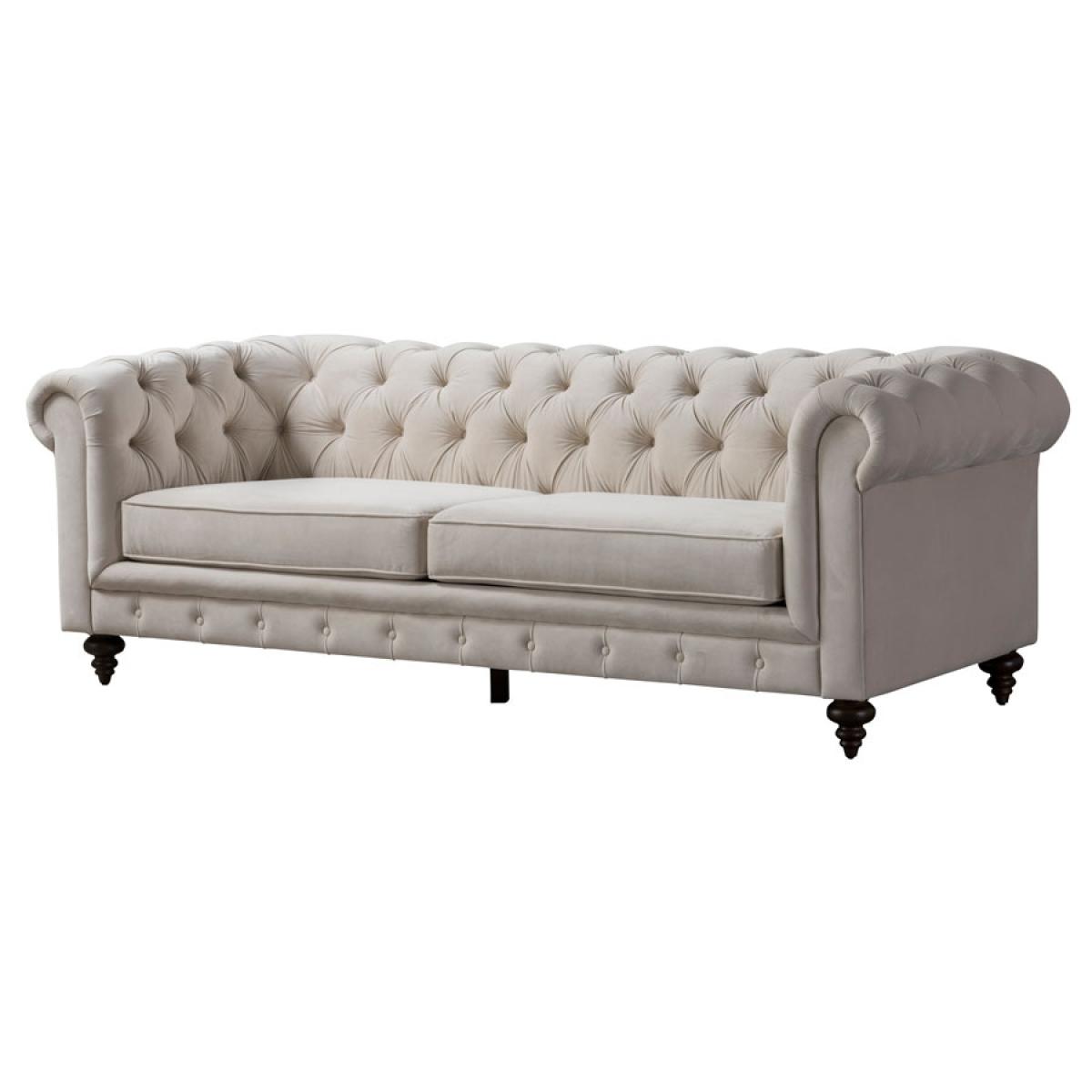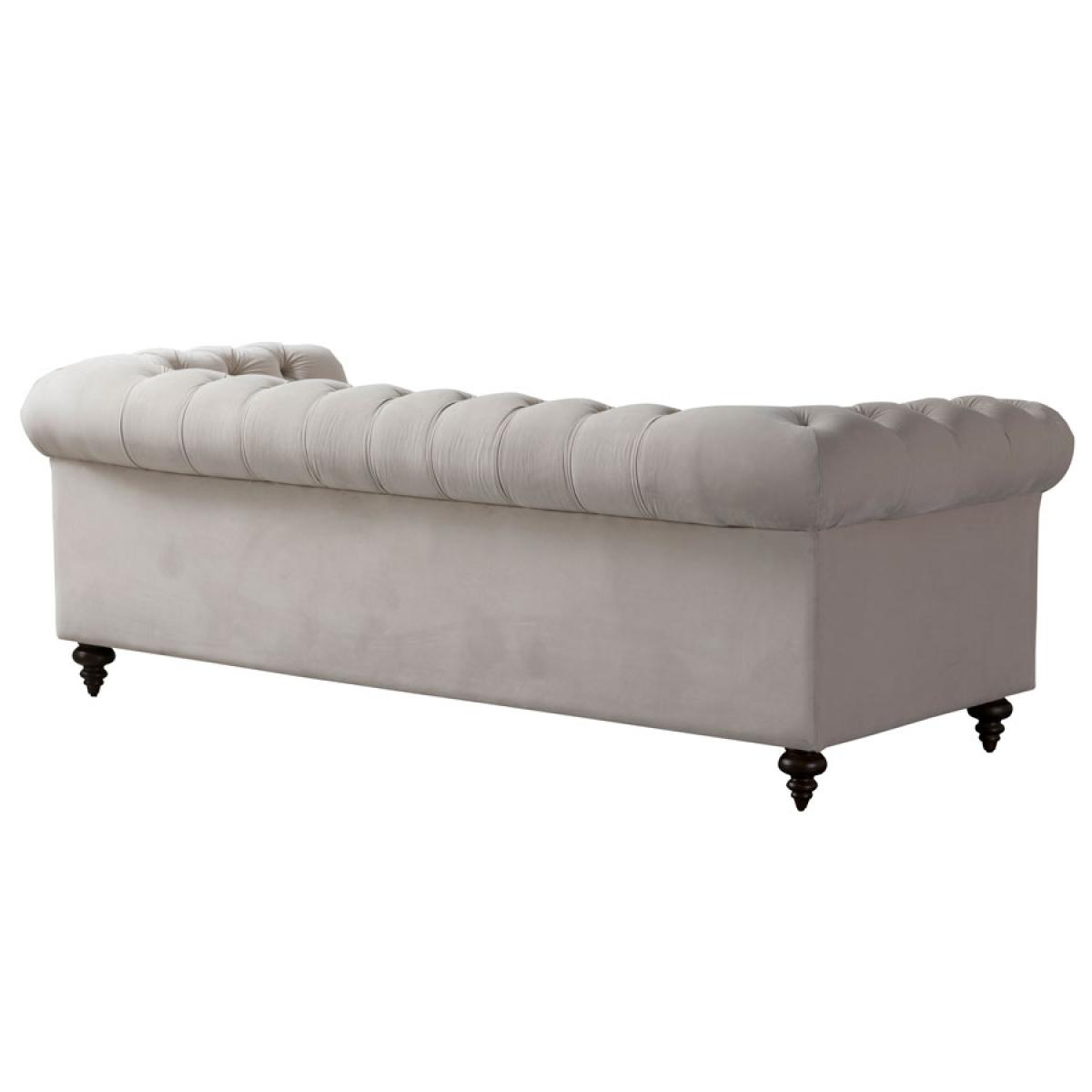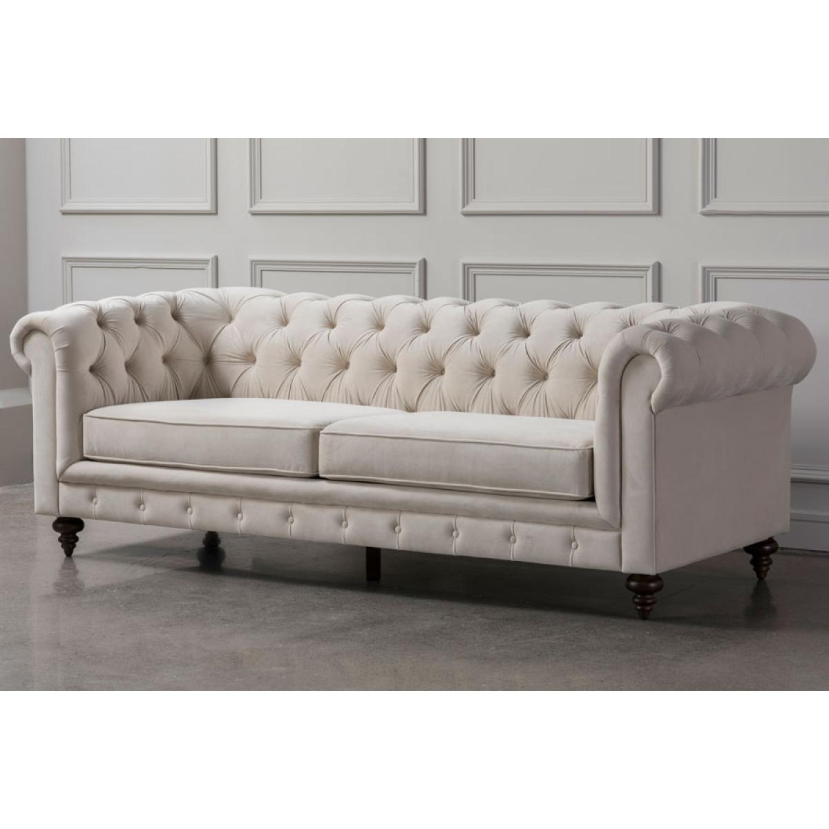 Classic deep buttoned chesterfield sofa, designed with elegance and comfort in mind. Generous, deep foam and fibre filling. Sprung seat and backrest for maximum comfort. Solid ash legs with dark brown stain. Velvet upholstery fabric. Free returns on sofas if you change your mind within 7 days. Simply notify us, put the sofa back in the box, and we will collect it and send you a full refund. (This offer excludes Scottish highlands and islands & any Ireland addresses).