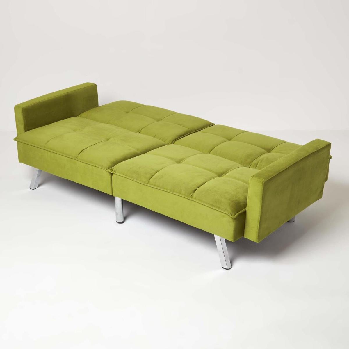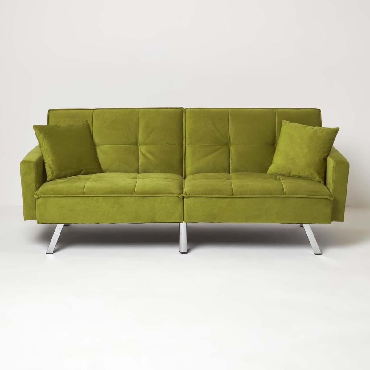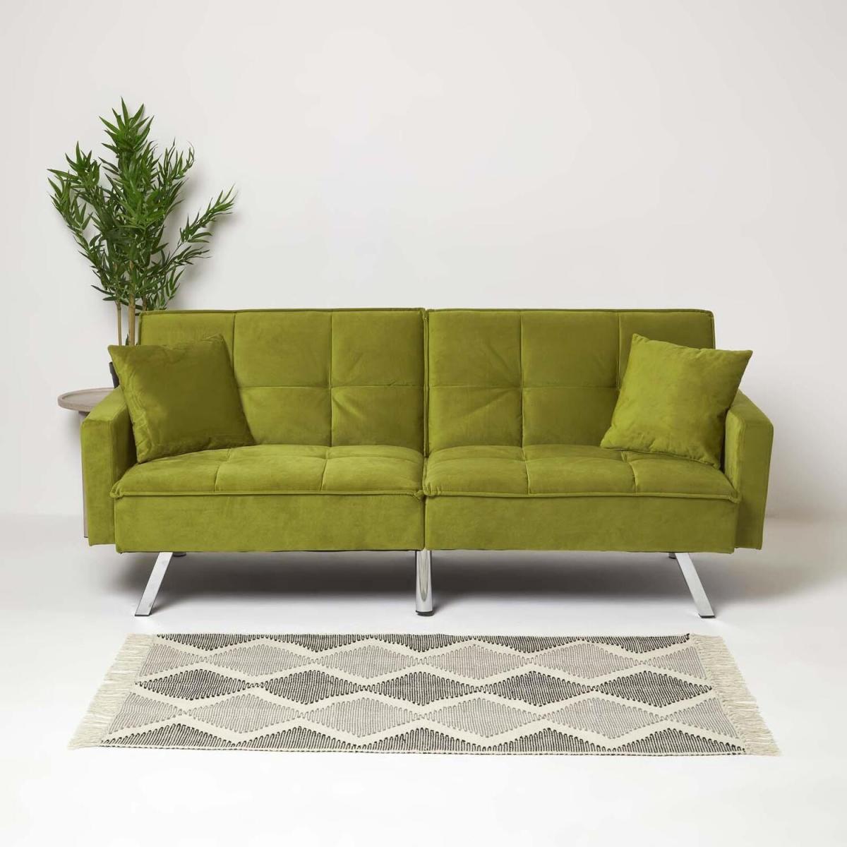 Both practical and stylish, the multi-functional Monty sofa bed will add an on-trend contemporary look to your home interiors. Upholstered in luxuriously soft velvet, the Monty sofa bed is finished with a handstitched quilted design to create a full and plump look. Make the most of the space in your spare room, study or living area with this 3-seater sofa bed that easily transforms into a single bed to use as an extra place to sleep when you have guests. Generously padded, the Monty sofa bed has inbuilt springs to provide extra comfort and support so that it will not become flat over time. Featuring an easy-to-use click-clack mechanism, it will transform into a bed in seconds, the armrests can also be lowered down to provide more space for sleeping. Available in an olive green colour and supported by silver chrome metal leg, it will complement modern and retro style interiors. When used as a sofa, Monty measures W178 x D82 x H83 cm and as a bed, it measures 204 cm (L) x 110cm (W) x 40cm (H). Part of Homescapes' exclusive range of sofa beds, please be aware that some assembly is required.