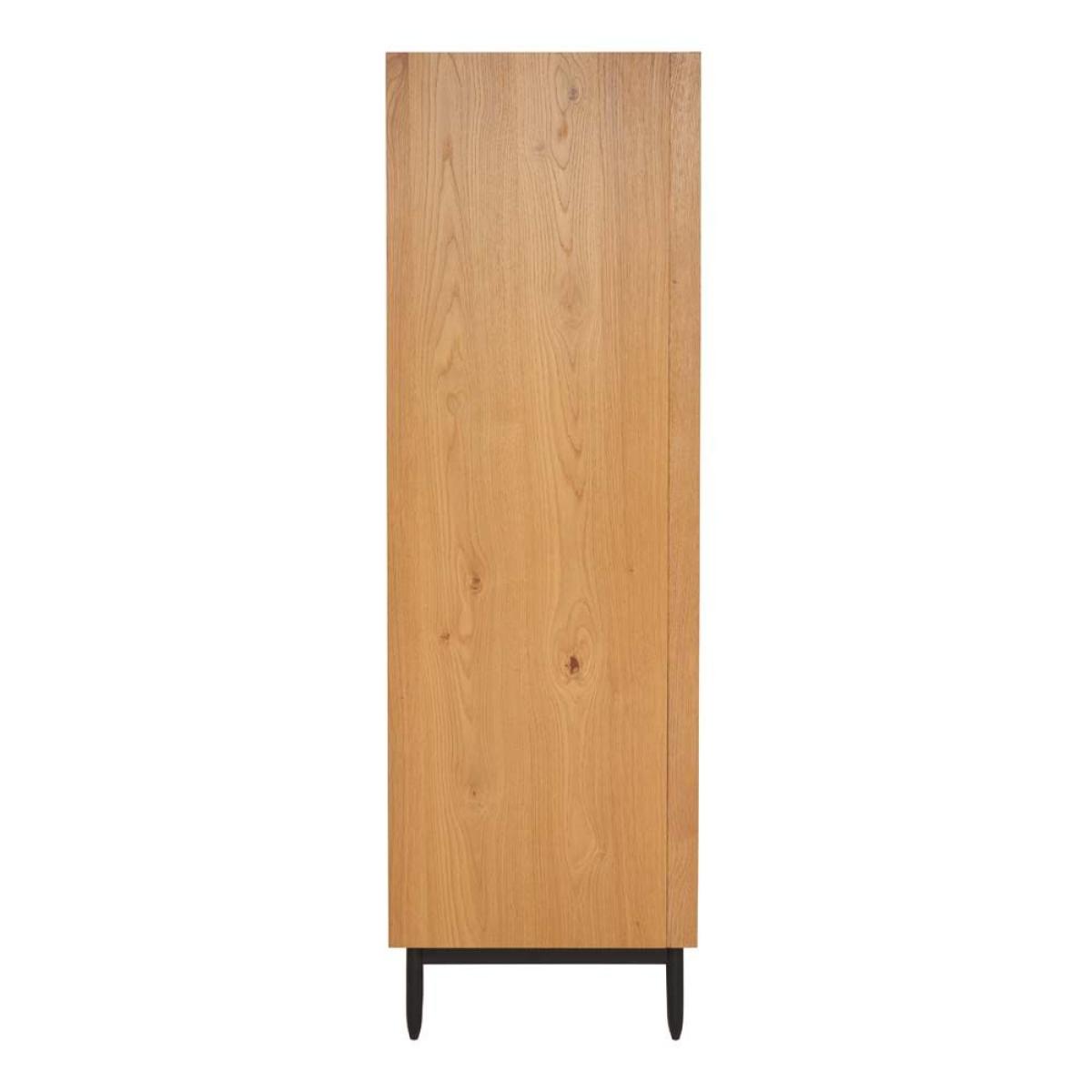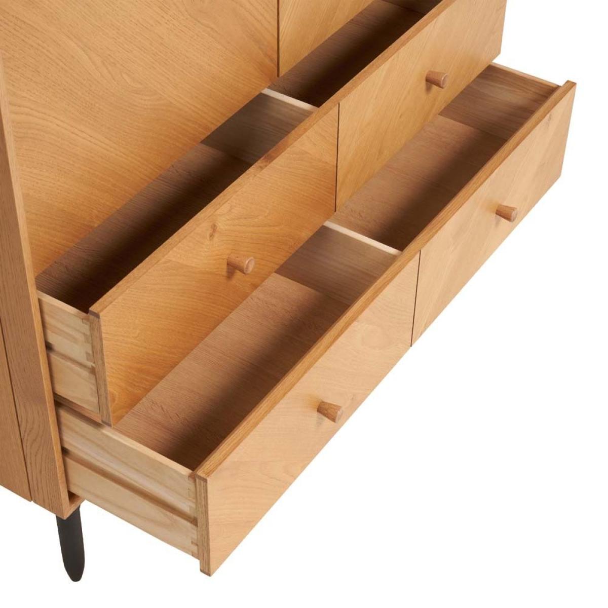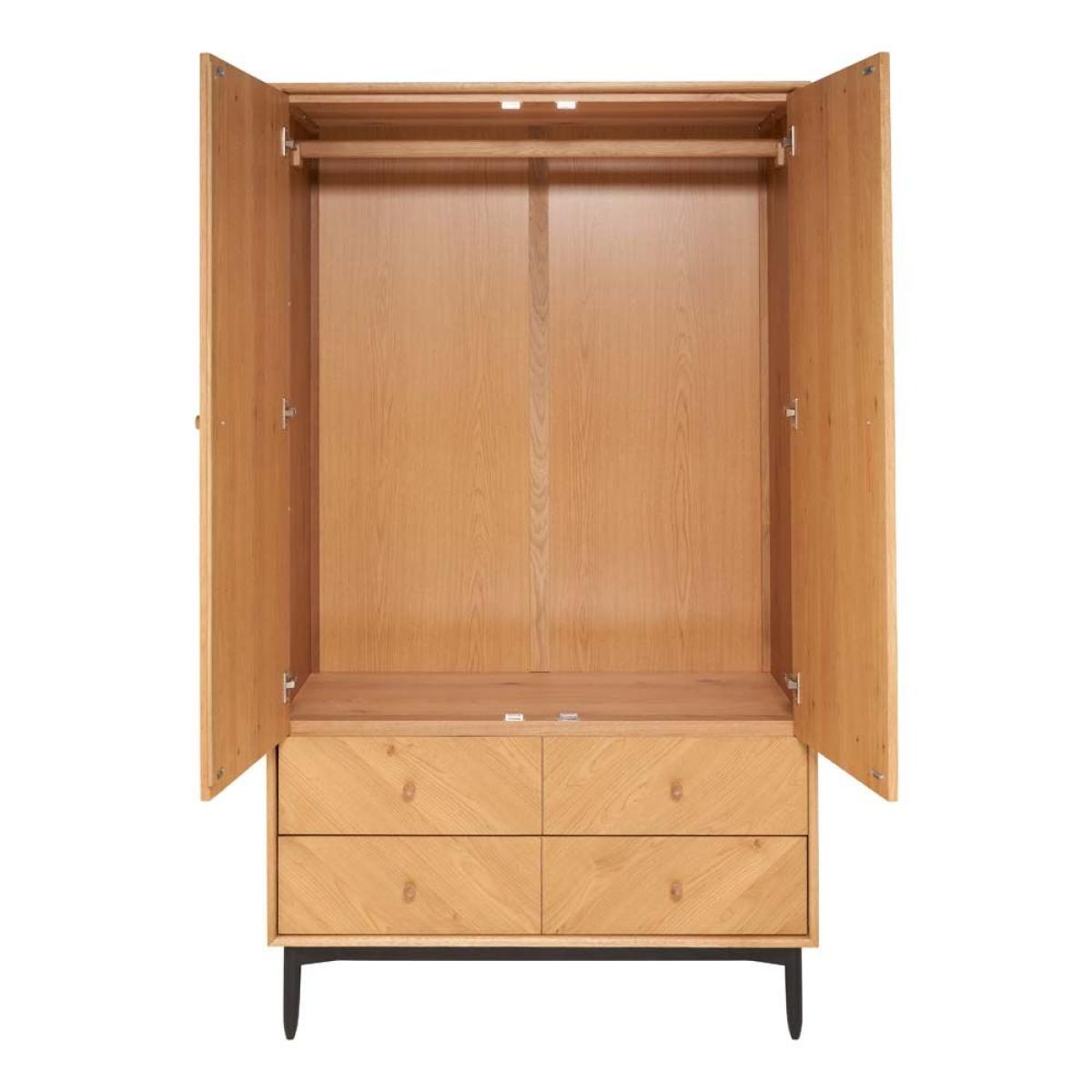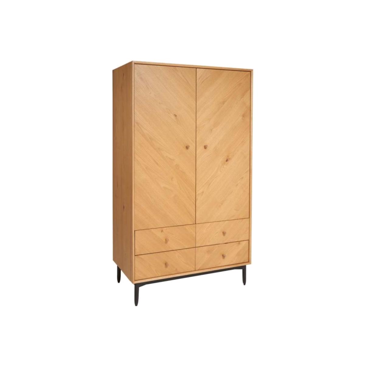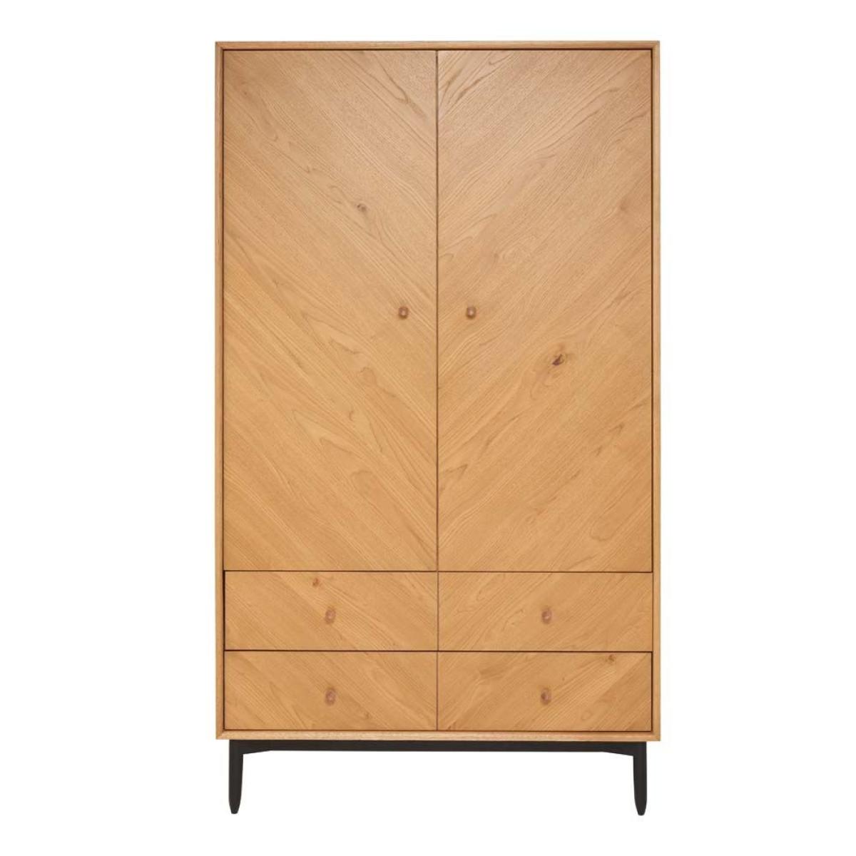 The Monza double wardrobe is a contemporary update of a classic design. The alternating grain direction of the chevron pattern creates a stunning feature on the robe doors. This sits on 4 drawers which are on wooden runners and have a turned wooden handle. The cupborad section contains a single wooden hanging rail across the top and the drawers have a fixed wooden seperator in the centre of each drawer. The elegant undercut detail framing the doors and drawers finishes off this eyecatching bedroom wardrobe. Made from solid oak and oak vaneers with a patina oak clear matt finish and beautifully painted black legs.