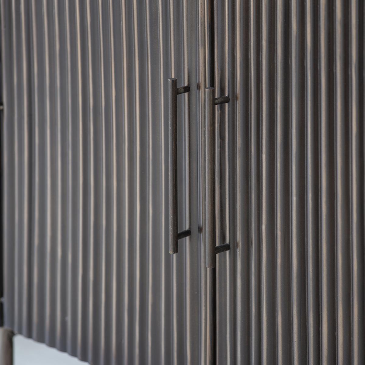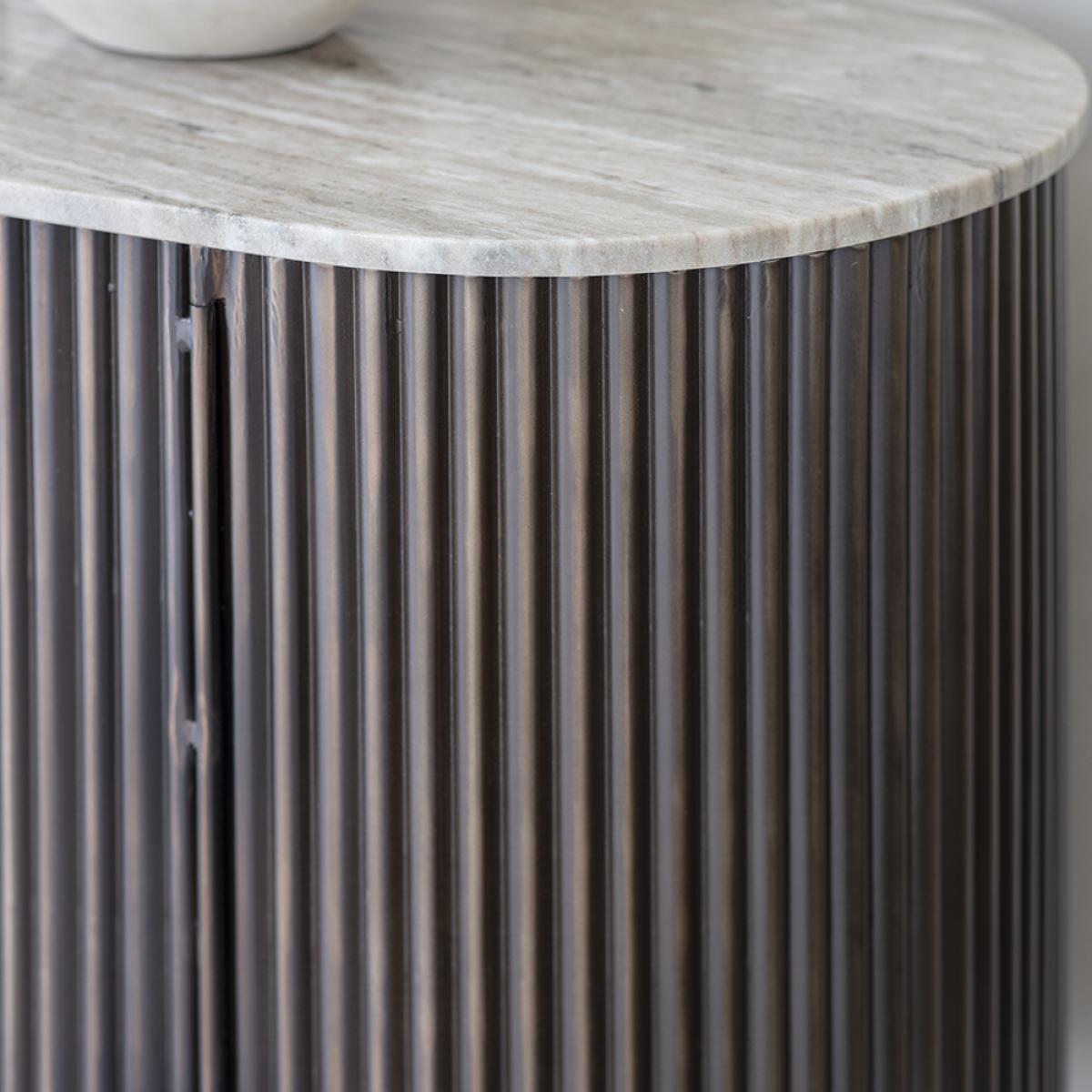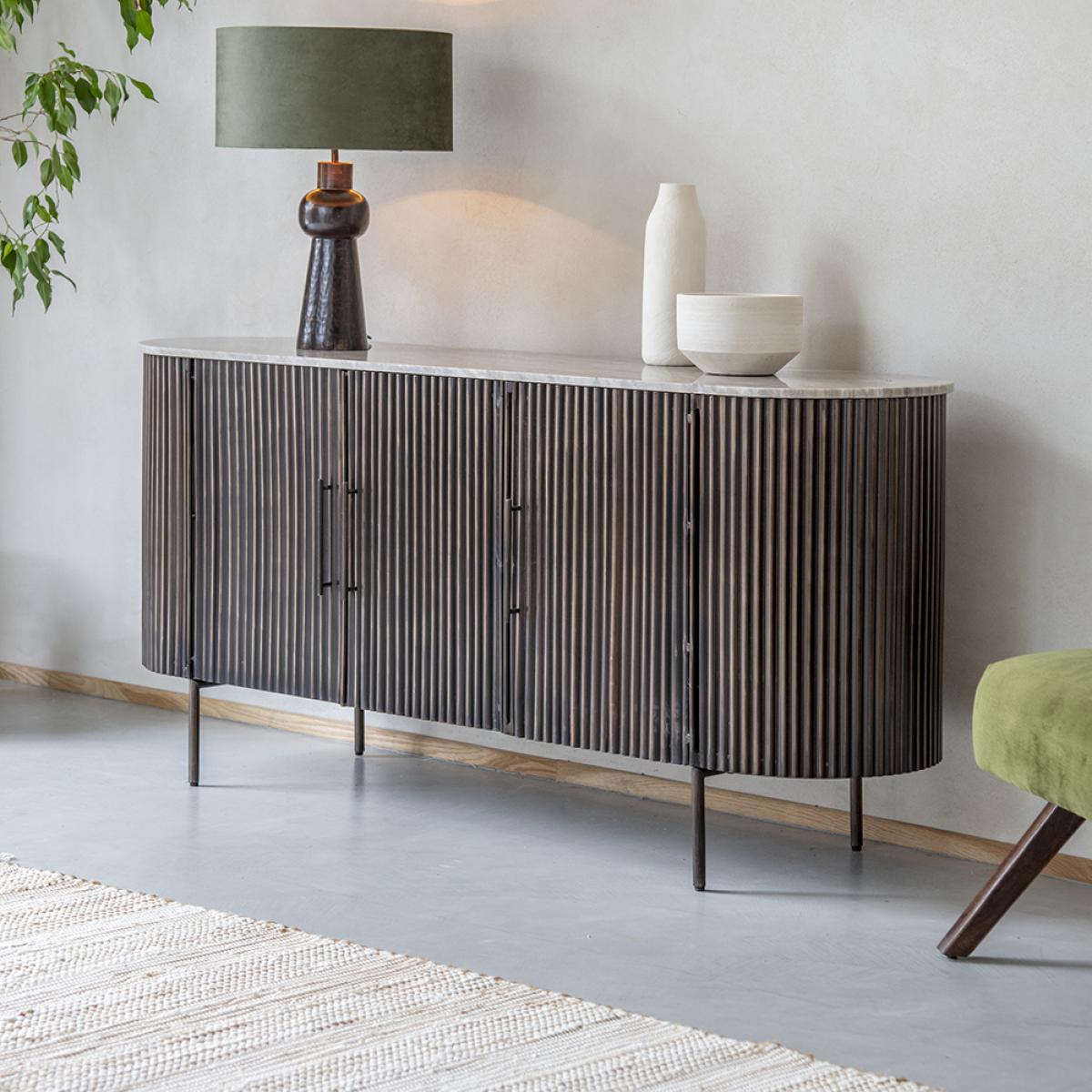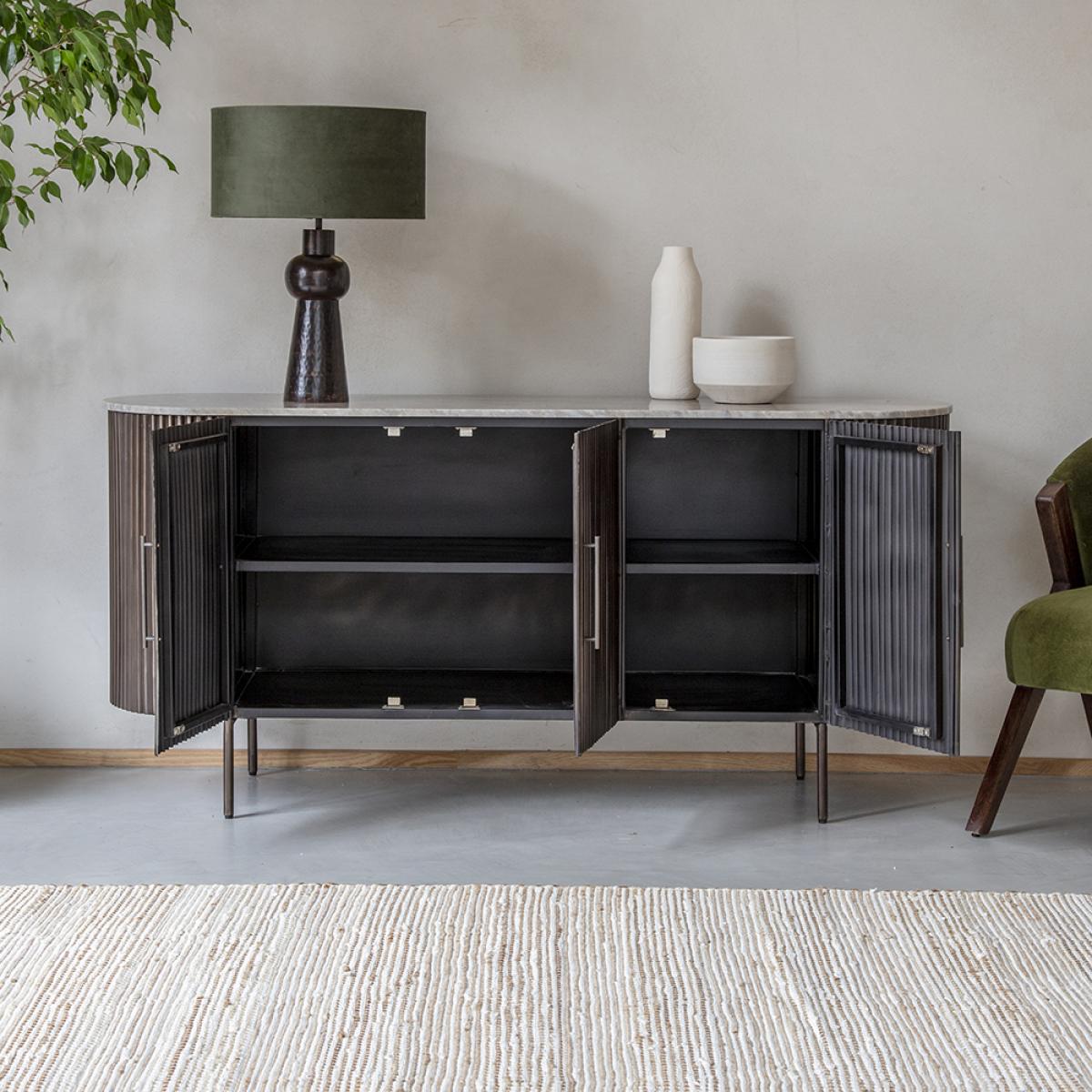 In an elegant antiqued bronze metal finish, the fluted design of our Monza Metal and Marble Sideboard is perfectly in keeping with the trend for fluted surfaces in kitchens and open-plan areas. This marble top metal sideboard has four doors for plenty of storage inside so you can keep your kitchen or dining area free from clutter. The warm mocha marble top has neutral brown details running through it that perfectly complement the bronze metal finish of the base, giving this sideboard a retro-cool and contemporary look. With refined metal handles and thin legs to give it a modern twist, this sideboard is a generous piece of furniture that will be a talking point in your home for years to come.