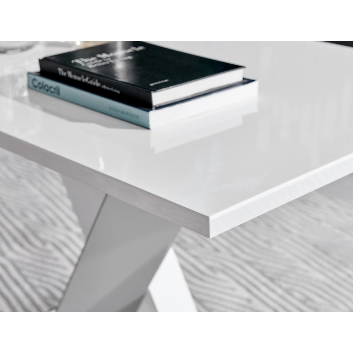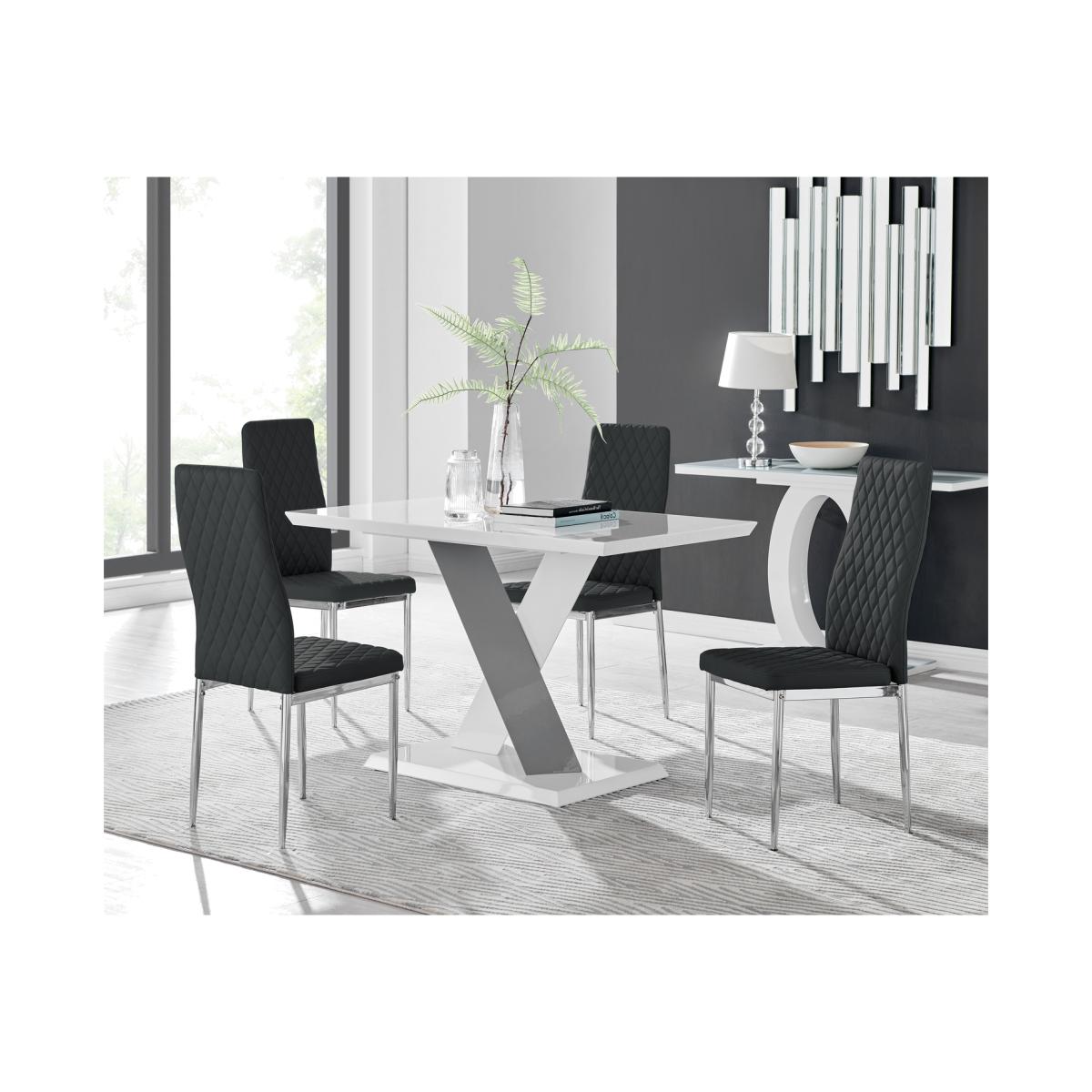 Furniturebox presents a high gloss four-seater dining table from the Monza collection. This white and grey dining table offers a pared back design and seats up to four people. As the smaller of our dining tables from the Monza collection, this feature is ideal for a dining room without much space to spare. The white high gloss table is supported by two angled pillars that creates a unique X shape. This provides reliable stability, while staying true to its contemporary design. The quality finish throughout combines understated elegance and everyday functionality, making it a great choice for a modern home. Paired alongside our beautiful faux leather diamond quilted Milan dining chairs for a sophisticated contemporary look. The Milan chairs are made from high quality faux leather with chrome legs and are ergonomically designed for maximum comfort and back support. Made for regular use, the protective plastic feet will protect your floor from any damage. Available in elephant grey, cappuccino grey, white, black or mustard to add your own personality and complete this gorgeous dining set.