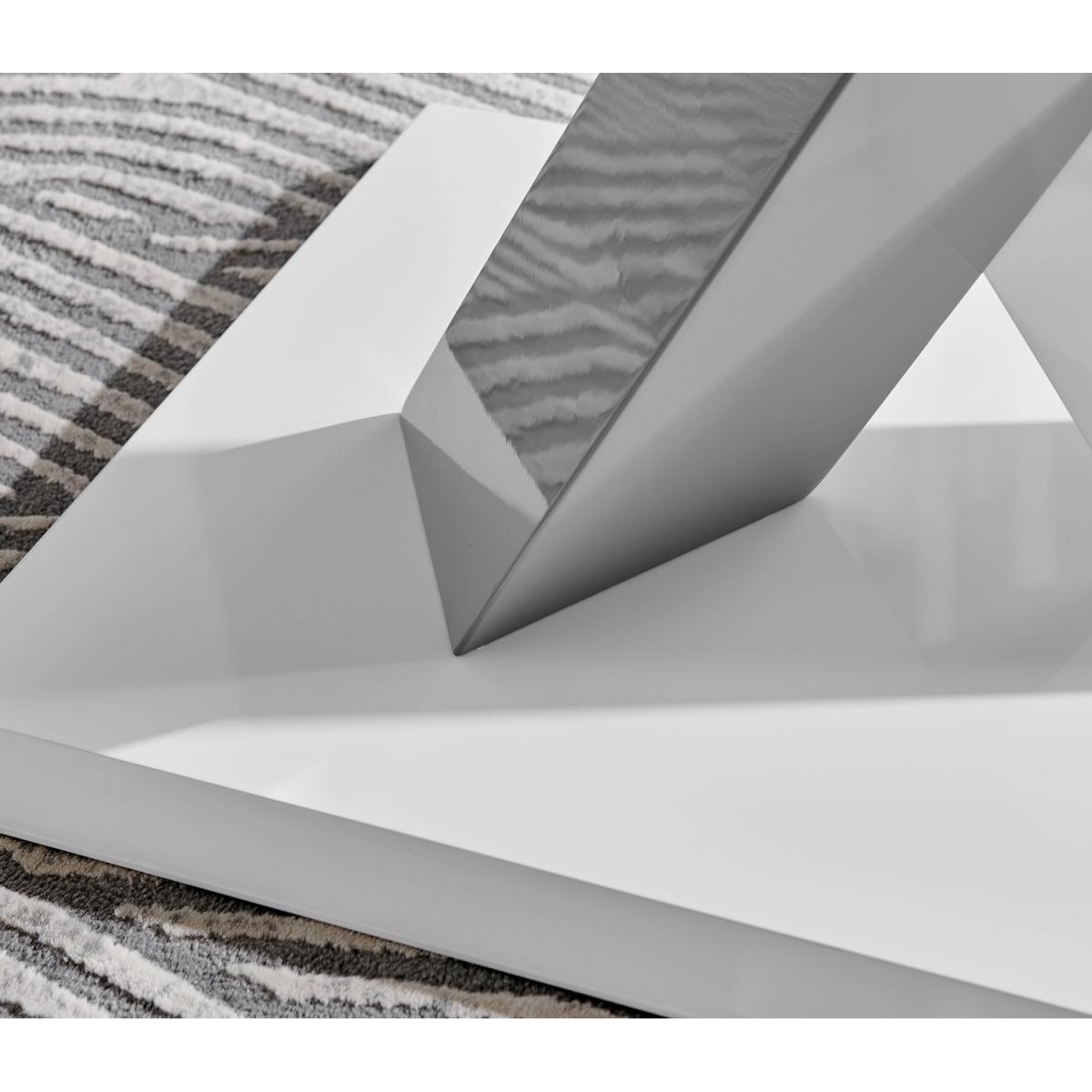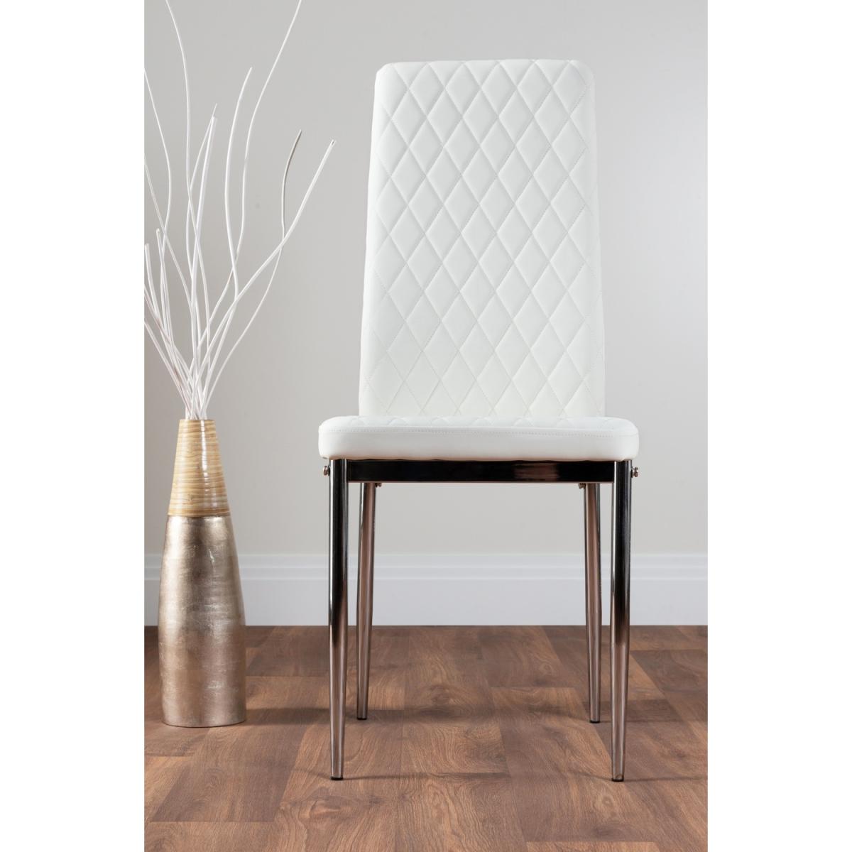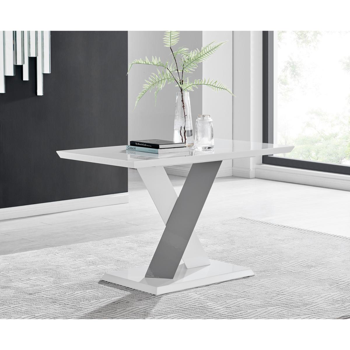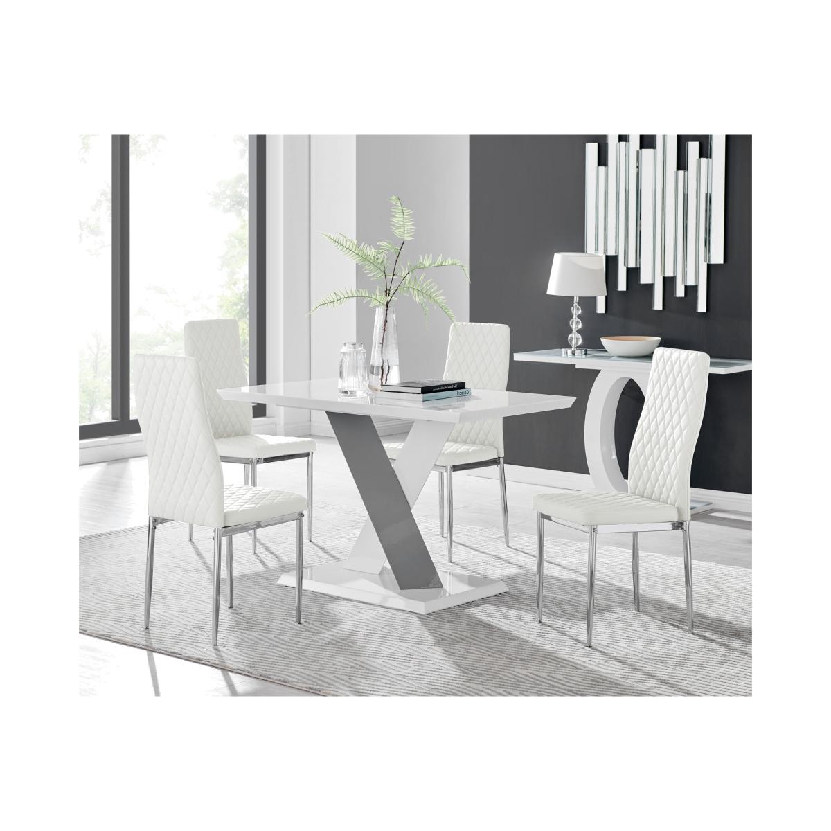 Furniturebox presents a high gloss four-seater dining table from the Monza collection. This white and grey dining table offers a pared back design and seats up to four people. As the smaller of our dining tables from the Monza collection, this feature is ideal for a dining room without much space to spare. The white high gloss table is supported by two angled pillars that creates a unique X shape. This provides reliable stability, while staying true to its contemporary design. The quality finish throughout combines understated elegance and everyday functionality, making it a great choice for a modern home. Paired alongside our beautiful faux leather diamond quilted Milan dining chairs for a sophisticated contemporary look. The Milan chairs are made from high quality faux leather with chrome legs and are ergonomically designed for maximum comfort and back support. Made for regular use, the protective plastic feet will protect your floor from any damage. Available in elephant grey, cappuccino grey, white, black or mustard to add your own personality and complete this gorgeous dining set.