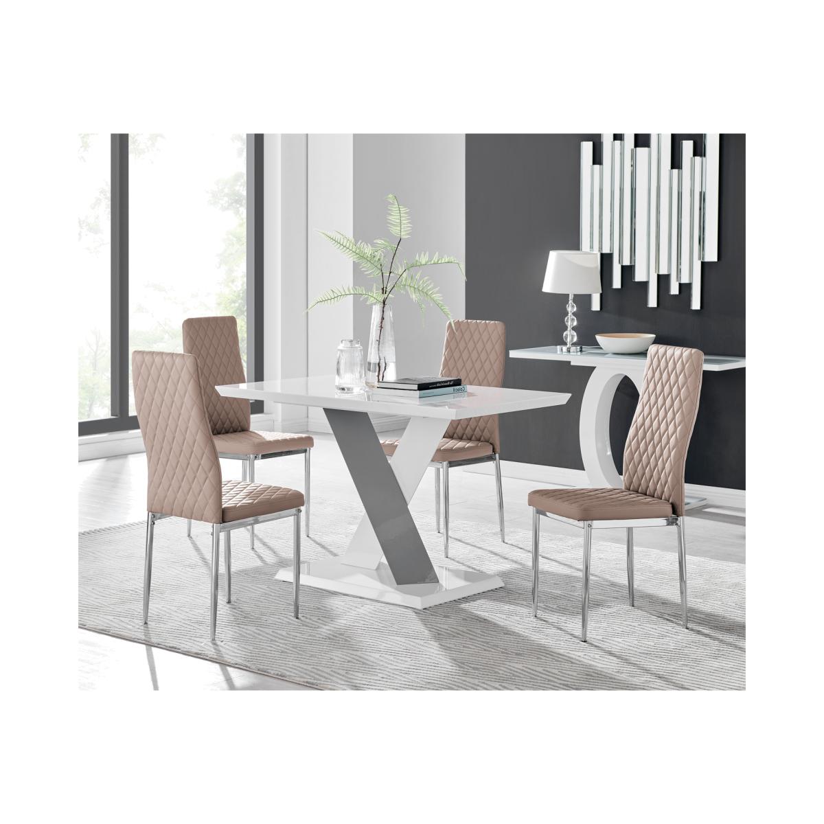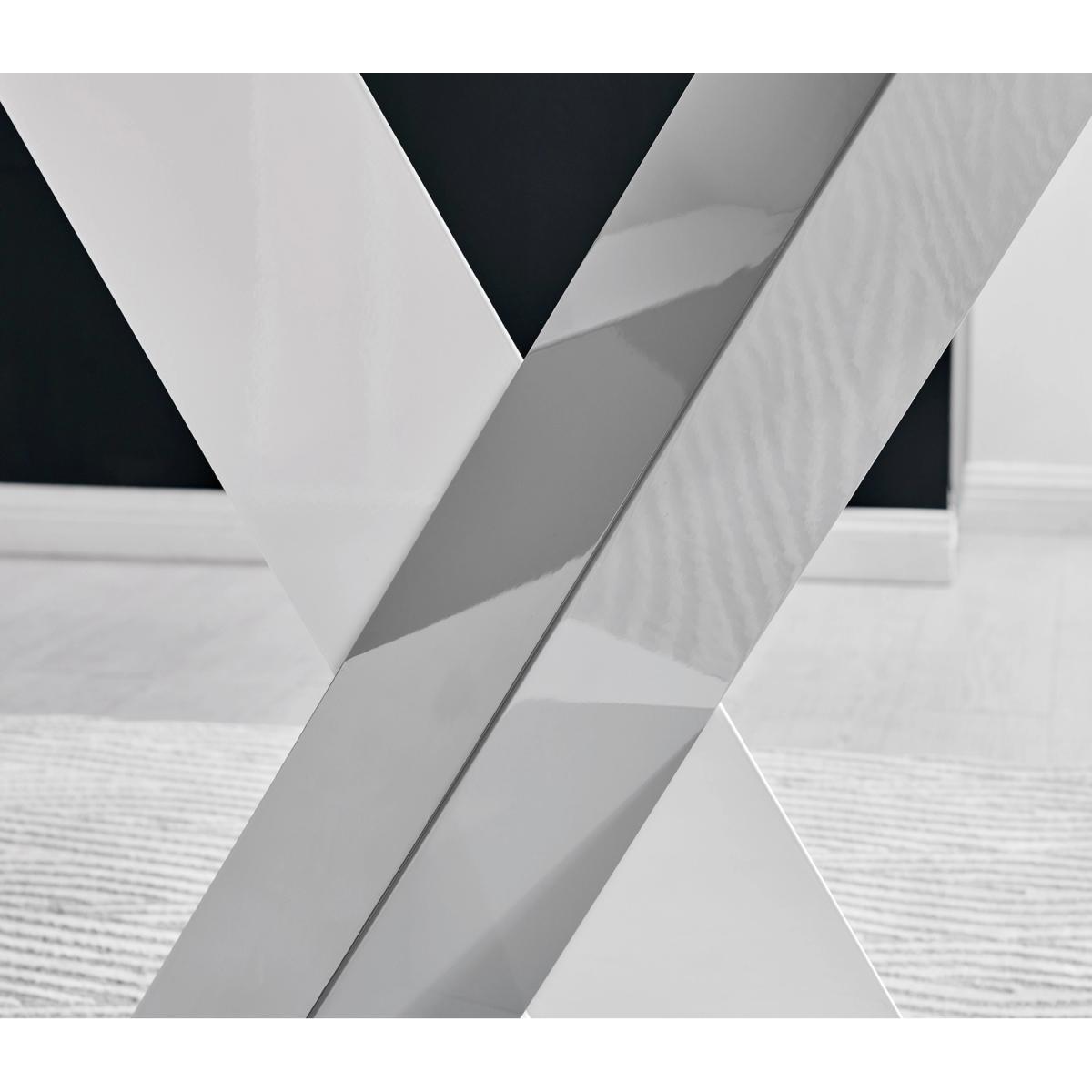 Furniturebox presents a high gloss four-seater dining table from the Monza collection. This white and grey dining table offers a pared back design and seats up to four people. As the smaller of our dining tables from the Monza collection, this feature is ideal for a dining room without much space to spare. The white high gloss table is supported by two angled pillars that creates a unique X shape. This provides reliable stability, while staying true to its contemporary design. The quality finish throughout combines understated elegance and everyday functionality, making it a great choice for a modern home. Paired alongside our beautiful faux leather diamond quilted Milan dining chairs for a sophisticated contemporary look. The Milan chairs are made from high quality faux leather with chrome legs and are ergonomically designed for maximum comfort and back support. Made for regular use, the protective plastic feet will protect your floor from any damage. Available in elephant grey, cappuccino grey, white, black or mustard to add your own personality and complete this gorgeous dining set.