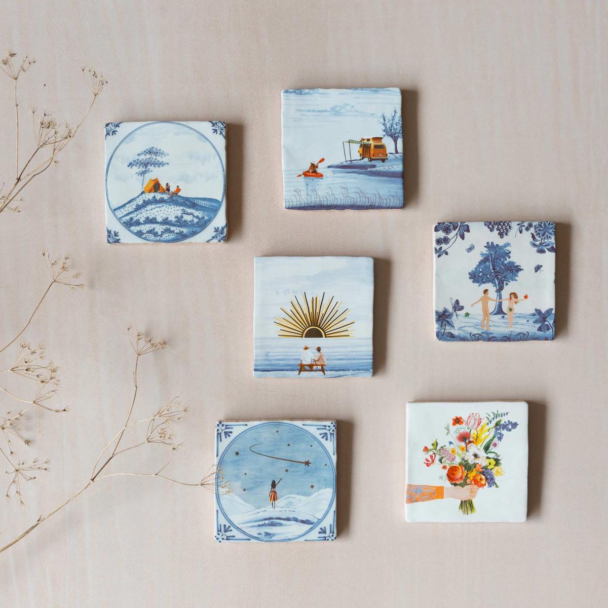 Create your own miniature gallery wall with a collection of handmade ceramic tiles crafted using the traditional Dutch techniques that began in Delft in the Netherlands in the 16th century. Each design is painted by an artist to depict a tiny scene and then printed onto the clay, glazed and twice-baked in a Dutch tile oven. These unique works of art are made with love and can be used in the kitchen, bathroom or gifted to a fellow art-lover. H10 x W10cm each. Made of ceramic. Each design is painted then printed onto the tile and baked in traditional Dutch ovens at a high temperature. Heat and water resistant. Suitable for kitchens and bathrooms or it includes a hanging system to display it as a piece of art. These products are handmade so the colour, pattern and finish may vary. Made in Amsterdam.