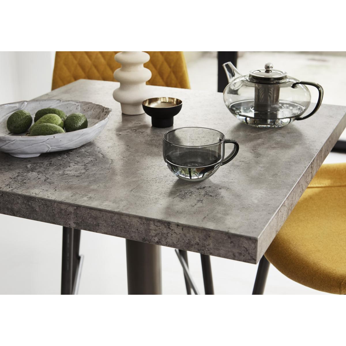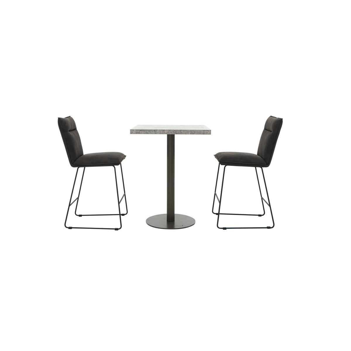 Offering a brand new twist on popular industrial style, Moon features concrete-look table tops, dark grey-painted metal bases and an overall cool and contemporary vibe. This is also a very versatile range – the concrete-effect dining table is extremely hardwearing, equally suited to family mealtimes and stylish dinner parties, and seating options include a dining chair and dining benches beautifully upholstered in dark grey faux leather. Mix and match pieces to create your own perfect dining table and chairs set or choose a ready-made dining set. Fabulous modern style at a fantastic value price. Great-value industrial style for contemporary spaces. Compact bar table has durable concrete-effect top and metal base. With 2 comfortable bar stools upholstered in dark grey faux suede. Here’s proof that bar dining can be stylish and contemporary. The Moon bar table and 2 bar stools set reinvents the traditional bar dining set and delivers a look that’s entirely in keeping with today’s urban furniture trend. Perfect for kitchen diners and compact dining spaces, this dining set also represents exceptionally good value. The square bar table is compactly proportioned yet accommodates four diners with ease, and the concrete-effect top provides a hardwearing surface for stylish dining and everyday meals alike. The table top is set on a pedestal base with circular foot plate made of a dark grey-painted metal. The two bar stools are as elegant and comfortable as any dining chair thanks to the supportive backs and deep comfortable seats. Well-padded and fully upholstered in a dark grey faux suede, bars stools feature understated top stitched edges and a stitched groove in the centre backs. Ski-style bases are made of painted metal. The Moon bar table and 2 bar stools set is part of the Moon dining and living furniture collection at Furniture Village. Please note. The finish of each concrete-effect table top will display variations and unique markings. This should not be considered a fault. While hard wearing, this finish is not completely heat resistant. Be sure to use coasters and placemats at all times.