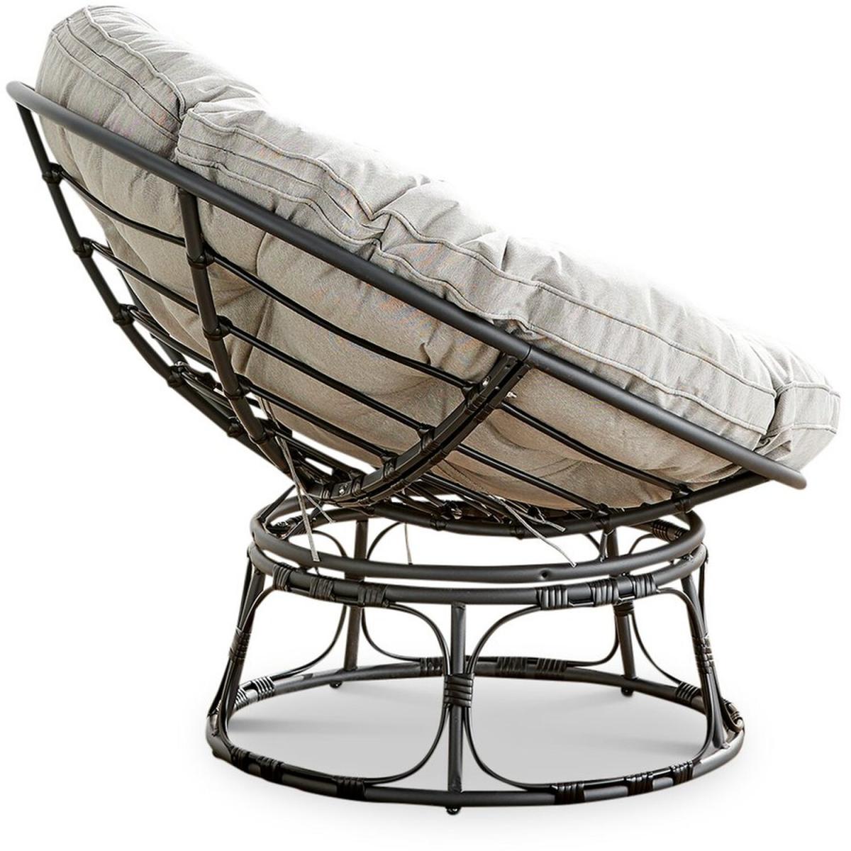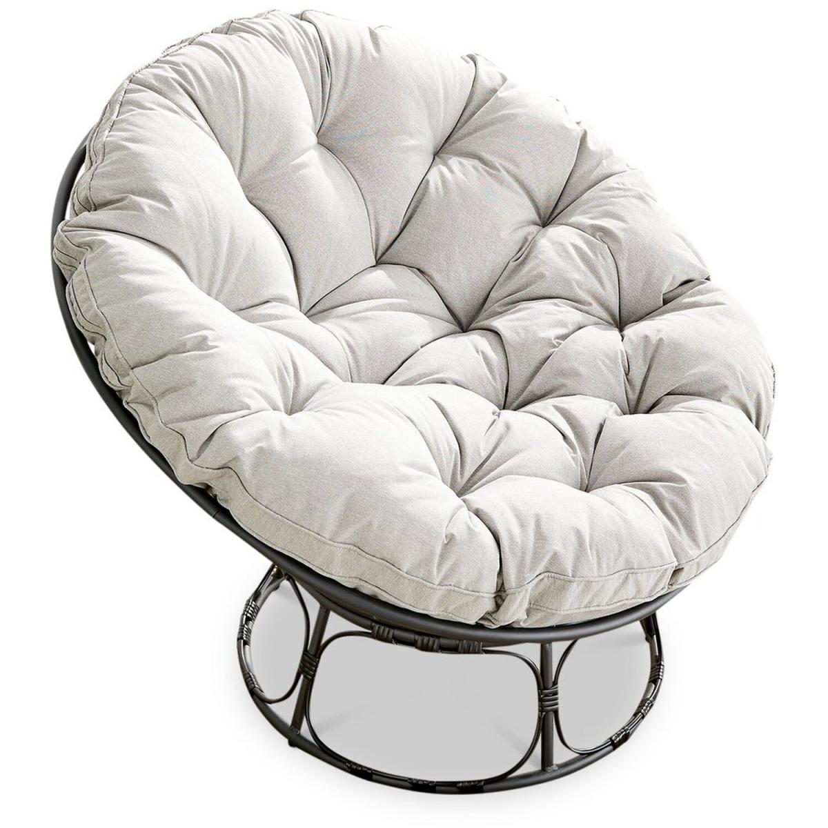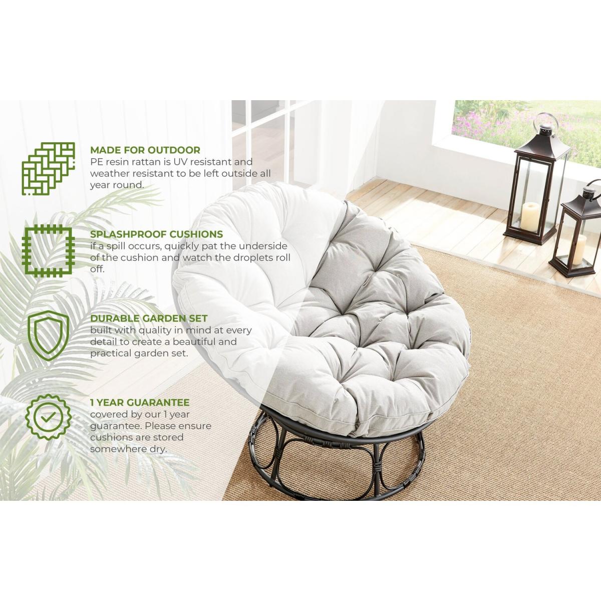 The Moon rattan chair makes the perfect spot to lean back and relax in the sun with its tilted back design and round shape to hug and support your body. The modern black rattan is complimented by thick, light grey cushions. Measuring 99cm deep, 99cm wide and 81.5cm high, this rattan chair provides plenty of space for you to get comfy. The PE resin black rattan is UV resistant and weather resistant so it can be left outdoors all year round. It's low maintenance, needing only a wipe down with a damp, soft brush or cloth every now and then to keep it looking brand new.