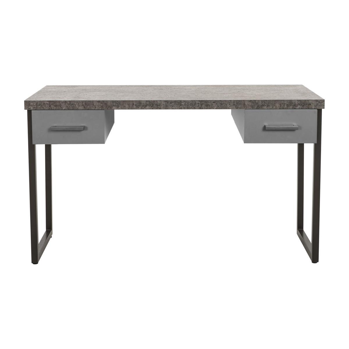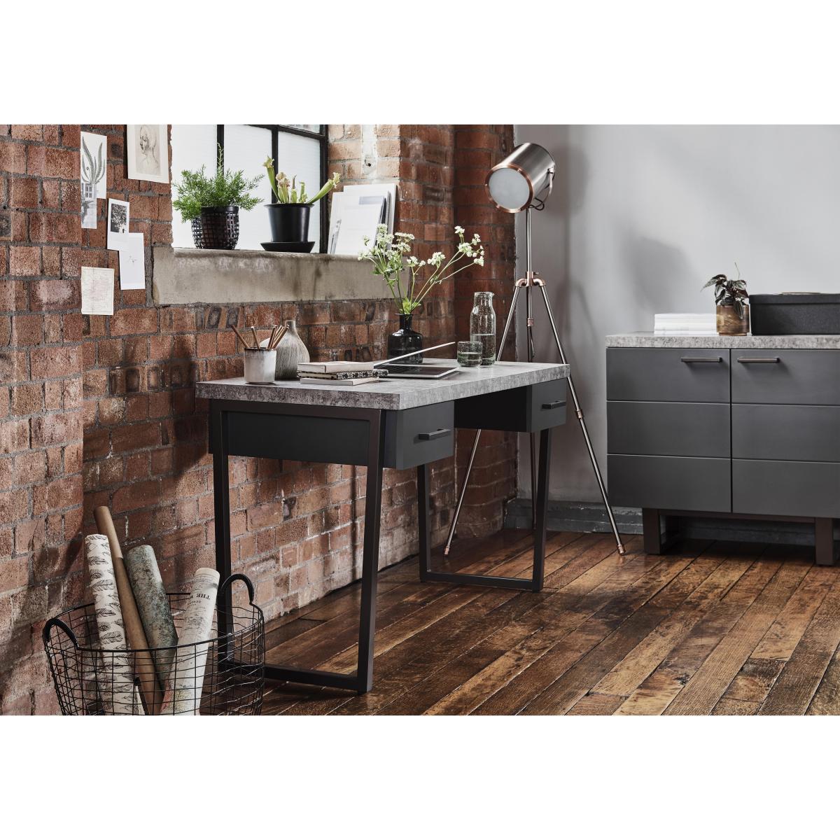 A simple understated desk for your modern industrial work- from- home zone. Beautifully crafted and featuring a stunning concrete- effect surface, this desk makes your daily toil a little more stylish. Modern industrial desk with 2 side drawers and concrete- effect top. Contemporary home office style. Grey frame. Chunky grey metal legs and drawer handles. Designed and crafted with care. What you need to know Please note that the surface is not heat- resistant. Use coasters and placements and avoid abrasive cleaning products. Part of the Moon Office collection of desks and home office storage. WARNING! Furniture can tip over unexpectedly and cause injury. This item must be fixed to a wall using the anti- tip kit provided. Be sure to use the correct wall fixings suitable for the walls in your home. Furniture Village is not able to fix anti- tip devices for you. Seek professional advice if you are unsure.