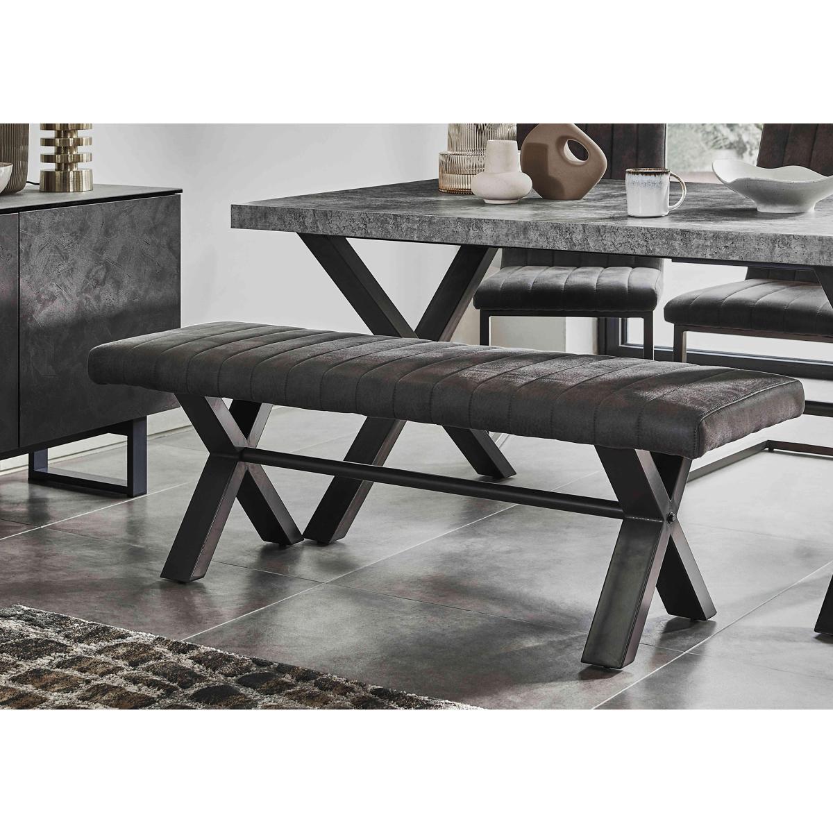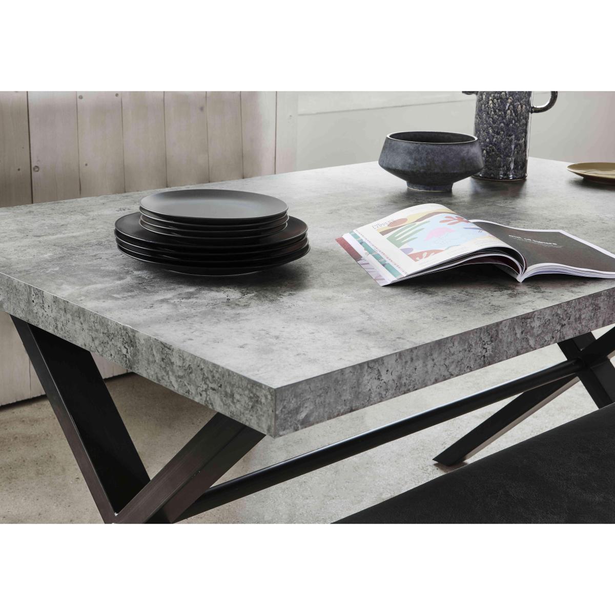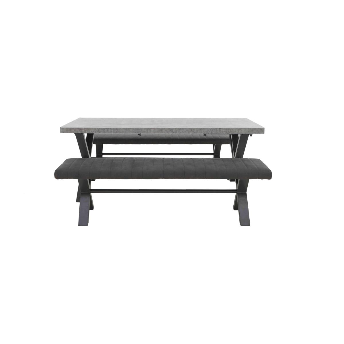 Offering a brand new twist on popular industrial style, Moon features concrete-look table tops, dark grey-painted metal bases and an overall cool and contemporary vibe. This is also a very versatile range – the concrete-effect dining table is extremely hardwearing, equally suited to family mealtimes and stylish dinner parties, and seating options include a dining chair and dining benches beautifully upholstered in dark grey faux leather. Mix and match pieces to create your own perfect dining table and chairs set or choose a ready-made dining set. Fabulous modern style at a fantastic value price. Practical and versatile, this urban-cool – and great-value – dining set comes with two space-saving dining benches. The concrete-effect table top gives this dining set the style edge. Why you'll love it. Great-value dining set is the very definition of contemporary industrial style. The dining table has a fabulous hardwearing concrete-effect top. Table is available in two sizes. Metal base is painted dark grey. With 2 Furniture Village-exclusive dining benches. Faux leather upholstery in slate grey with fluting. Black powder-coated metal X-shaped base. This dining set is part of the extensive Moon furniture range. What you need to know. Dining benches have foam cushioning and metal bases. Small dining table seats 4. Can be extended to seat up to 8. Small dining table comes with 2 140 cm benches, each seating up to 3 adults. Large dining table seats 8. Can be extended to seat up to 12. Large dining table comes with 2 180 cm benches, each seating up to 4 adults. Moon extension leaves are available separately. The concrete-effect finish of each table top will display variations and unique markings. While hardwearing, this finish is not completely heat resistant. Use coasters and placemats at all times. Easy care – simply wipe with a clean, non-abrasive damp cloth. For more advice, see our Dining Care Guide.