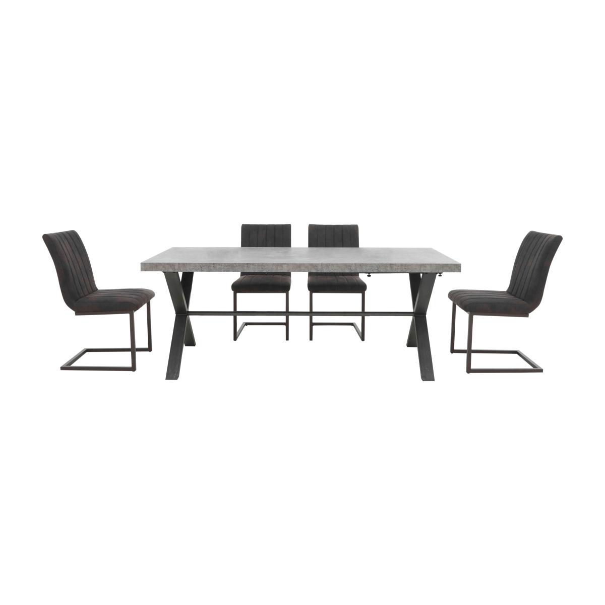 Offering a brand new twist on popular industrial style, Moon features concrete-look table tops, dark grey-painted metal bases and an overall cool and contemporary vibe. This is also a very versatile range – the concrete-effect dining table is extremely hardwearing, equally suited to family mealtimes and stylish dinner parties, and seating options include a dining chair and dining benches beautifully upholstered in dark grey faux leather. Mix and match pieces to create your own perfect dining table and chairs set or choose a ready-made dining set. Fabulous modern style at a fantastic value price. Cool contemporary dining style at a great-value price. This fabulous dining set hits all the right notes – concrete-effect table top, slate grey faux leather upholstery and urban metal accents. Why you'll love it. Great-value dining set is the very definition of contemporary industrial style. The dining table has a fabulous hardwearing concrete-effect top. Table is available in two sizes. Metal base is painted dark grey. With 4 Furniture Village-exclusive cantilever dining chairs. Faux leather upholstery in slate grey with fluting. Black powder-coated metal cantilever base. This dining set is part of the extensive Moon furniture range. What you need to know. Dining chairs have foam seat cushioning and metal frames. Small dining table seats 4. Can be extended to seat up to 8. Large dining table seats 8. Can be extended to seat up to 12. Moon extension leaves are available separately. The concrete-effect finish of each table top will display variations and unique markings. While hardwearing, this finish is not completely heat resistant. Use coasters and placemats at all times. Easy care – simply wipe with a clean, non-abrasive damp cloth. For more advice, see our Dining Care Guide.