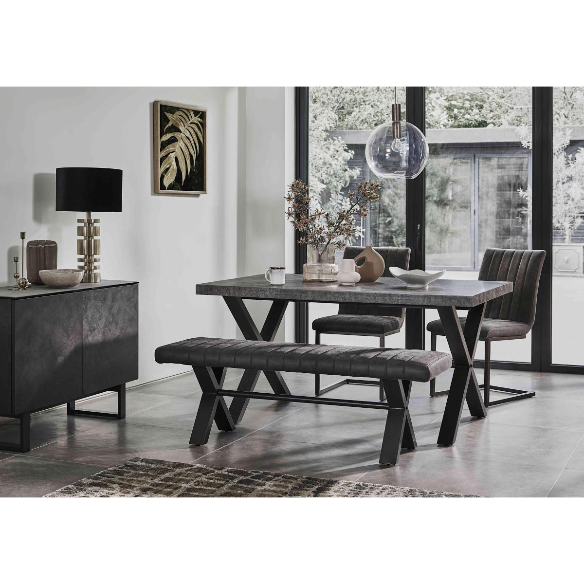 Offering a brand new twist on popular industrial style, Moon features concrete-look table tops, dark grey-painted metal bases and an overall cool and contemporary vibe. This is also a very versatile range – the concrete-effect dining table is extremely hardwearing, equally suited to family mealtimes and stylish dinner parties, and seating options include a dining chair and dining benches beautifully upholstered in dark grey faux leather. Mix and match pieces to create your own perfect dining table and chairs set or choose a ready-made dining set. Fabulous modern style at a fantastic value price. With its versatile seating options – cantilever dining chairs and a bench – and concrete-effect table top this cool dining set delivers both style and comfort. It’s very well-priced too. Why you'll love it Great-value dining set is the very definition of contemporary industrial style. The dining table has a fabulous hardwearing concrete-effect top. Table is available in two sizes. Metal base is painted dark grey. With 2 Furniture Village-exclusive cantilever dining chairs and a dining bench. Faux leather upholstery in slate grey with fluting. Black powder-coated metal bases. This dining set is part of the extensive Moon furniture range. What you need to know Dining chairs and bench have foam cushioning and metal bases. Small dining table seats 4. Can be extended to seat up to 8. Small dining table comes with a 140 cm bench, seating up to 3 adults. Large dining table seats 8. Can be extended to seat up to 12. Large dining table comes with a 180 cm bench, seating up to 4 adults. Moon extension leaves are available separately. The concrete-effect finish of each table top will display variations and unique markings. While hardwearing, this finish is not completely heat resistant. Use coasters and placemats at all times. Easy care – simply wipe with a clean, non-abrasive damp cloth. For more advice, see our Dining Care Guide.