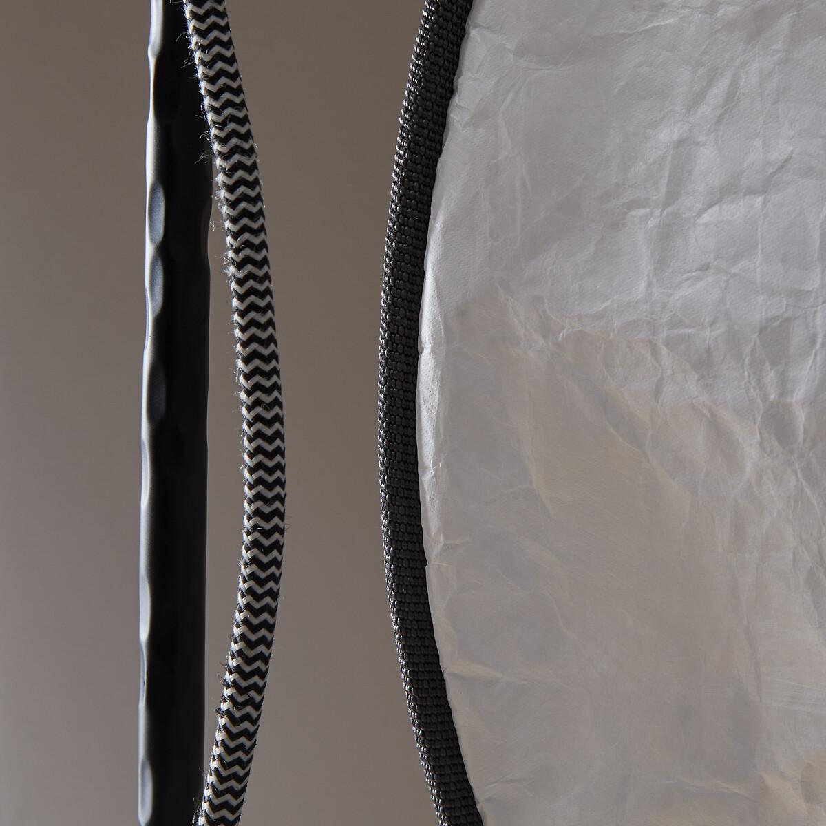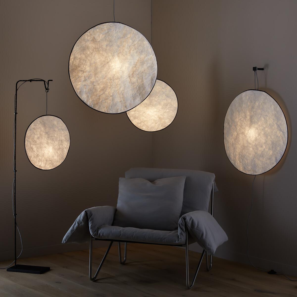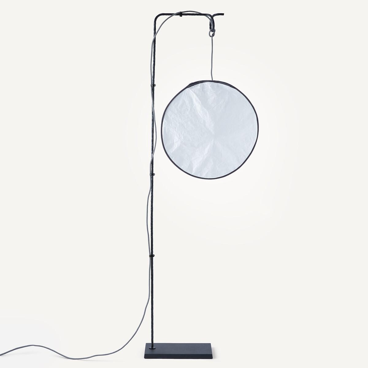 This lamp, evoking the softness of a full moon, is made from Tyvek®, a robust material with a delicate finish reminiscent of paper. Grey fabric piping highlights its round, streamlined silhouette. Available in two sizes, it can be adapted to suit your needs: suspended from the ceiling, fixed to the wall, or hung from a metal stand (for the mini version), thanks to an elegant black and white electric cable. The Moon floor lamp is part of the "Nomad Escape" collection (Évasion Nomade) designed by Otto, an agency founded by architect and designer Paola Navone. Led by Cristina Pettenuzzo and Domenico Diego, this collection has a bold and unique identity, transforming the home into an bright and positive oasis of well-being for all seasons. Product Details • Lampshade in Tyvek®, finished with grey cotton piping hiding a magnetic tab • Internal glass globe • Black and white textile sheathed power cable with plug and switch. Not suitable for use with a dimmer switch • Supports E27 bulb (not supplied) • For bulb (not included):LED 4.2W max • Charcoal hammered iron base • 4 iron clips for securing the power cable to the base Quality Info • A robust material with the look of crumpled paper, Tyvek® is a synthetic non-woven fabric made from polyethylene fibres. Dimensions • Overall dimensions: 32 x 45 x 156.5cm • Shade diameter : 45cm • Internal globe: diameter 10cm • Cable length: 470cm • Dimensions of base: 18 x 31 x 2cm • Height of pole: 156.5 cm • Depth of pole : 31.5cm • Weight: 6.6kg. Dimensions and weight of parcel • 1 parcel • L160 x H40 x D22cm. 10.1kg