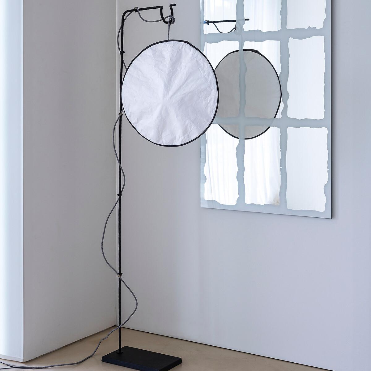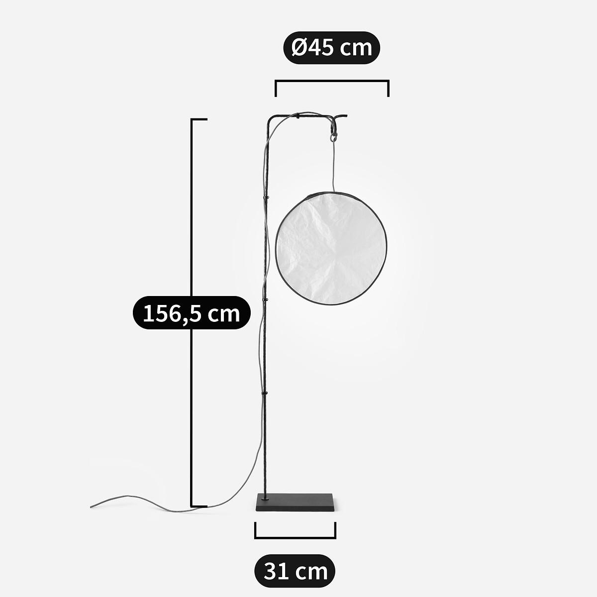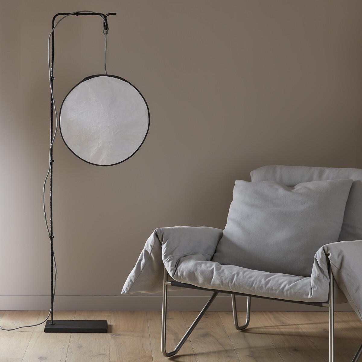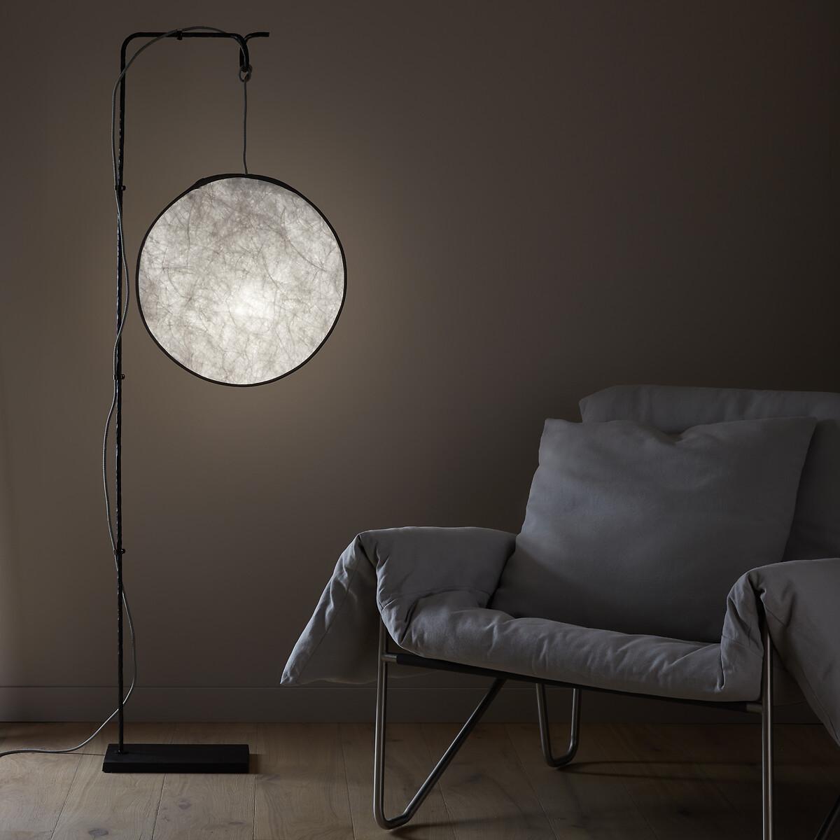 This lamp, evoking the softness of a full moon, is made from Tyvek®, a robust material with a delicate finish reminiscent of paper. Grey fabric piping highlights its round, streamlined silhouette. Available in two sizes, it can be adapted to suit your needs: suspended from the ceiling, fixed to the wall, or hung from a metal stand (for the mini version), thanks to an elegant black and white electric cable. The Moon floor lamp is part of the "Nomad Escape" collection (Évasion Nomade) designed by Otto, an agency founded by architect and designer Paola Navone. Led by Cristina Pettenuzzo and Domenico Diego, this collection has a bold and unique identity, transforming the home into an bright and positive oasis of well-being for all seasons. Product Details • Lampshade in Tyvek®, finished with grey cotton piping hiding a magnetic tab • Internal glass globe • Black and white textile sheathed power cable with plug and switch. Not suitable for use with a dimmer switch • Supports E27 bulb (not supplied) • For bulb (not included):LED 4.2W max • Charcoal hammered iron base • 4 iron clips for securing the power cable to the base Quality Info • A robust material with the look of crumpled paper, Tyvek® is a synthetic non-woven fabric made from polyethylene fibres. Dimensions • Overall dimensions: 32 x 45 x 156.5cm • Shade diameter : 45cm • Internal globe: diameter 10cm • Cable length: 470cm • Dimensions of base: 18 x 31 x 2cm • Height of pole: 156.5 cm • Depth of pole : 31.5cm • Weight: 6.6kg. Dimensions and weight of parcel • 1 parcel • L160 x H40 x D22cm. 10.1kg