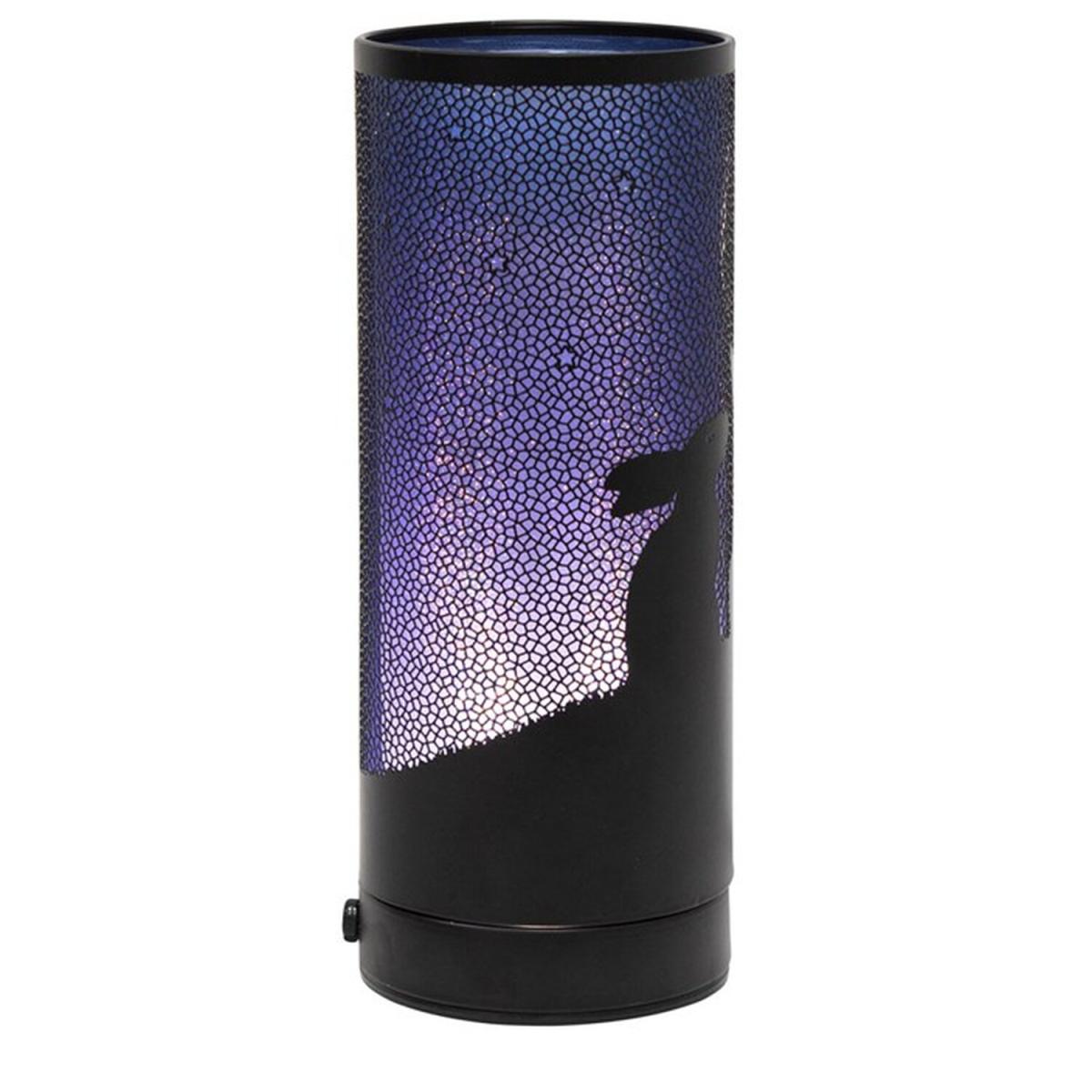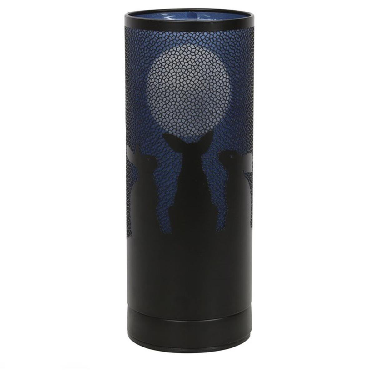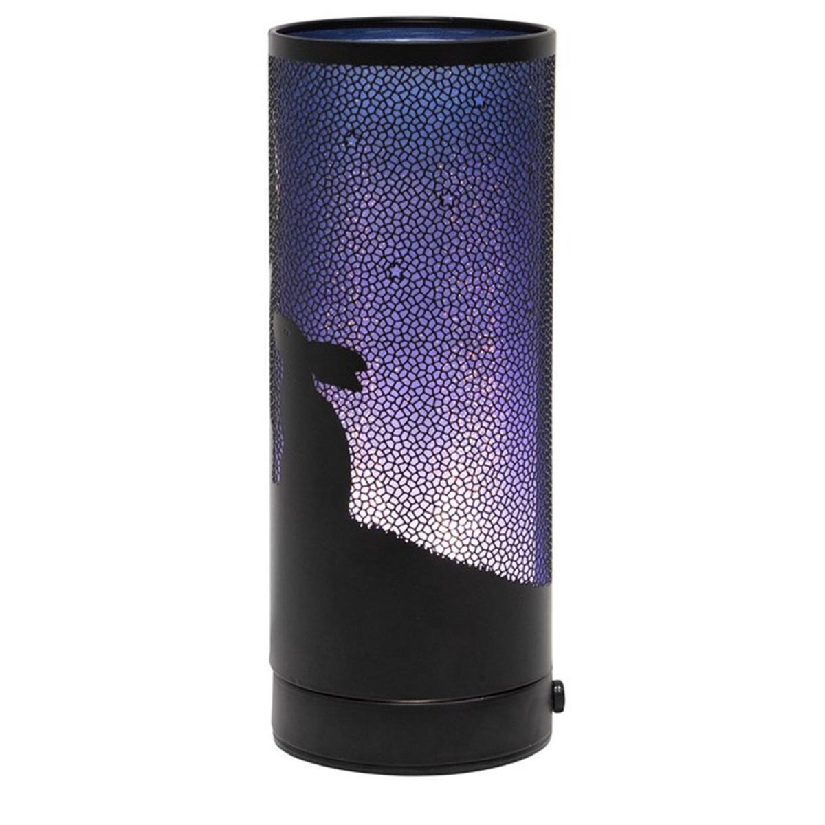 Lisa Parker's stunning 'Moon Gazing Hares' artwork creates the perfect focal point for this aroma lamp. A black silhouette of three hares and a full moon overlays an purple background that is illuminated from behind. Use with fragrance oil or wax melts to gently fragrance the home. LED light and USB plug. Officially licensed.