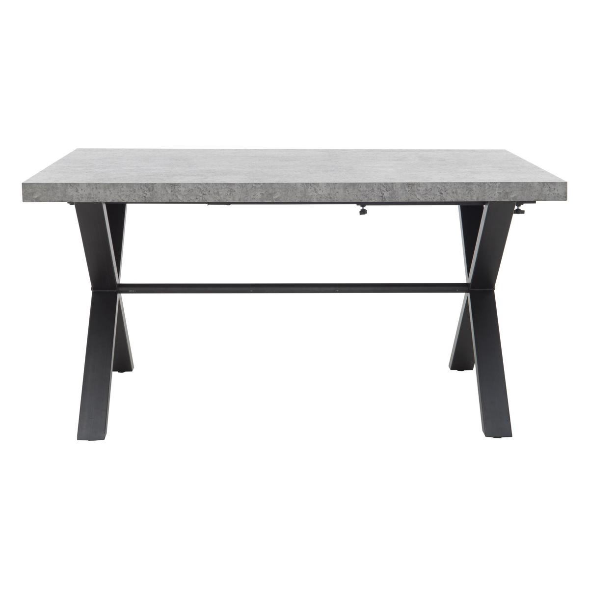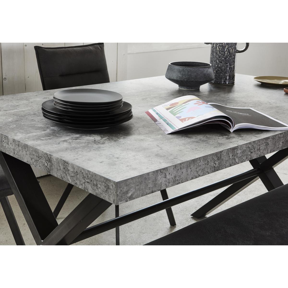 Offering a brand new twist on popular industrial style, Moon features concrete-look table tops, dark grey-painted metal bases and an overall cool and contemporary vibe. This is also a very versatile range – the concrete-effect dining table is extremely hardwearing, equally suited to family mealtimes and stylish dinner parties, and seating options include a dining chair and dining benches beautifully upholstered in dark grey faux leather. Mix and match pieces to create your own perfect dining table and chairs set or choose a ready-made dining set. Fabulous modern style at a fantastic value price. Fantastic concrete-effect table top in fashionable grey. Cool industrial look with dark grey painted metal base. On trend contemporary style with a hardwearing finish. Cool and contemporary, the Moon large dining table features an impressive concrete-effect top in a fashionable grey finish. The on trend industrial style is perfect for a family kitchen diner as well as a stylish contemporary dining room. The grey concrete-style top has real depth to it, and is durable and family friendly. The sturdy X-shaped metal legs are painted dark grey. This 190 cm table seats eight and can be extended by adding one or two Moon dining table extension leaves, available separately. Adding two leaves to the Moon dining table seats a generous twelve. The Moon large dining table is part of the stylish Moon collection of dining room furniture, dining sets and living room occasional pieces. Complete the look by mixing and matching the Moon dining chair, the Moon large dining bench and the Moon small dining bench. On trend statement style at a great value price. Please note. The finish of each concrete-effect table top will display variations and unique markings. This should not be considered a fault. While hard wearing, this finish is not completely heat resistant. Be sure to use coasters and placemats at all times.