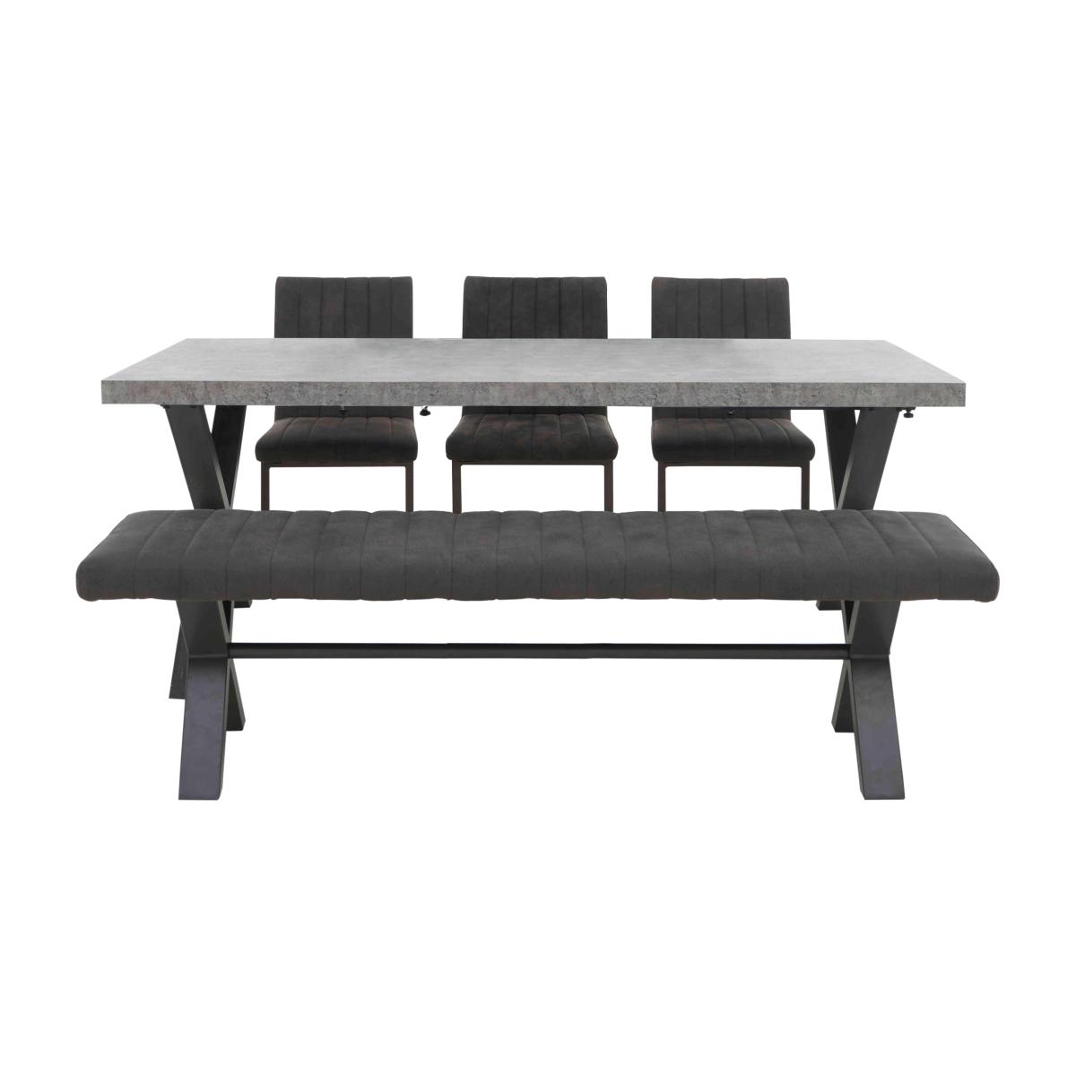 Offering a brand new twist on popular industrial style, Moon features concrete-look table tops, dark grey-painted metal bases and an overall cool and contemporary vibe. This is also a very versatile range – the concrete-effect dining table is extremely hardwearing, equally suited to family mealtimes and stylish dinner parties, and seating options include a dining chair and dining benches beautifully upholstered in dark grey faux leather. Mix and match pieces to create your own perfect dining table and chairs set or choose a ready-made dining set. Fabulous modern style at a fantastic value price. With dining chairs for the adults and a dining bench for the kids – or the other way round – this stylish dining set is extremely versatile. We love that standout concrete-effect table top. Why you'll love it. Great-value dining set is the very definition of contemporary industrial style. The large dining table has a fabulous hardwearing concrete-effect top. Metal base is painted dark grey. With 3 Furniture Village-exclusive cantilever dining chairs and a dining bench. Faux leather upholstery in slate grey with fluting. Black powder-coated metal bases. This dining set is part of the extensive Moon furniture range. What you need to know. Dining chairs and bench have foam cushioning and metal bases. 180 cm bench seats 4 adults. Large dining table seats 8. Seats up to 12 with 2 Moon extension leaves, available separately. The concrete-effect finish of each table top will display variations and unique markings. While hardwearing, this finish is not completely heat resistant. Use coasters and placemats at all times. Easy care – simply wipe with a clean, non-abrasive damp cloth. For more advice, see our Dining Care Guide.