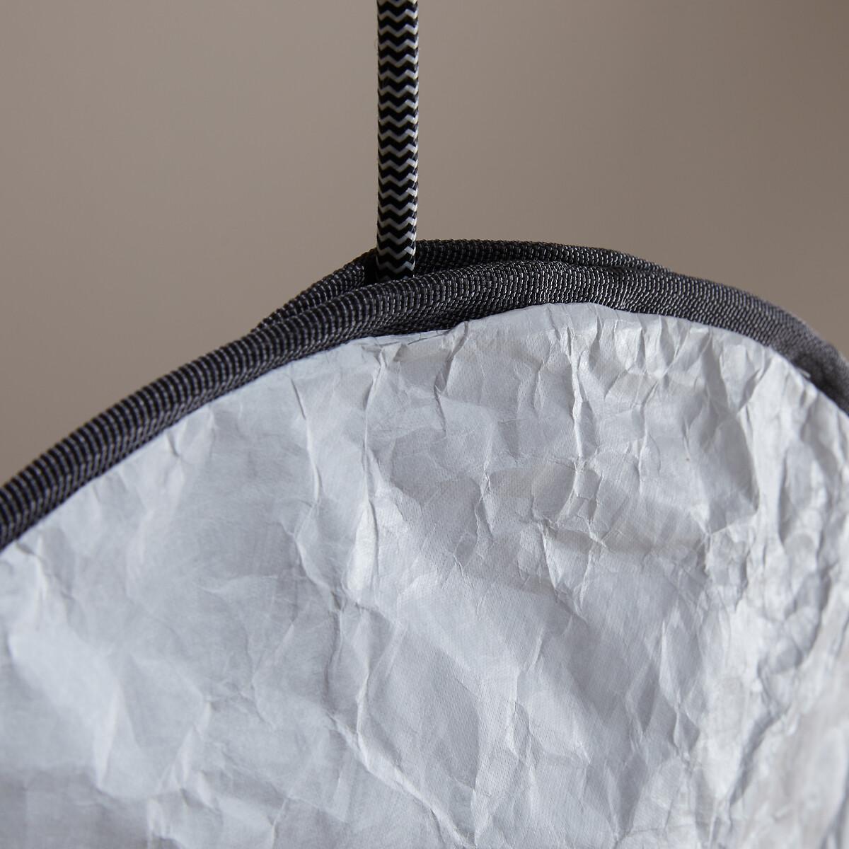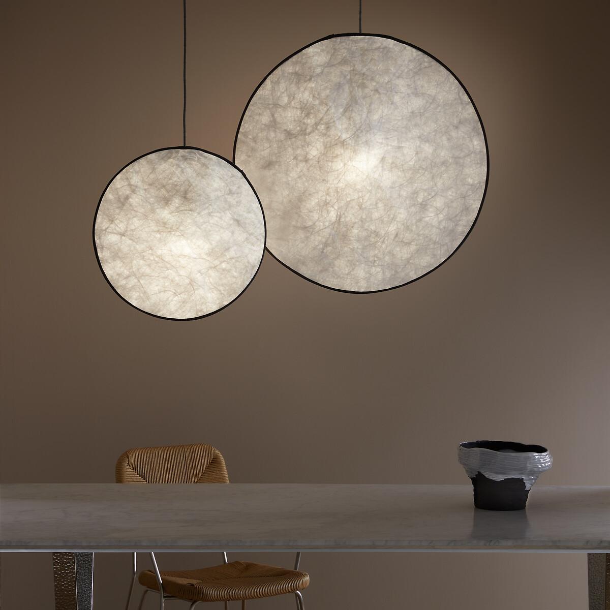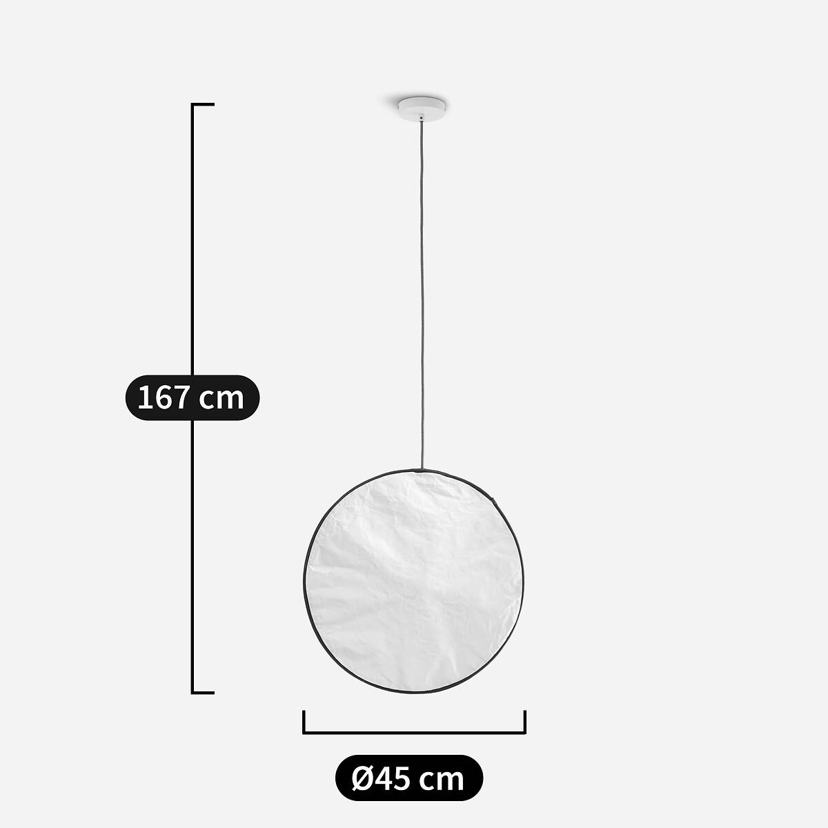 This lamp, evoking the softness of a full moon, is made from Tyvek®, a robust material with a delicate finish reminiscent of paper. Grey fabric piping highlights its round, streamlined silhouette. Available in two sizes, it can be adapted to suit your needs: suspended from the ceiling, fixed to the wall, or hung from a metal stand (for the mini version), thanks to an elegant black and white electric cable. The Moon pendant lamp is part of the "Nomad Escape" collection designed by Otto, the agency founded by architect and designer Paola Navone. Led by Cristina Pettenuzzo and Domenico Diego, this collection has a bold and unique identity, transforming the home into an bright and positive oasis of well-being for all seasons. Product Details • Lampshade in Tyvek®, finished with grey cotton piping hiding a magnetic tab • Internal glass globe • Black and white textile-sheathed power cable • Supports E27 bulb (not supplied) • For bulb (not included):LED 4.2W max • Ceiling mounting plate in white epoxy-finish iron. Quality Info • A robust material with the look of crumpled paper, Tyvek® is a synthetic non-woven fabric made from polyethylene fibres. Dimensions • Diameter: 45cm • Internal globe: diameter 10cm • Cable length: 120cm • Total Height: 167cm • Weight: Weight: 1.5kg. Dimensions and weight of parcel • 1 parcel • L45 x H25 x D17cm. 1.4kg