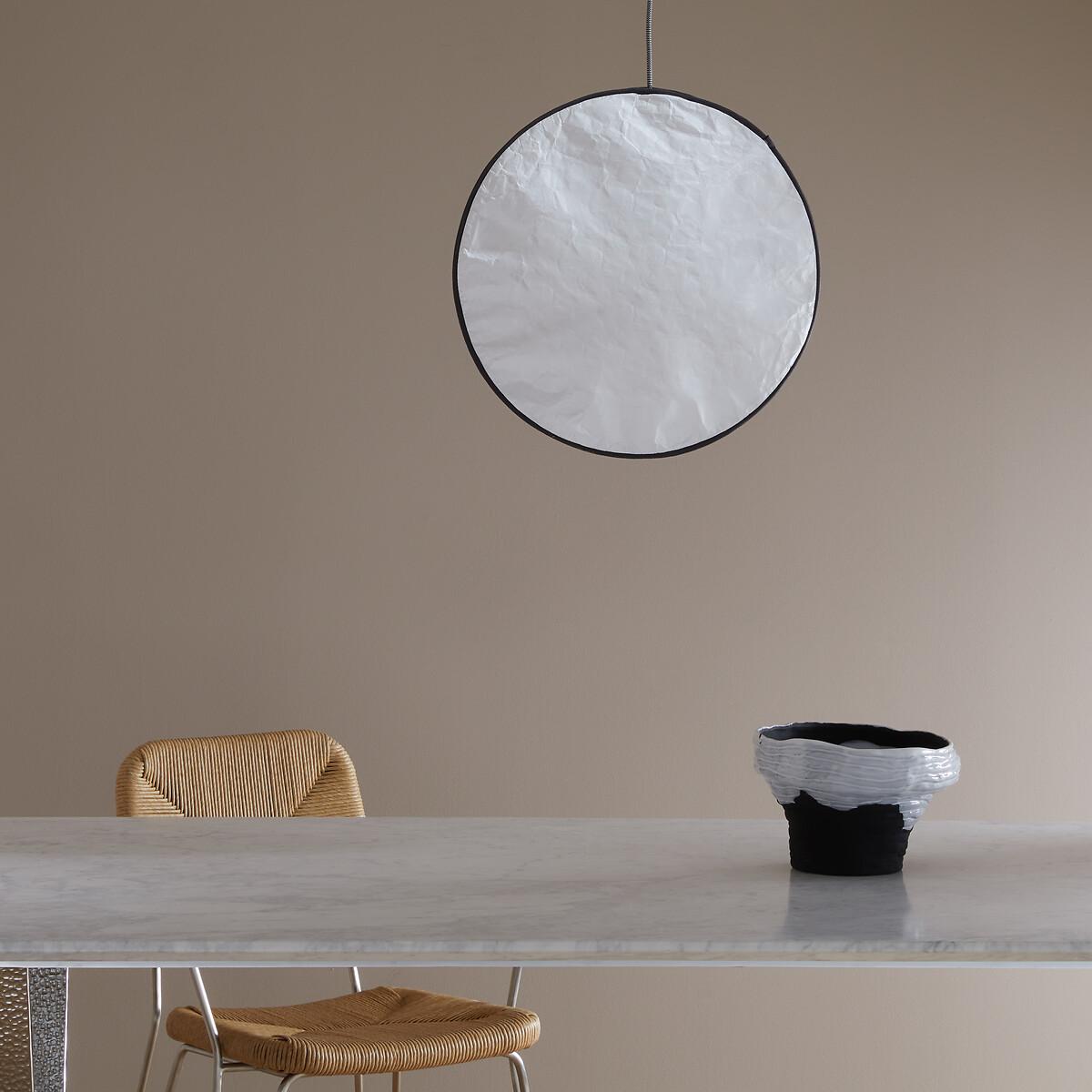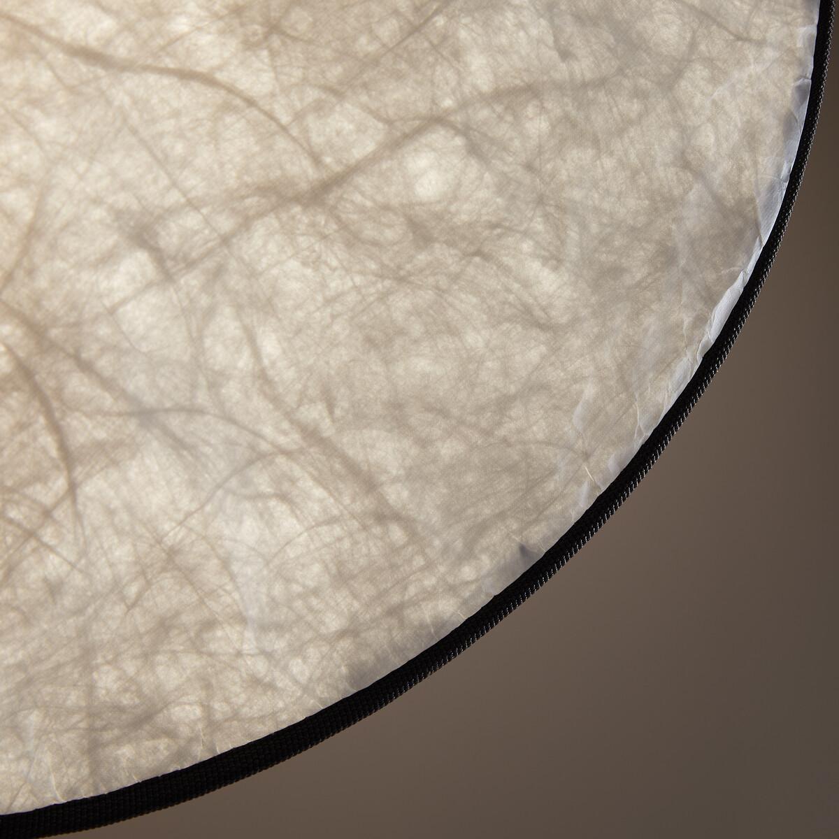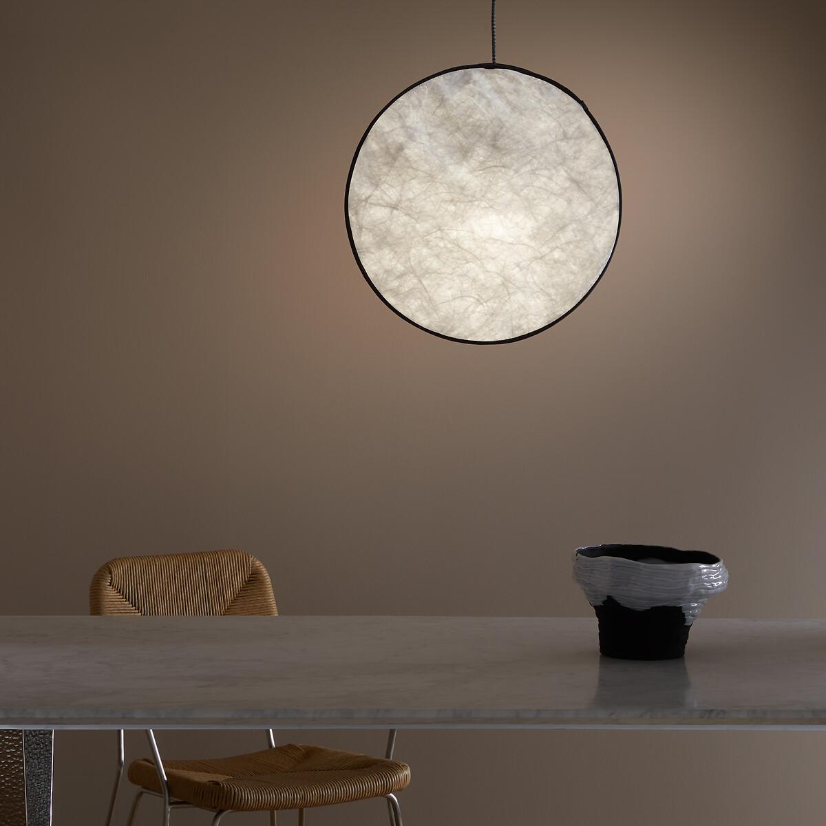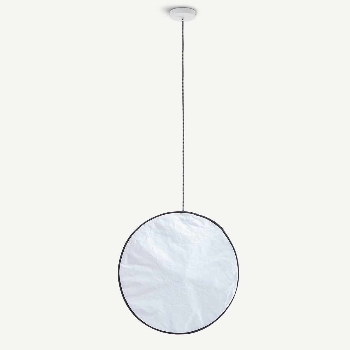 This lamp, evoking the softness of a full moon, is made from Tyvek®, a robust material with a delicate finish reminiscent of paper. Grey fabric piping highlights its round, streamlined silhouette. Available in two sizes, it can be adapted to suit your needs: suspended from the ceiling, fixed to the wall, or hung from a metal stand (for the mini version), thanks to an elegant black and white electric cable. The Moon pendant lamp is part of the "Nomad Escape" collection designed by Otto, the agency founded by architect and designer Paola Navone. Led by Cristina Pettenuzzo and Domenico Diego, this collection has a bold and unique identity, transforming the home into an bright and positive oasis of well-being for all seasons. Product Details • Lampshade in Tyvek®, finished with grey cotton piping hiding a magnetic tab • Internal glass globe • Black and white textile-sheathed power cable • Supports E27 bulb (not supplied) • For bulb (not included):LED 4.2W max • Ceiling mounting plate in white epoxy-finish iron. Quality Info • A robust material with the look of crumpled paper, Tyvek® is a synthetic non-woven fabric made from polyethylene fibres. Dimensions • Diameter: 45cm • Internal globe: diameter 10cm • Cable length: 120cm • Total Height: 167cm • Weight: Weight: 1.5kg. Dimensions and weight of parcel • 1 parcel • L45 x H25 x D17cm. 1.4kg