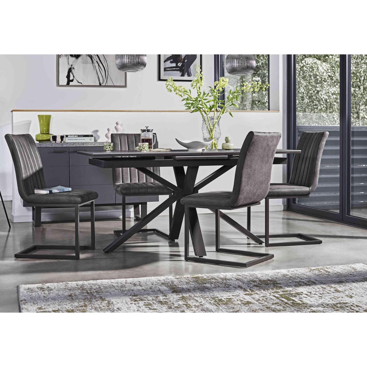 Offering a brand new twist on popular industrial style, Moon features concrete-look table tops, dark grey-painted metal bases and an overall cool and contemporary vibe. This is also a very versatile range – the concrete-effect dining table is extremely hardwearing, equally suited to family mealtimes and stylish dinner parties, and seating options include a dining chair and dining benches beautifully upholstered in dark grey faux leather. Mix and match pieces to create your own perfect dining table and chairs set or choose a ready-made dining set. Fabulous modern style at a fantastic value price. Its super-quick pop-up mechanism makes this extending dining table even more stylish and practical. And we love that hardwearing concrete-look finish. Why you'll love it Style, versatility and value – that’s the Moon pop-up extending dining table. Contemporary industrial design for a really great price. Fabulous hardwearing concrete-effect top. Slick and quick pop-up mechanism extends this table in seconds. Set on a star-shaped dark grey metal base. This pop-up extending dining table is part of the extensive Moon furniture range. What you need to know This table seats 6. Seats 8 when extended. The concrete-effect finish of each table top will display variations and unique markings. While hardwearing, this finish is not completely heat resistant. Use coasters and placemats at all times. Easy care – simply wipe with a clean, non-abrasive damp cloth. For more advice, see our Dining Care Guide.