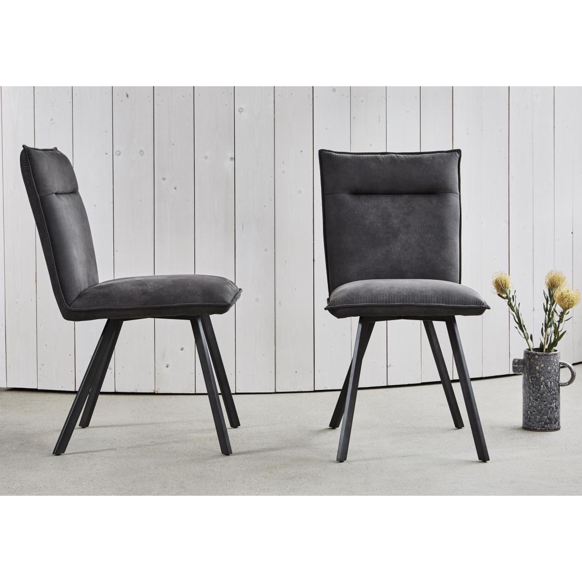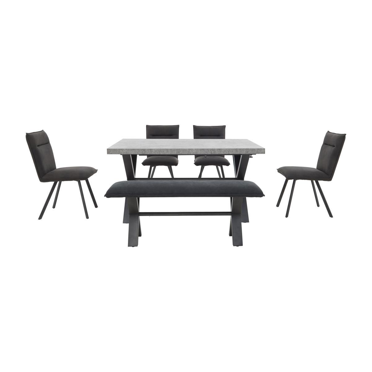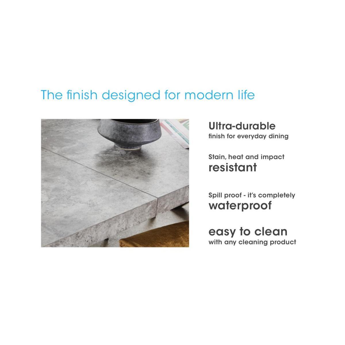 Offering a brand new twist on popular industrial style, Moon features concrete-look table tops, dark grey-painted metal bases and an overall cool and contemporary vibe. This is also a very versatile range – the concrete-effect dining table is extremely hardwearing, equally suited to family mealtimes and stylish dinner parties, and seating options include a dining chair and dining benches beautifully upholstered in dark grey faux leather. Mix and match pieces to create your own perfect dining table and chairs set or choose a ready-made dining set. Fabulous modern style at a fantastic value price. Fantastic concrete-effect dining table with metal base. Dining chairs and bench in faux leather upholstery. On trend contemporary style with a hardwearing finish. For striking style and family-friendly versatility, the Moon dining table, 4 dining chairs and small dining bench set is hard to match. The Moon small dining table is a real showstopper thanks to its beautiful concrete-effect top in fashionable grey. Set on a dark grey-painted X-shaped metal base, this is the perfect table for everyday living and special occasion dinner parties alike. The 150 cm dining table seats four. You can also add a Moon extension leaf, available separately, to seat two extra guests. This set also features the 140 cm Moon small dining bench, which seats two, and four Moon dining chairs. The dining chairs have angled legs and the bench has X-shaped legs, all in dark grey-painted metal. Chairs and dining bench are comfortably cushioned and upholstered in dark grey faux leather finished with top stitching. Chairs feature a single stitched decorative groove in the centre back. The Moon small dining table, 4 dining chairs and small dining bench set is part of the Moon collection at Furniture Village. Please note. The finish of each concrete-effect table top will display variations and unique markings. This should not be considered a fault. While hard wearing, this finish is not completely heat resistant. Be sure to use coasters and placemats at all times.
