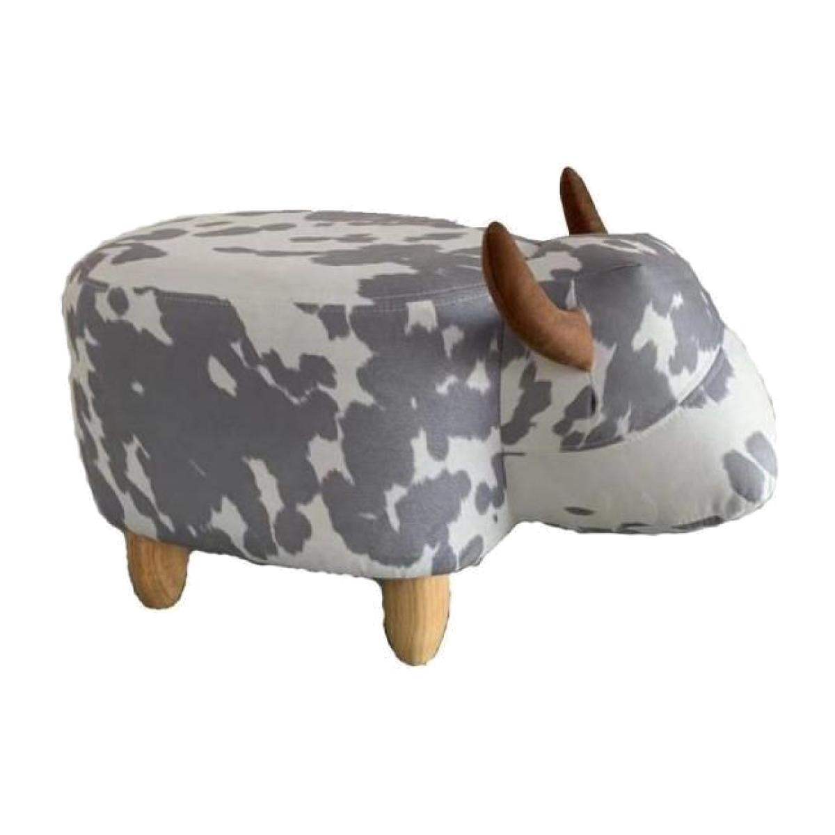 I love this cow-footstool for its playful yet stylish design. It's a great piece for adding a touch of whimsy to contemporary or eclectic interiors, working well in living rooms, kids' rooms, or even a cosy reading nook. The dappled grey pattern keeps it versatile enough to complement neutral palettes or even more colourful schemes. Practical styling tips include pairing it with textured rugs or layered throws to create a cosy corner, or use it as a fun statement piece alongside modern furniture. Its diminutive size makes it perfect for foot-propping or as an extra seat when entertaining, while the earthy wooden legs and small horns introduce natural texture and charm.