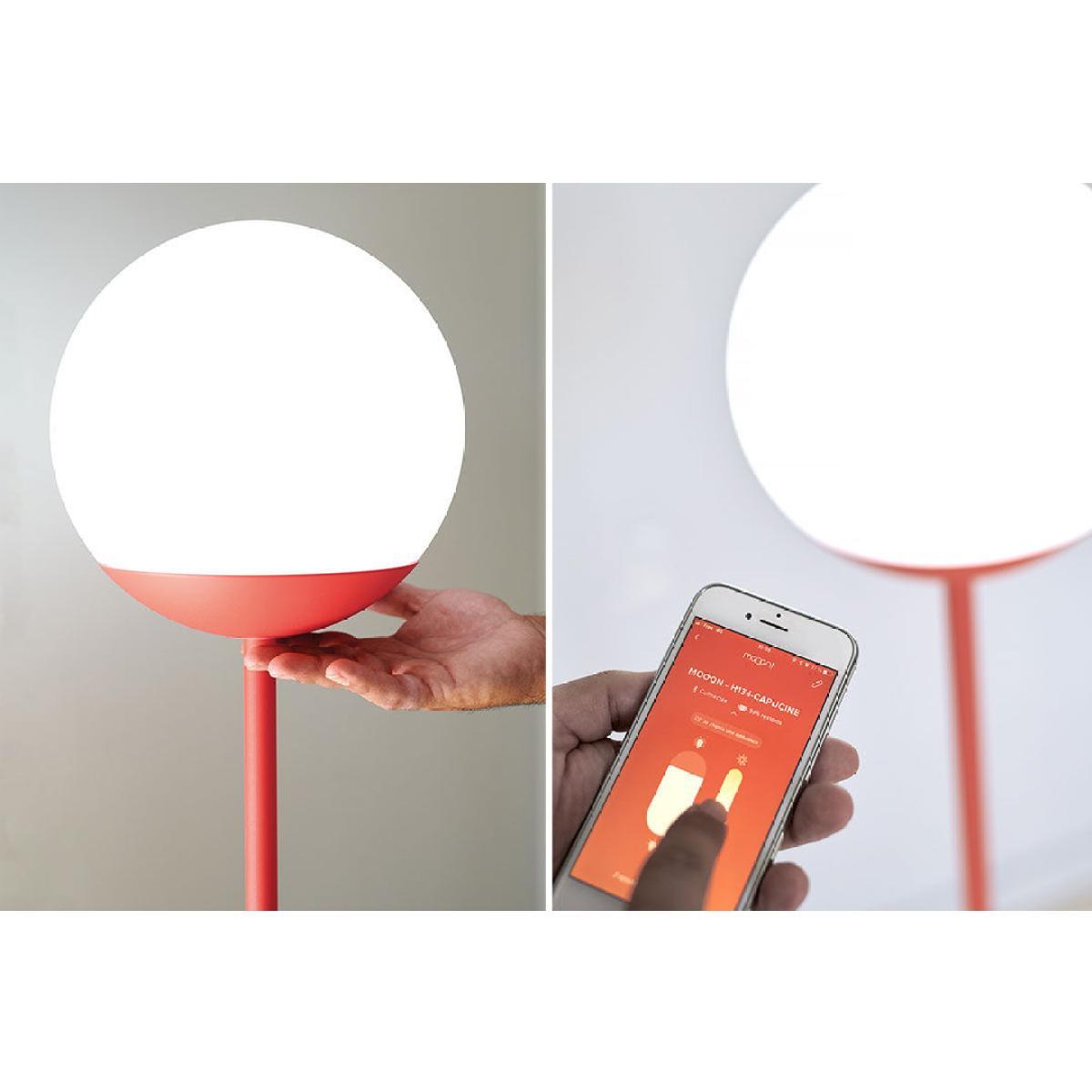 The Mooon cordless family is growing! The work of designer Tristan Lohner, the collection now has a floor lamp with innovative features. Inspired by public street lamps from the 19th century, its form is understated and modern, spiced up with a joyous, fun twist thanks to its range of deep, vivid colours. Ultra-light (5. 4kg) and suitable for outdoor use, it’s a real portable lamp you can move around as you like, from the house to the garden, from your living room to your terrace … The translucent white polyethylene lampshade appears like a bright star perched on its delicate tinted aluminium structure. A strong and obvious presence for this adorable floor lamp which will quickly become your perfect partner for all moments! This cordless light is recharged on its base (provided). With its integrated LED light source, it offers up to 14 hours of battery life for 4 hours of charge. Touch turn-on located under the sphere lets you choose the temperature of the light (warm or cold) with two possible intensities. These two temperatures create two different lighting moods: the "warm white’" lighting (yellow hue) is very warm, while the "cold white" lighting (blue hue) shows the surrounding colours with greater precision. A true concentration of innovation, this lamp is equipped with embedded technology with Bluetooth, which lets you change the ambience remotely via an app on your smartphone.