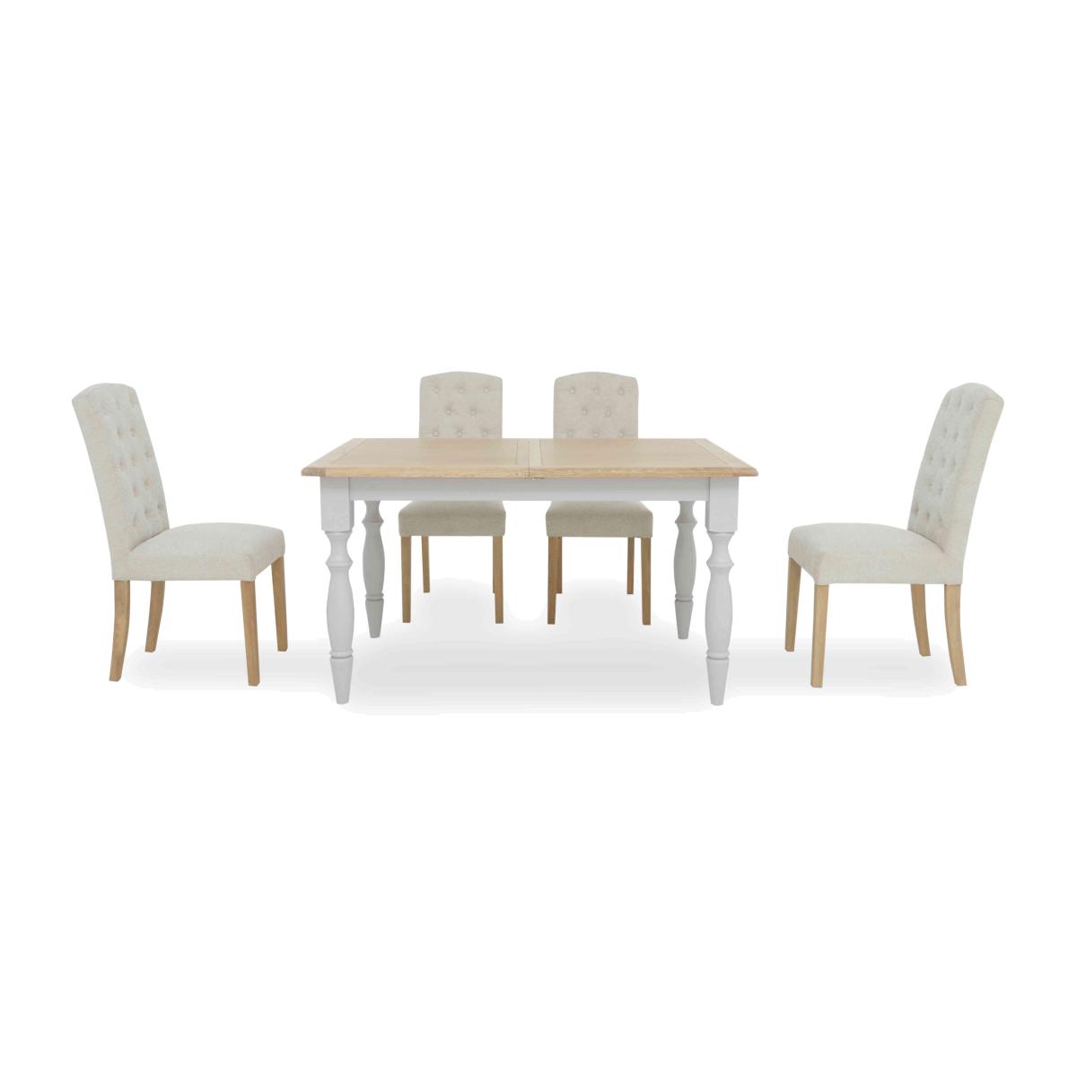 Timeless, elegant and the very essence of modern country design, our Moore collection marries style and versatility to perfection. Pieces have a natural wood and soft grey painted finish that fits – beautifully – into all settings from chic modern country dining rooms to cosy farmhouse kitchens to elegant oak-floored living spaces. And this extensive range is incredibly functional too, providing everything you could possibly need for your stylish dining room, living room and even kitchen. Choose from an inspiring selection of dining sets, dining chairs, sideboards, occasional tables and TV units. Moore is exclusively available at Furniture Village. Timeless and elegant, this modern country dining set rises to the occasion – whatever the occasion. The extending table is paired with four high-back buttoned dining chairs. Why you'll love it Elegant modern country style in a timeless oak and painted finish. Expertly crafted contemporary design with incredible attention to detail. The table top is made of characterful natural oak and has a lovely panelled effect. Frame and turned wood legs are painted in a soft grey. With a hidden extra leaf and easy to use mechanism, this table extends in seconds. Choose small or large extending dining table. This dining set comes with 4 dining chairs. Fully upholstered with high backs and buttoning. A Furniture Village exclusive. This dining set is part of our Moore range. What you need to know 140 cm small dining table seats 4 to 6 closed and 6 to 8 when extended. 180 cm large dining table seats 6 to 8 closed and 8 to 10 when extended. Table is crafted from oak, oak veneer and pine. Dining chairs have solid oak legs and foam cushioning. Natural wood surfaces will show variation in colour. Knots, filled knots and other markings are to be expected. Painted finish is hardwearing but may chip if knocked. Dust with a lint-free cloth. Do not use silicon-based furniture polish. Avoid placing in direct sunlight or close to a heat source. We recommend using placemats and coasters at all times. Shop our extensive Moore range for lots more living room and dining room furniture.