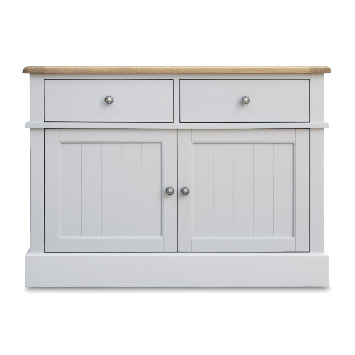 Timeless, elegant and the very essence of modern country design, our Moore collection marries style and versatility to perfection. Pieces have a natural wood and soft grey painted finish that fits – beautifully – into all settings from chic modern country dining rooms to cosy farmhouse kitchens to elegant oak-floored living spaces. And this extensive range is incredibly functional too, providing everything you could possibly need for your stylish dining room, living room and even kitchen. Choose from an inspiring selection of dining sets, dining chairs, sideboards, occasional tables and TV units. Moore is exclusively available at Furniture Village. Small is beautiful – and elegant, well-crafted and practical. This compact sideboard has cupboard and drawer storage as well as a wood and painted modern country finish. Why you'll love it Elegant modern country style in a timeless oak and painted finish. Expertly crafted contemporary design with incredible attention to detail. Top is made of characterful natural oak with a lovely panelled effect. Frame is painted a soft grey. Cupboards doors have tongue and groove-effect door fronts. Doors and drawers have pewter-effect handles. A Furniture Village exclusive. This small sideboard is part of our Moore range. What you need to know 2 drawers, 1 double-door cupboard with a shelf. Crafted from oak, oak veneer and pine. Natural wood surfaces will show variation in colour. Knots, filled knots and other markings are to be expected. Painted finish is hardwearing but may chip if knocked. Dust with a lint-free cloth. Do not use silicon-based furniture polish. Avoid placing in direct sunlight or close to a heat source. We recommend using placemats and coasters at all times. Shop our extensive Moore range for lots more living room and dining room furniture. WARNING!
