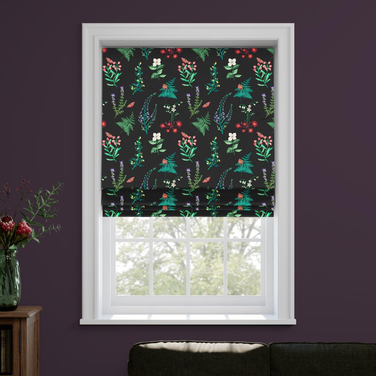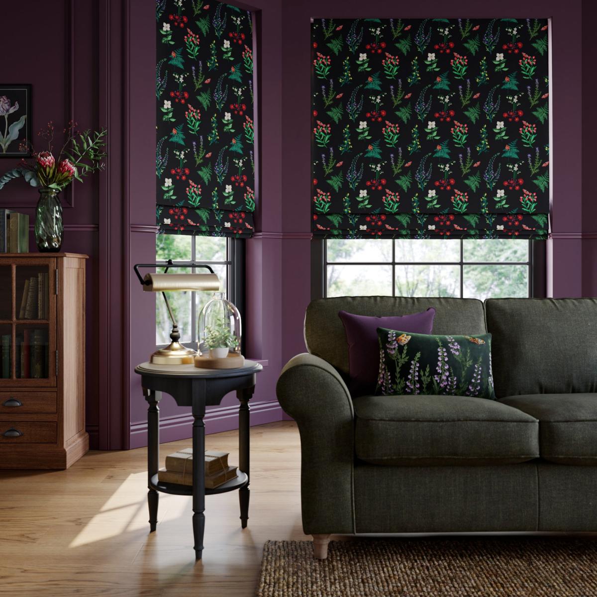 In collaboration with the Natural History Museum* Rich and Luxurious, velvet composition* Delicate floral design inspired by Moorland Plants and flowers* Choose from 3 linings* Select your fitting type* Pick a side for the operating chain* Coordinating Made to Measure and Made to Order items available to purchase separately Experience the richness of Moorland Velvet Made-to-Measure Roman Blinds, part of a stunning collaboration with the Natural History Museum. Inspired by plants and flowers of British and Irish moorlands, these blinds are crafted from a luxurious velvet composition, offering a soft, opulent touch. Customise your blinds with three lining options, your preferred fitting type, and your choice of operating chain side. Matching Made-to-Measure and Made-to-Order items are also available for a coordinated and sophisticated interior. Natural History Museum x Dunelm This range is part of the Moorlands collection. The wild and rugged expanses of moorland habitats have been a rich source of inspiration to poets, playwrights and authors for generations. While they may at first glance appear desolate, in fact they support an array of specialist wildlife, from red deer and mountain hares to birds of prey such as hen harriers and merlins. Often dominated by heather, moorlands are also characterised by low-growing shrubs, grasses and bog-mosses often on damp peaty soils. Bog-mosses or Sphagnum form ‘living carpets’ that absorb vast amounts of carbon, so it is vitally important that we protect these habitats. Through our collection with the Natural History Museum, we want to draw attention to these incredible landscapes, treasured by walkers and wildlife enthusiasts alike. © The Trustees of the Natural History Museum, London 2025. All Rights Reserved. Choosing your lining:* Blackout provides minimal light disturbance in your home making it perfect for bedrooms. * Thermal helps to keep the warmth in and the cool air out meaning it’s great for family rooms or lounges. * Our Standard Lining is perfect if you like the glow of natural light whilst your curtains are closed whilst still maintaining your privacy. Choosing your fitting type:* Inside the recess: this gives a tidy, snug finish as it’s made to fit your window exactly. * Outside the recess: this option is great if you don’t want the blind to be visible from the outside when it’s drawn up. Choosing which side you’d like the operating chain:* Think about where your blind will be situated and what furniture may be near it – choose the side that is easier for you to access. Need help deciding or measuring? Book a free appointment with one of our consultants! dunelm. com/category/made-to-measure/book-an-appointment). Child Safety:We add clips to the back of our roman blinds to attach the cords to the fabric. They also double up as a child safety feature. If pressure is exerted the clips will detach to prevent the risk of strangulation. Please read our [Blinds Safety Guide](https://www. dunelm. com/info/buying-guides/blinds-safety-guidance) for more information. If the clips detach accidentally during normal use, they can be easily re-clipped back into place. Please note: If your measured width is over 130cm your blinds may come with a fabric join to provide the full width required.
