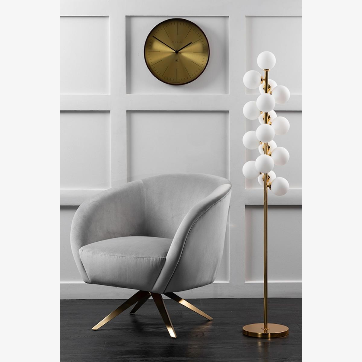 Statement floor light inspired by glamorous 1970s interiors. Steel with electroplated brass finish. 16 x frosted glass spheres create a diffused yet practical light source. 5W LED G4 bulbs provided (suitable for use only with this type of bulb, the use of other bulb types may damage the light).