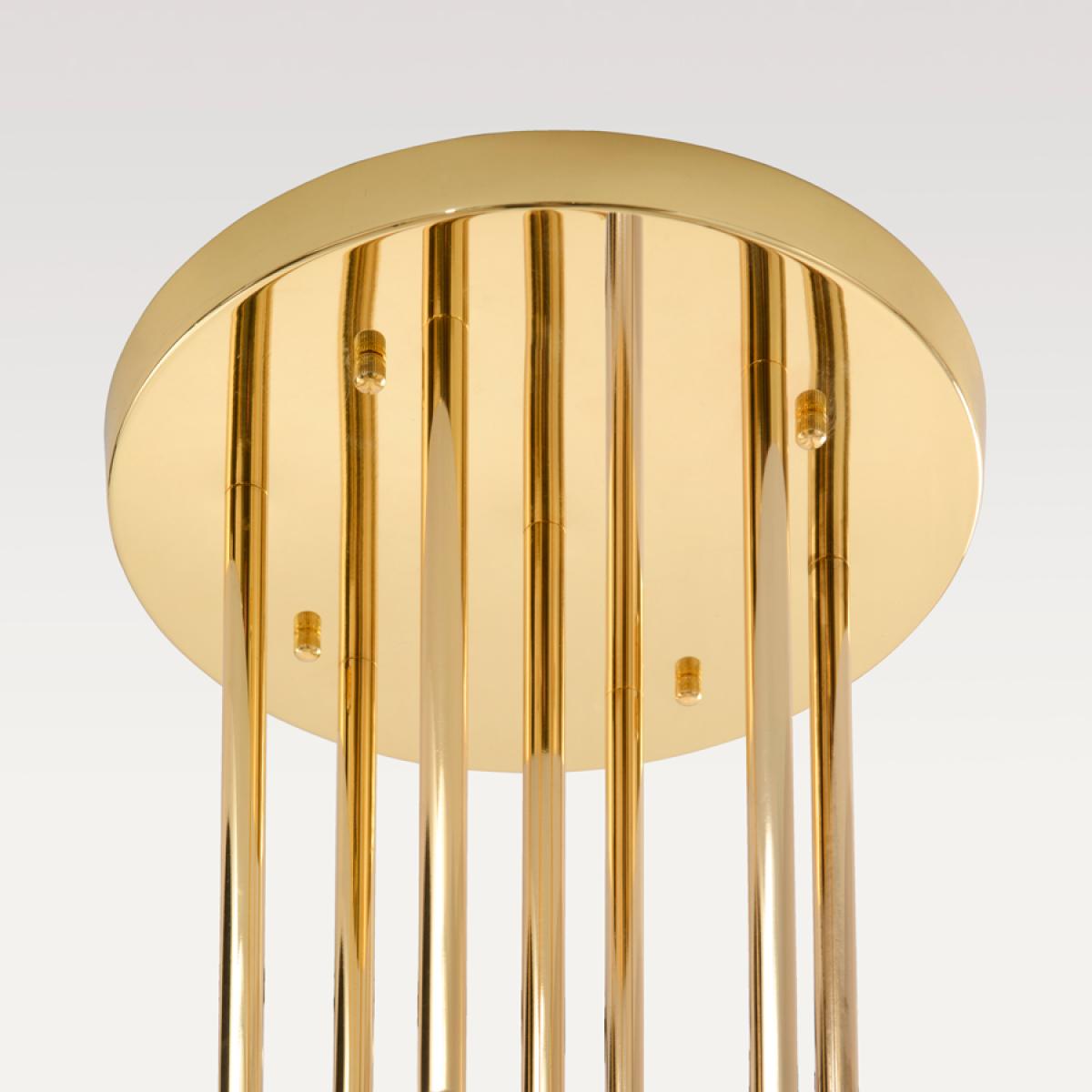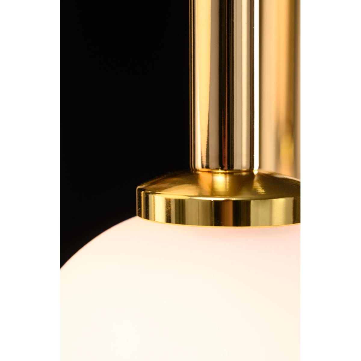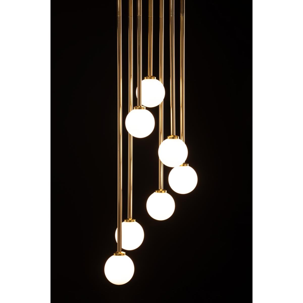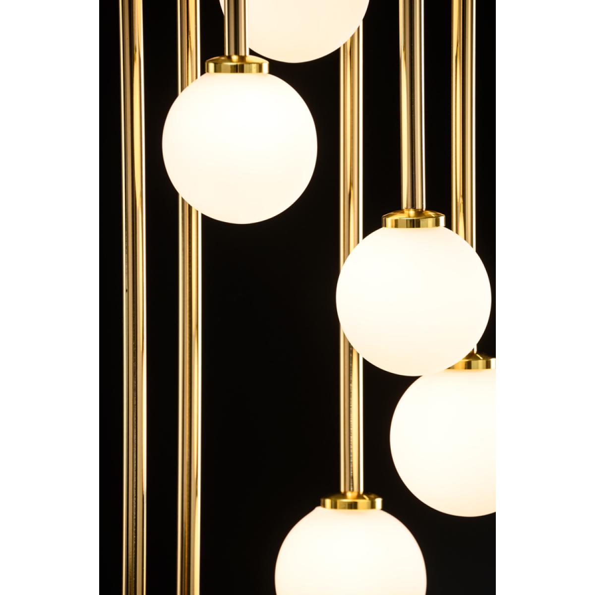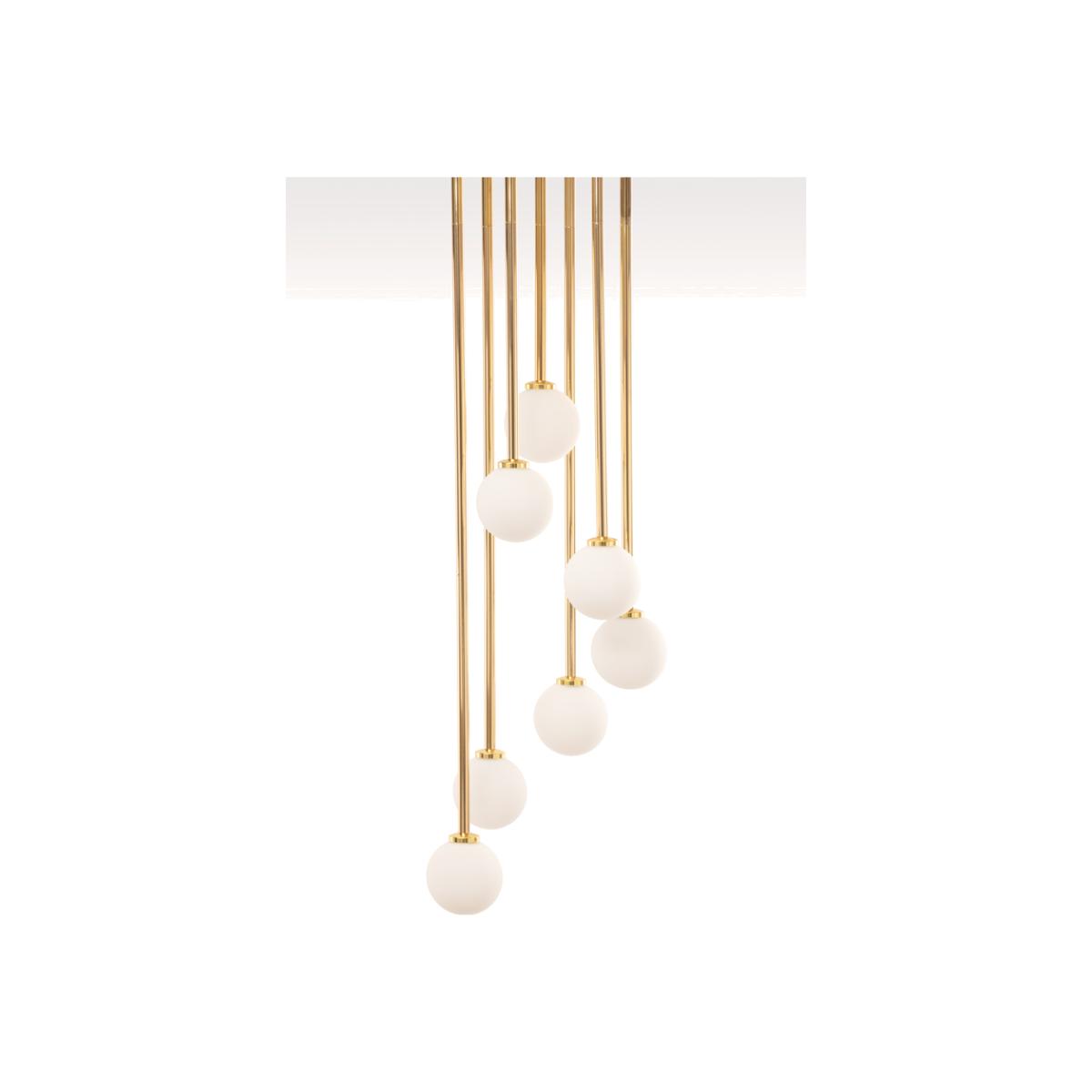 Large contemporary statement pendant light inspired by glamorous 1970’s interiors. Steel with electroplated brass finish. Frosted glass spheres create a diffused yet practical light source. Height adjustable prior to installation. Perfect for a dramatic hallway entrance. 7 x G4-LED non dimmable bulbs included. IMPORTANT! suitable for use only with this type of bulb, the use of other bulb types may damage the light.