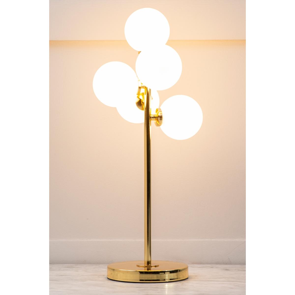Statement table light inspired by glamorous 1970’s interiors. Steel with electroplated brass finish. 5 x frosted glass spheres create a diffused yet practical light source. 5W dimmable LED G4 bulbs provided ( suitable for use only with this type of bulb, the use of other bulb types may damage the light).