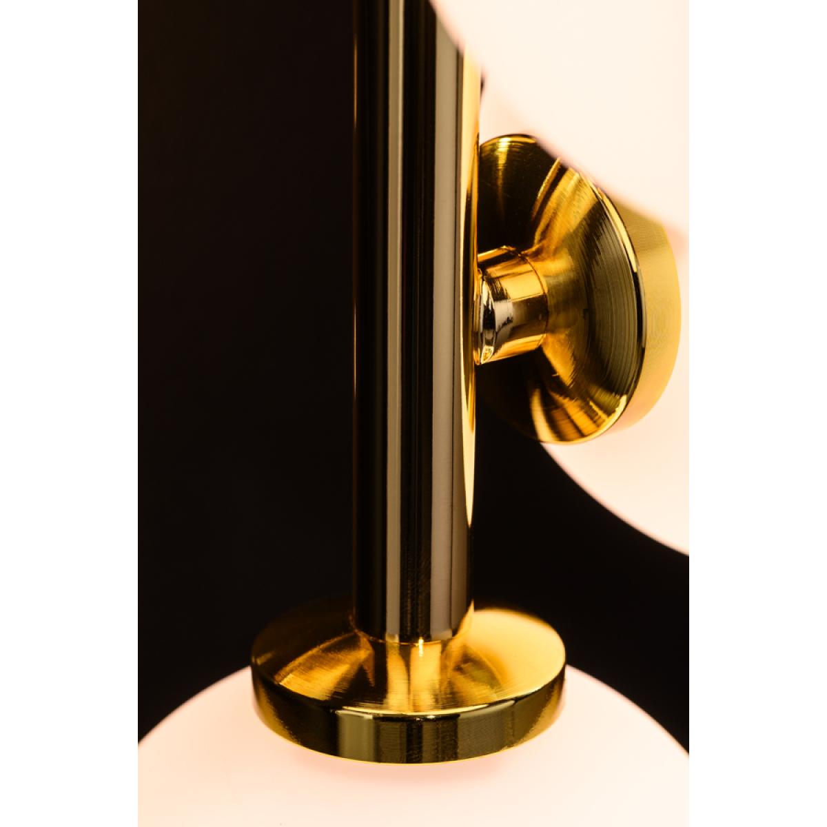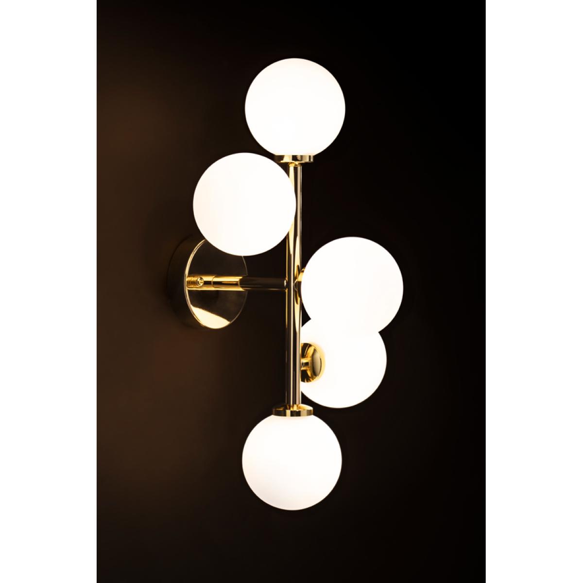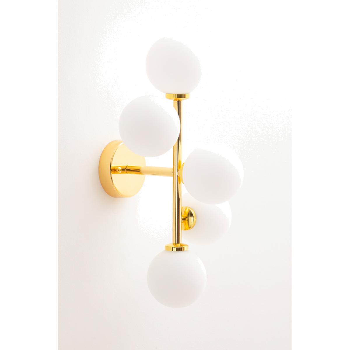 Contemporary statement wall light inspired by glamorous 1970’s interiors. Steel with electroplated brass finish. Frosted glass spheres create a diffused yet practical light source. Perfect to display in pairs. 5 x G4-LED non dimmable bulbs included. IMPORTANT!. Suitable for use only with this type of bulb, the use of other bulb types may damage the light.