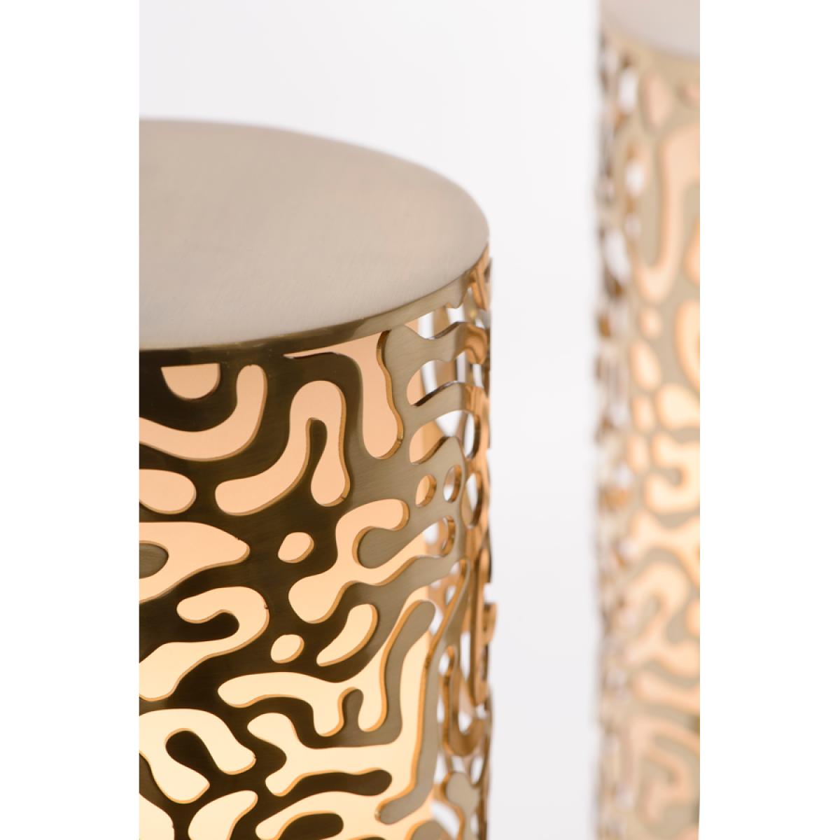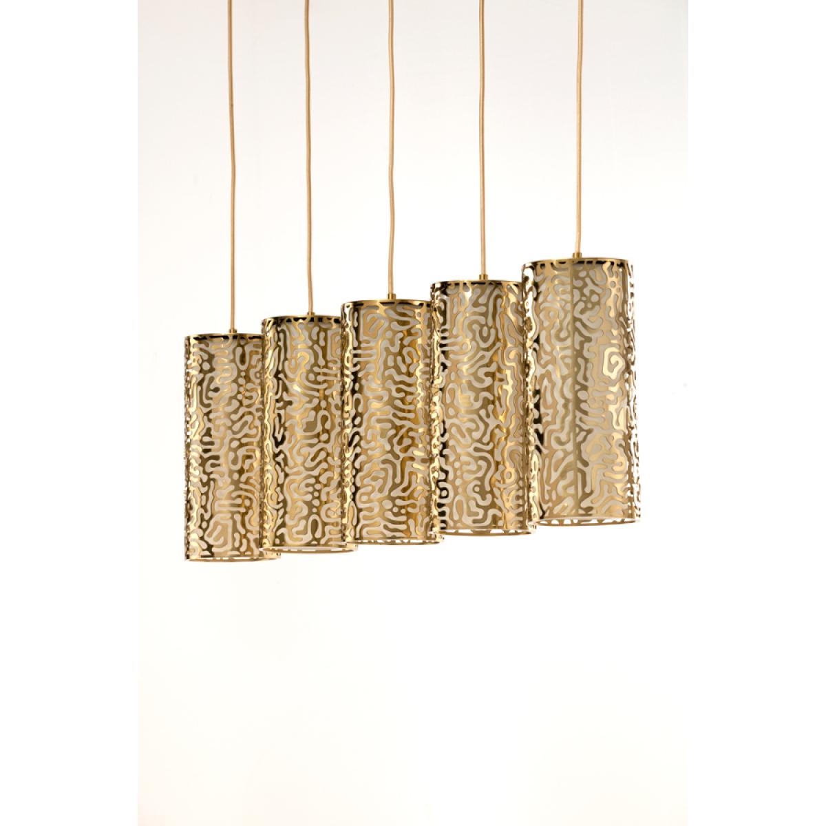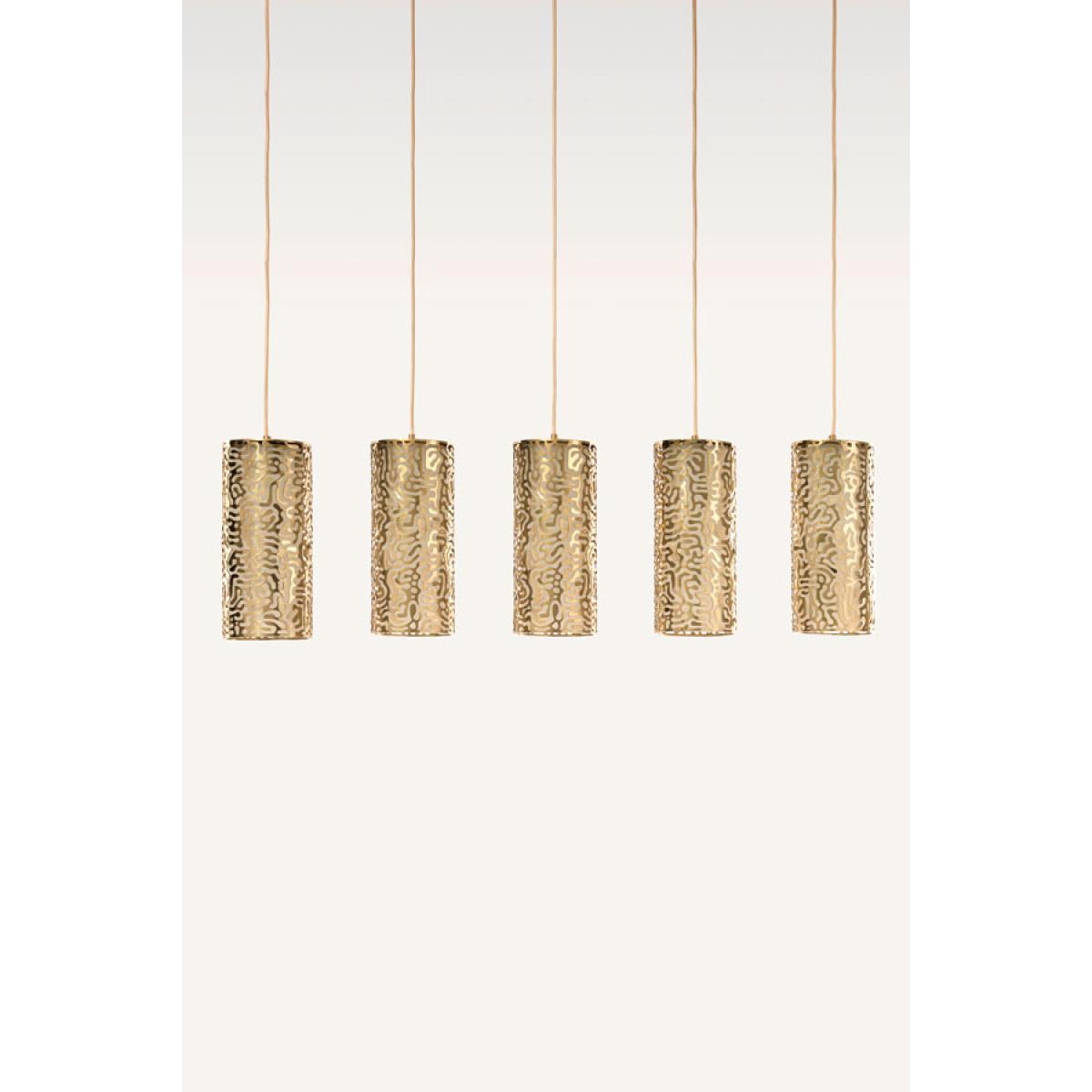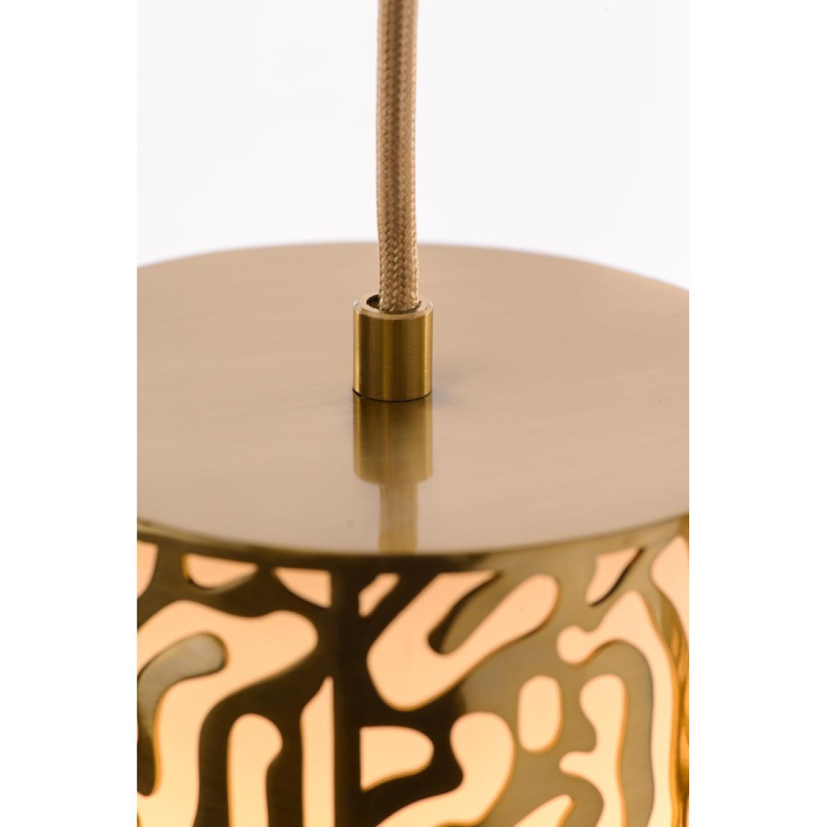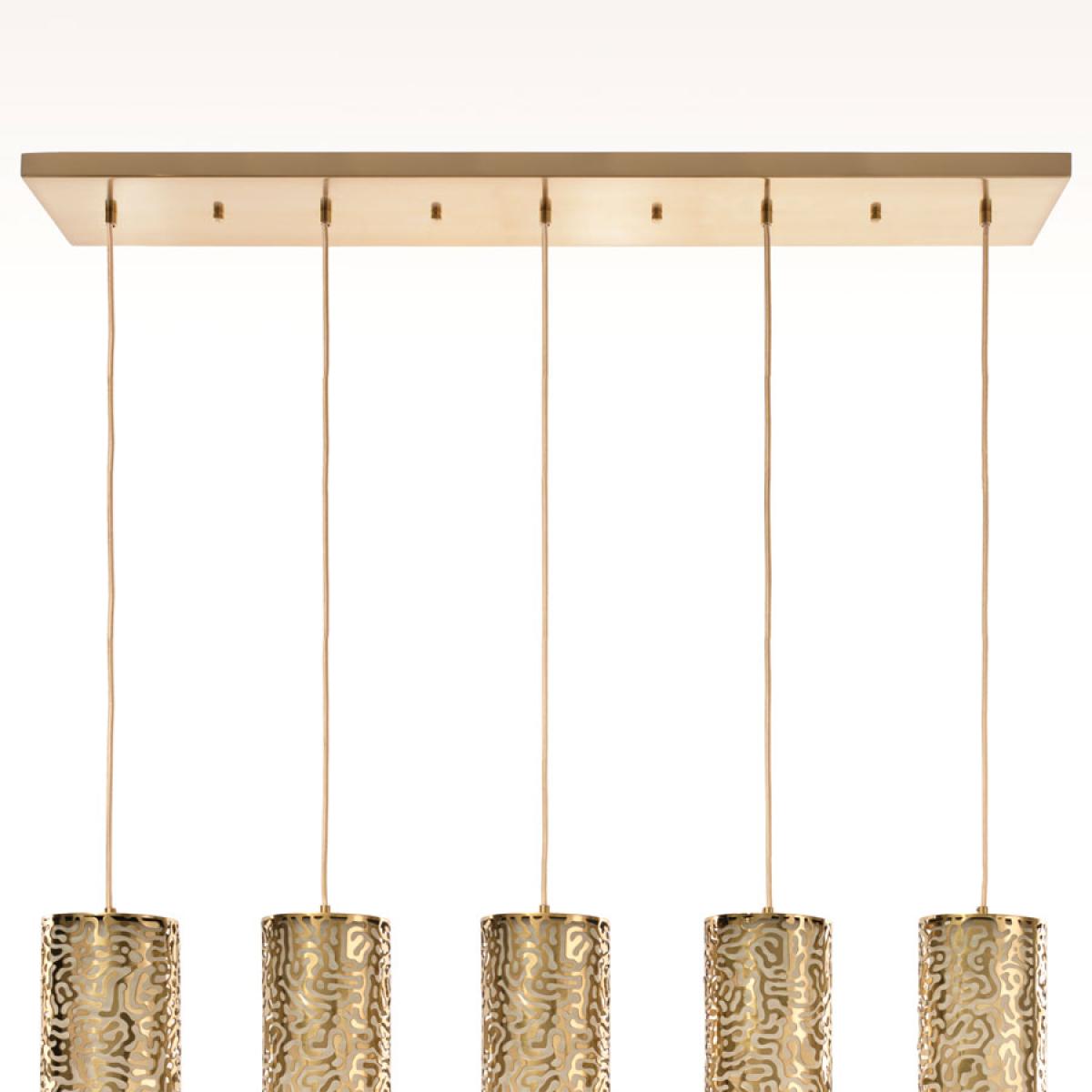 A striking and distinctive pendant light. Laser cut stainless steel with an organic abstract pattern inspired by the intricate markings of a Moray Eel with a brushed brass finish. Frosted glass diffuser to create a soft ambient light effect. Perfect to hang over a kitchen island or a dining table. Height adjustable prior to installation. Supplied with 5 x E14 LED non dimmable bulbs.