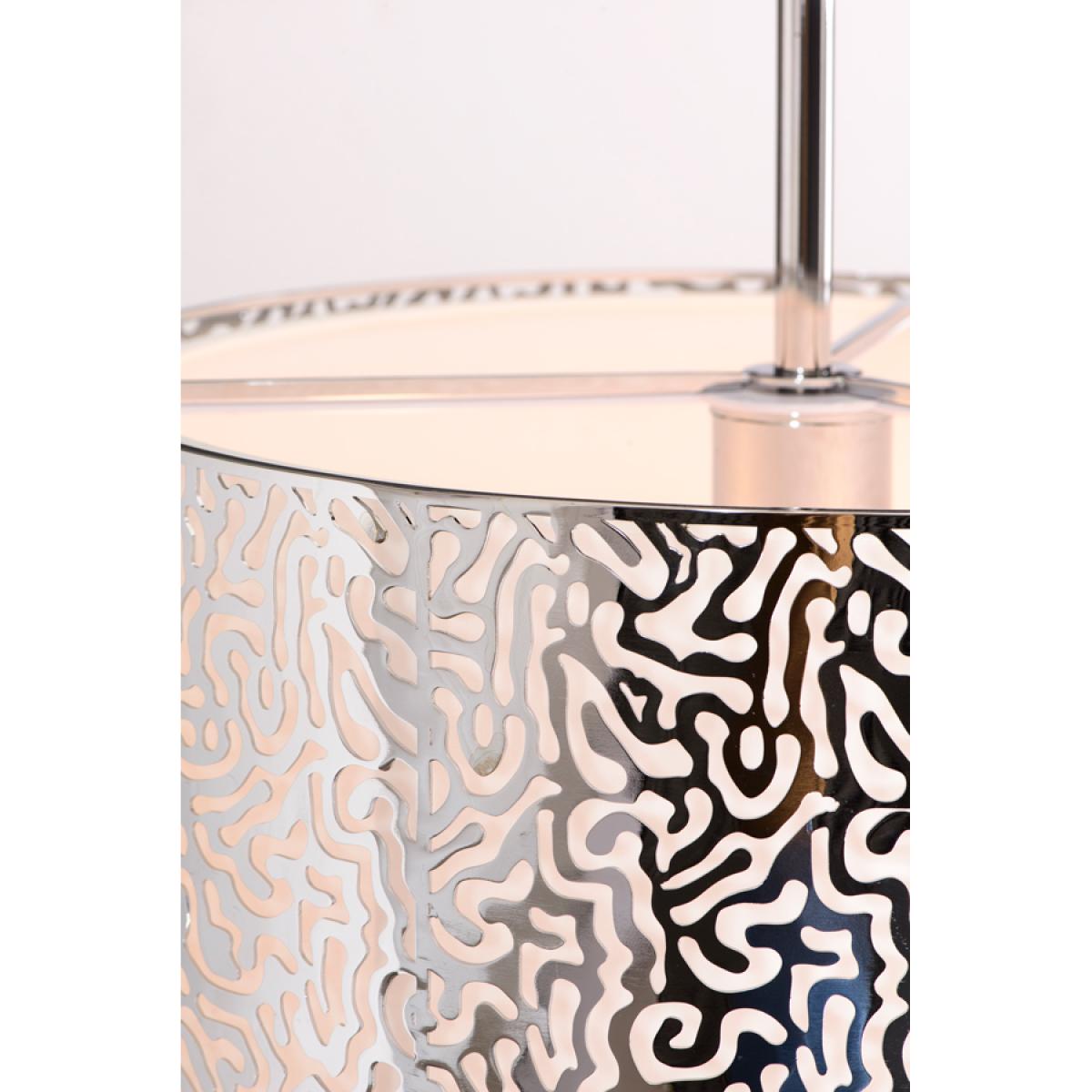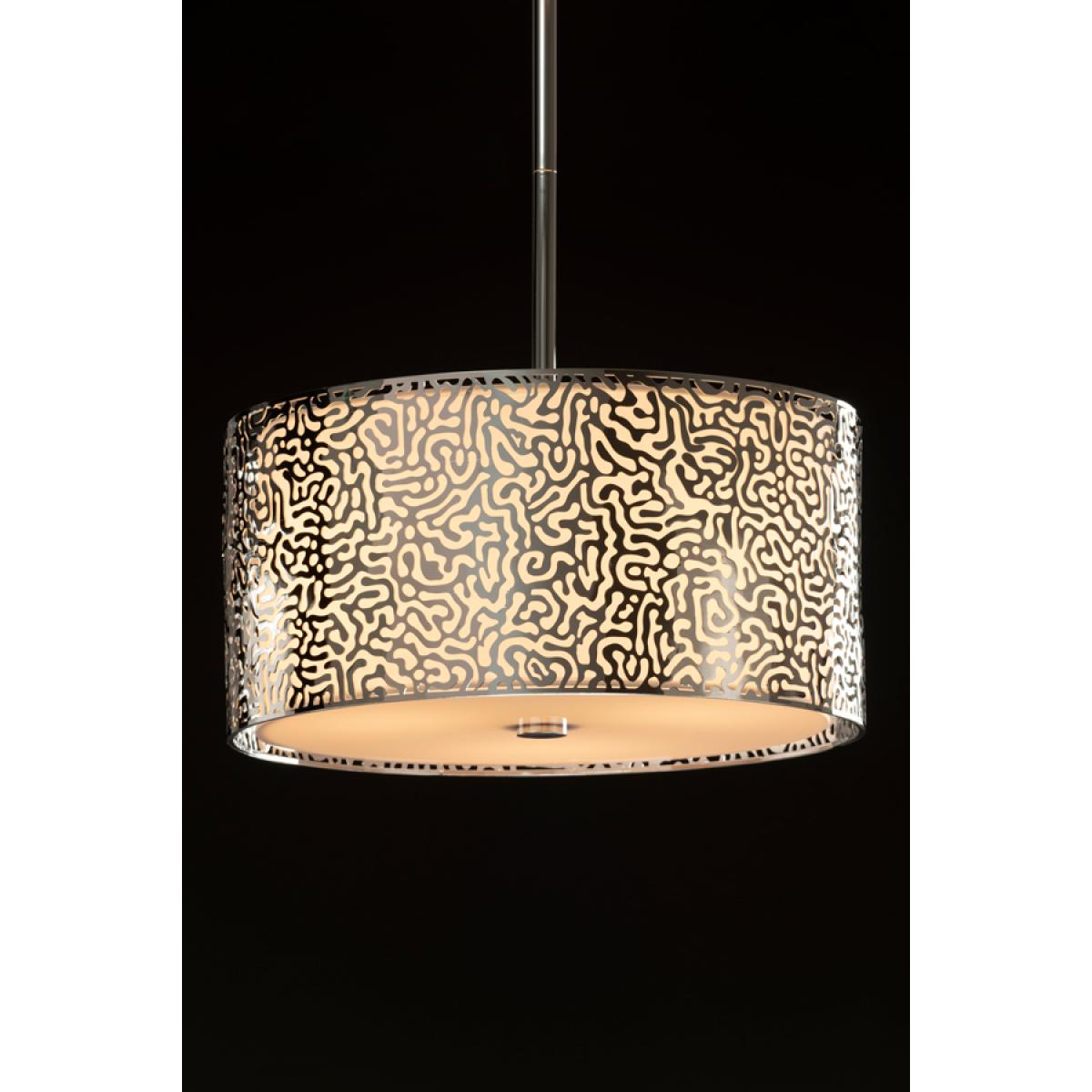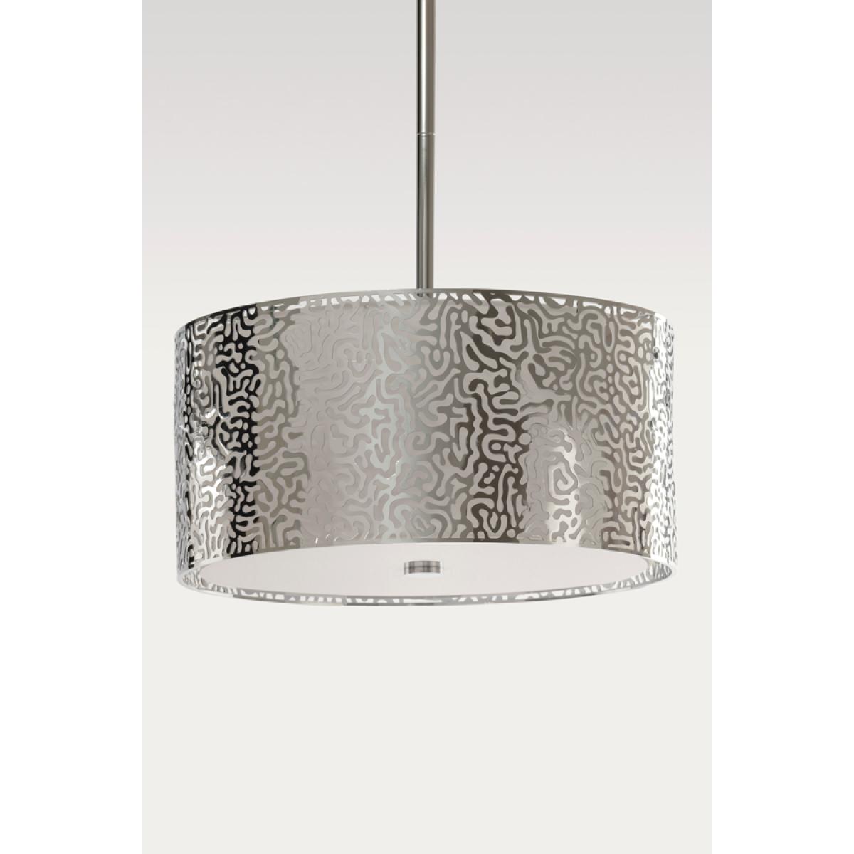 A striking and distinctive pendant lightLaser-cut stainless steel with an organic abstract pattern inspired by the intricate markings of a Moray Eel with a polished chrome finishFrosted acrylic diffuser to create a soft ambient light effectPoly cotton shade in whitePerfect to create a focal point in any interiorHeight adjustable prior to installationSupplied with 3 x G50 E14 bulbs