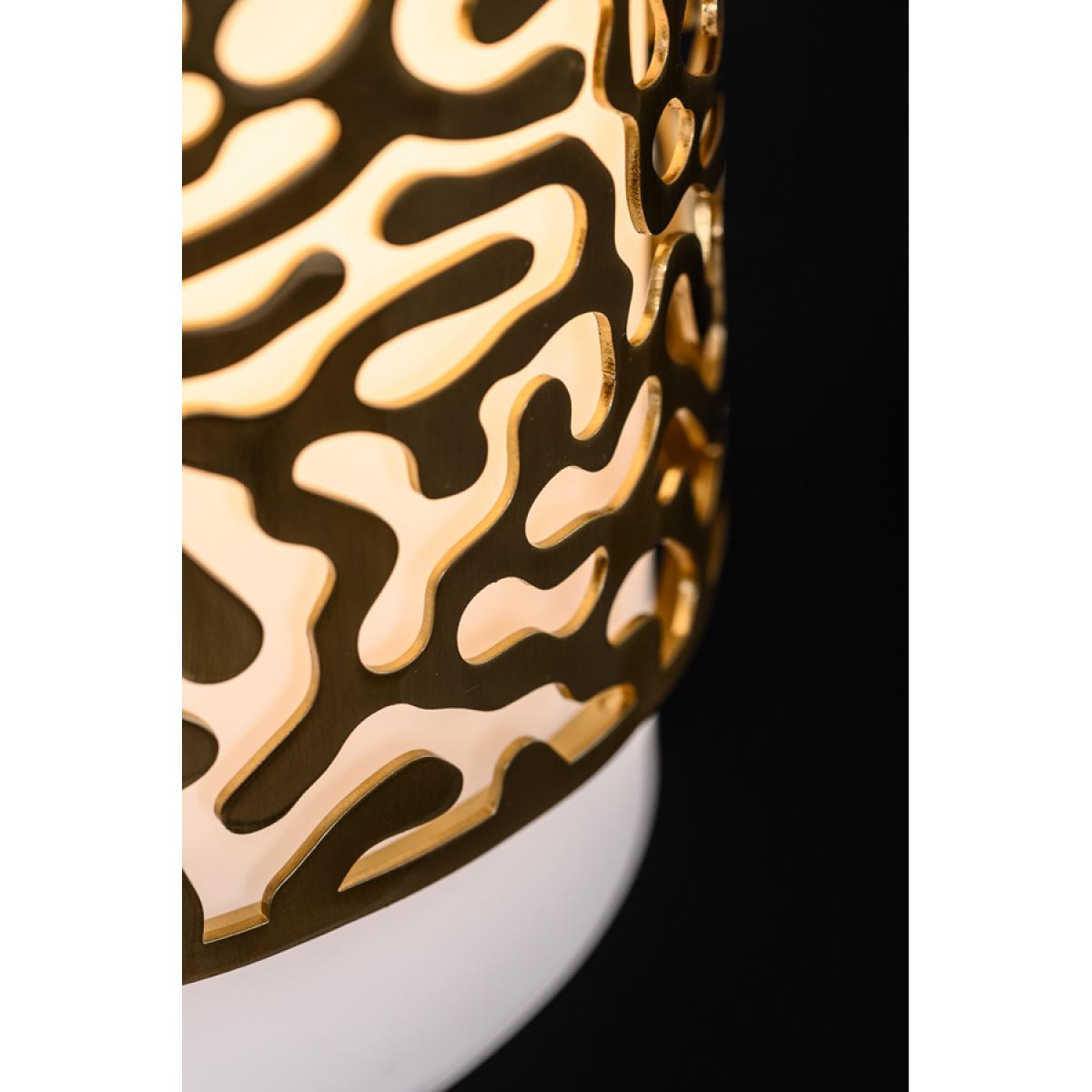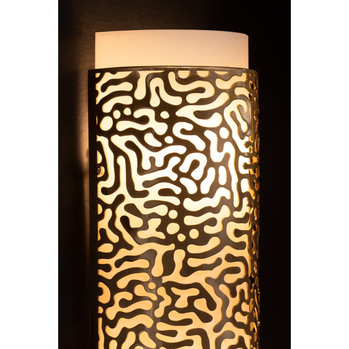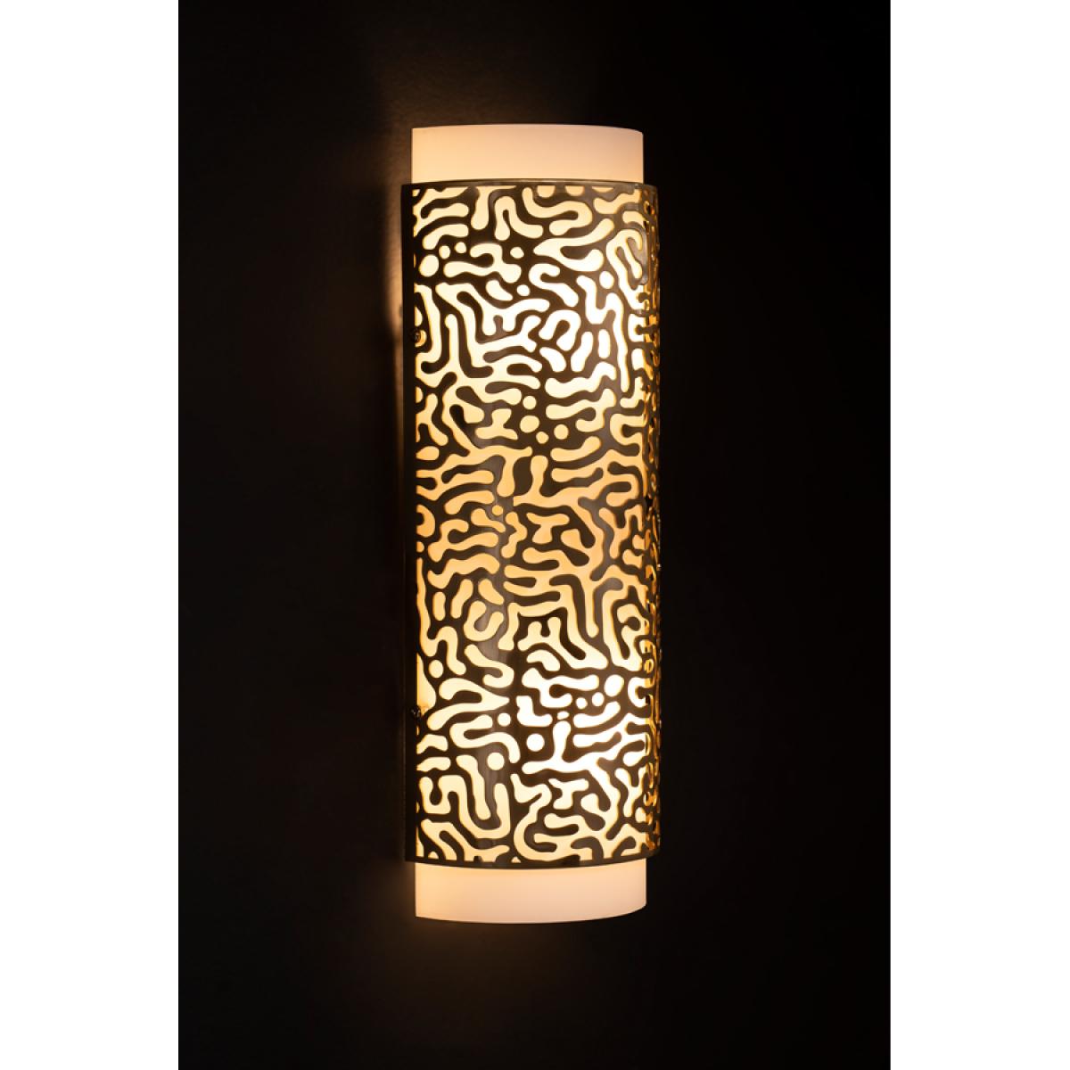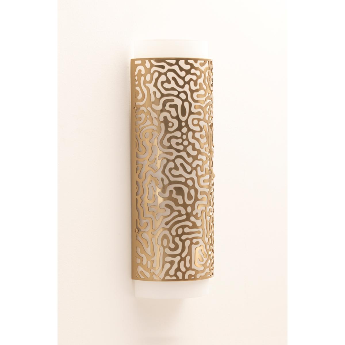 A striking and distinctive wall light. Laser cut stainless steel with an organic abstract pattern inspired by the intricate markings of a Moray Eel with a brushed brass finish. Frosted glass diffuser to create a soft ambient light effect. Perfect to display in pairs. Supplied with 2 x E14 LED non dimmable bulbs.