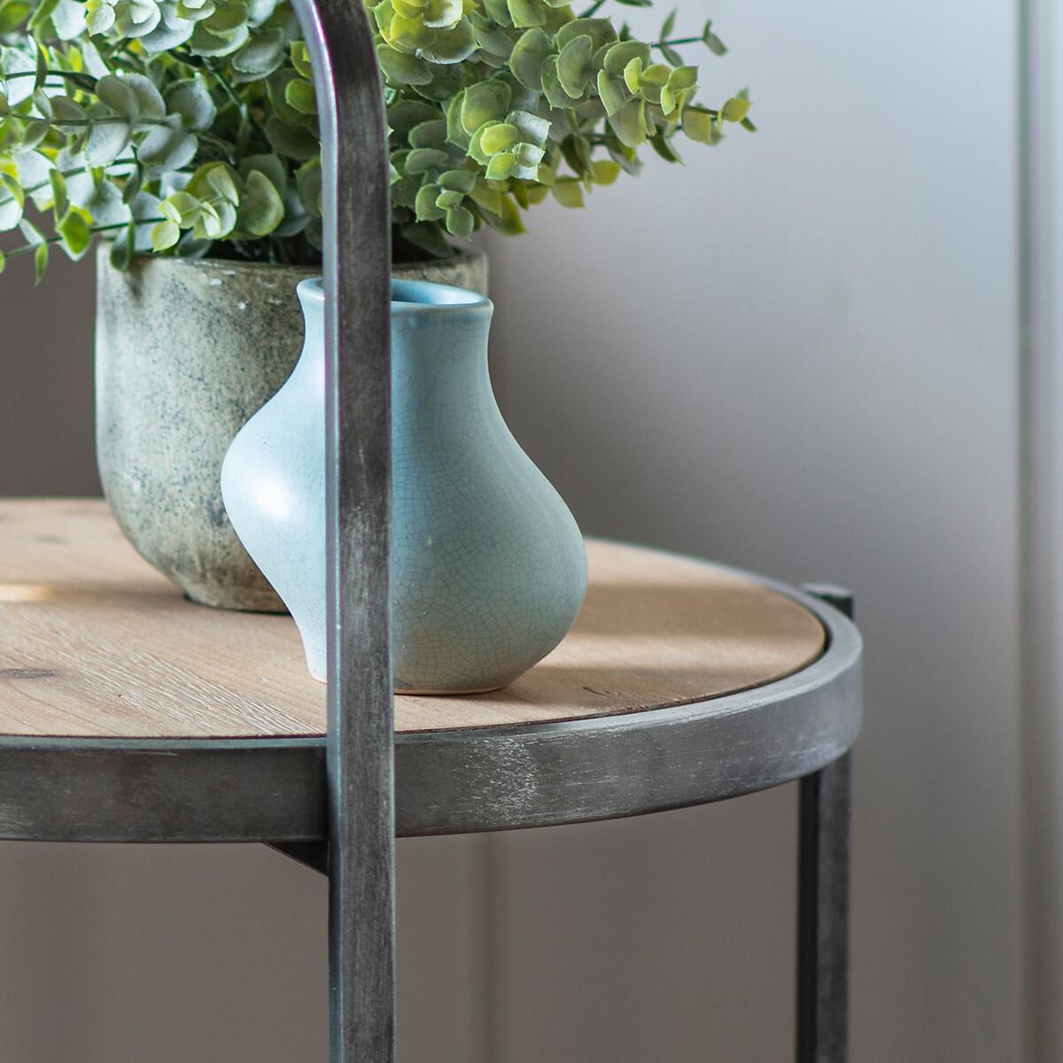 Contemporary side table with shelf crafted from metal with an antique pewter finish combined with a wood veneer in a natural finish with a light wash to highlight the grain of the wood. The unusual design features a continuation of one section of the base, up and over the tables to create a ‘handle’ effect. Product details2 Shelves (Fixed)Assembly required (table top only)Product Composition - Iron / MDF / Chinese Fir Veneer Product Dimensions - 42.5 cm x 42.5 cm x 72 cm , Weight - 4 KGDistance Between Shelves- 33.8 cm Package Dimensions - 68 cm x 52 cm x 18 cm, Weight - 4.75 kg. This product will be dispatched by one of our trusted suppliers. You’ll be contacted by their selected courier about your delivery. Please note: this product cannot be delivered to all Offshore Islands, Northern Ireland or Republic of Ireland. GALLE01