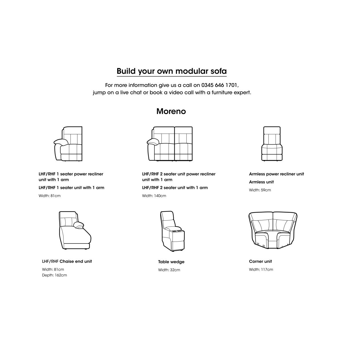 Great style is now available at a fantastic price with the stylishly modern Moreno. This amazingly comfortable, luxurious range is upholstered in either 100% premium leather or soft to the touch woven fabric. Stitched back detailing ensures the lumbar comfort sits perfectly at the base of your back. You also have the choice of space saving 'wall away' manual reclining actions or power reclining at the push of a button. Enjoy the support and comfort of higher density foam interiors, no-sag spring suspension and stronger frames. This roomy corner sofa has everything you need to relax in style – from power recliners and power headrests to gorgeous 100% leather upholstery. Incredible value too. Why you'll love it Modern designer style, amazing comfort, incredible price. With power recliners and power headrests, this corner sofa is the ultimate in relaxation. Supportive high back, cushioned headrests and superb lumbar support. With USB ports so you can charge your phone or tablet while you relax. In beautifully soft 100% leather upholstery with stylish stitching. Huge choice of colours. Only at Furniture Village. This leather power recliner corner sofa with power headrests is part of our World of Leather Moreno range. What you need to know Medium comfort level. Seat suspension: no-sag springs. Seat cushioning: higher density foam with fibre. Back support: spring. Back cushioning: fibre. Arm cushioning: fibre. To maintain cushion fullness, be sure to plump head, lumbar and arm areas daily. Please allow time for new recliners to ease. Minor gaps are necessary to ensure ease of recliner motion and may be exaggerated depending on floor type. Leather has unique marks and characteristics with variation in colour and texture. Leather softens with use. Smoothing the tops of leather cushions prevents signs of visual comfort. Deal with any spills promptly. Professional cleaning advised for oil- and grease-based stains. Please read our upholstery care guide for more advice.